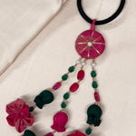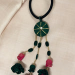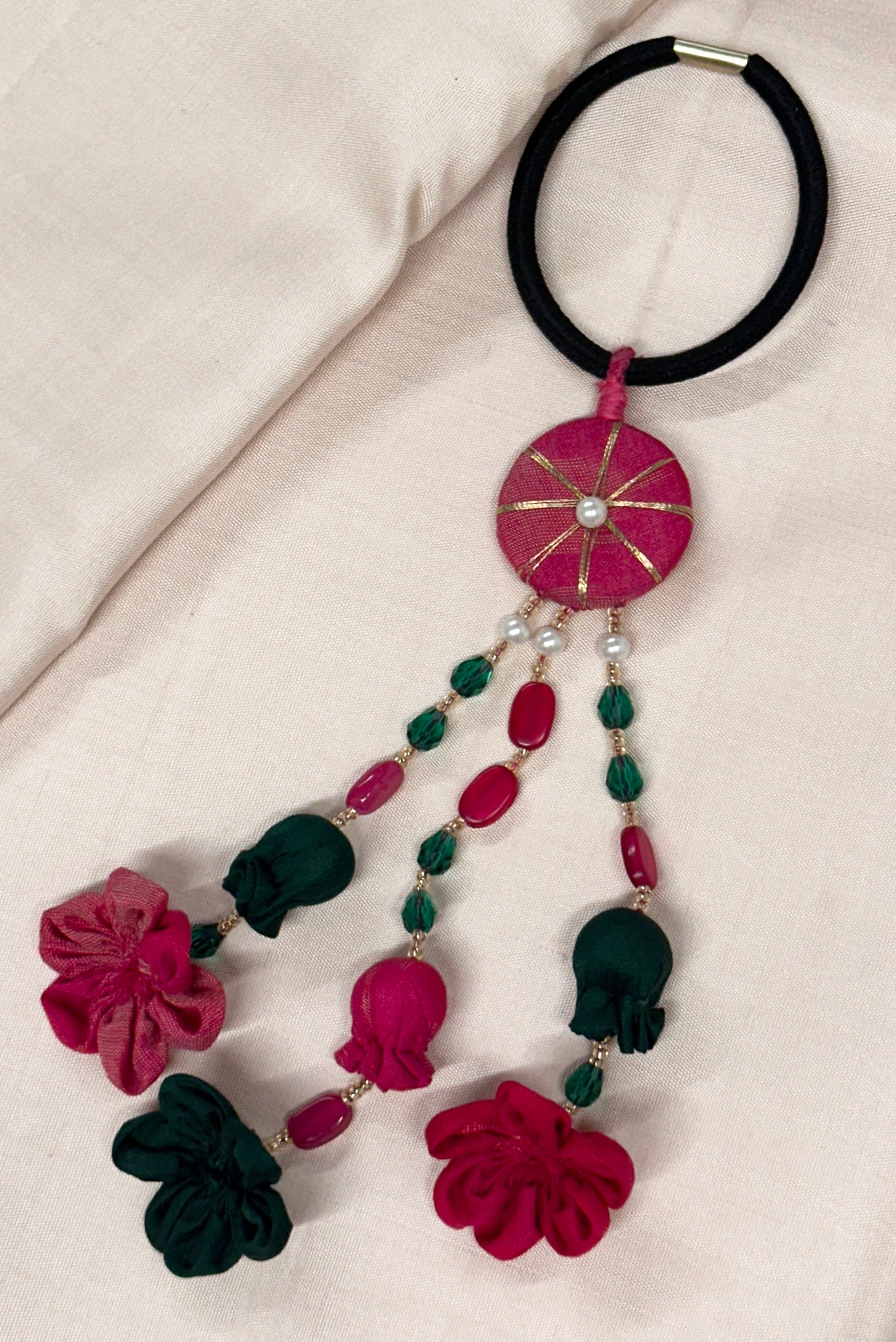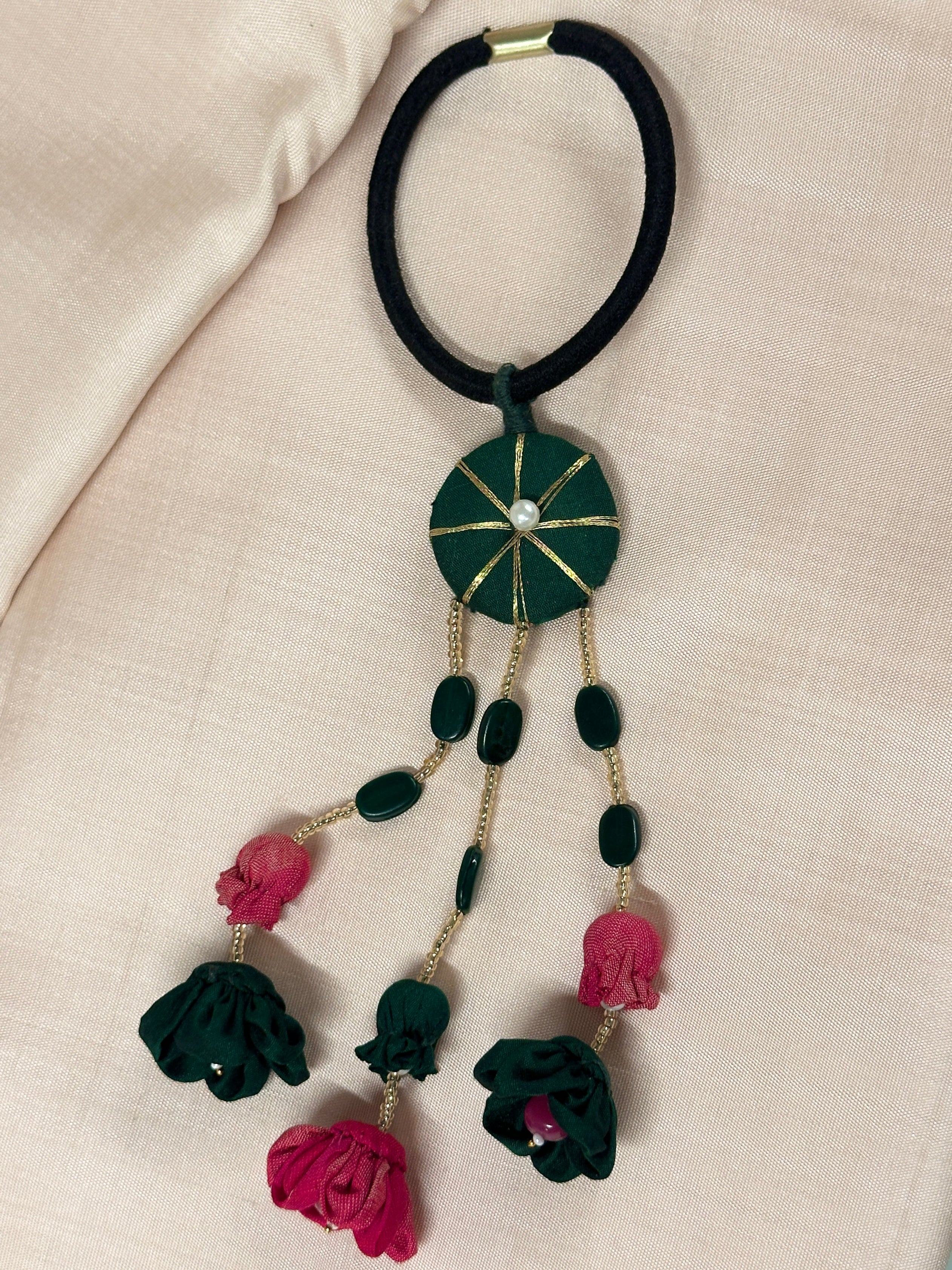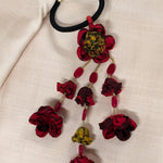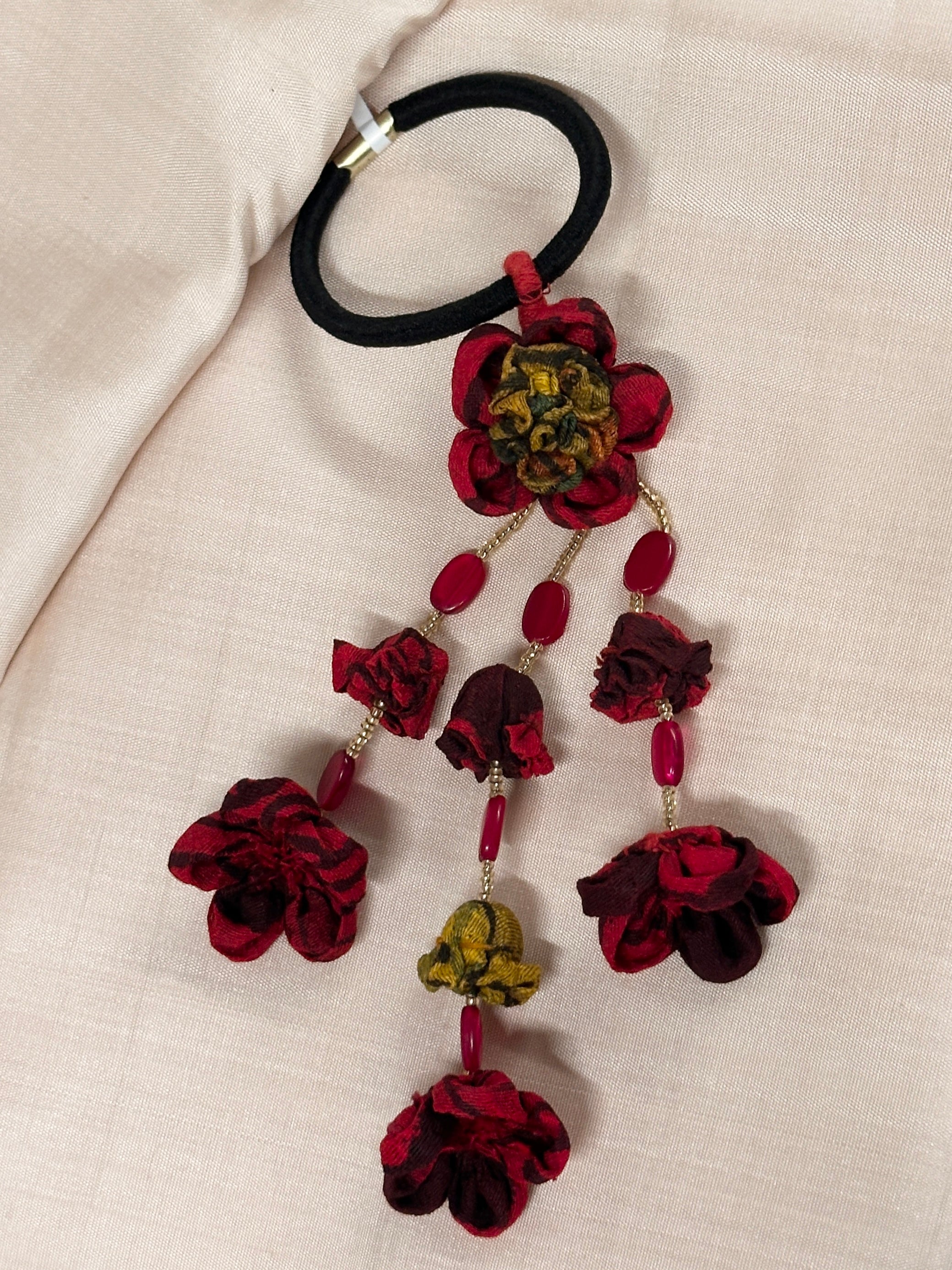 Handmade embroidery bands with long hanging fabric flowers.
