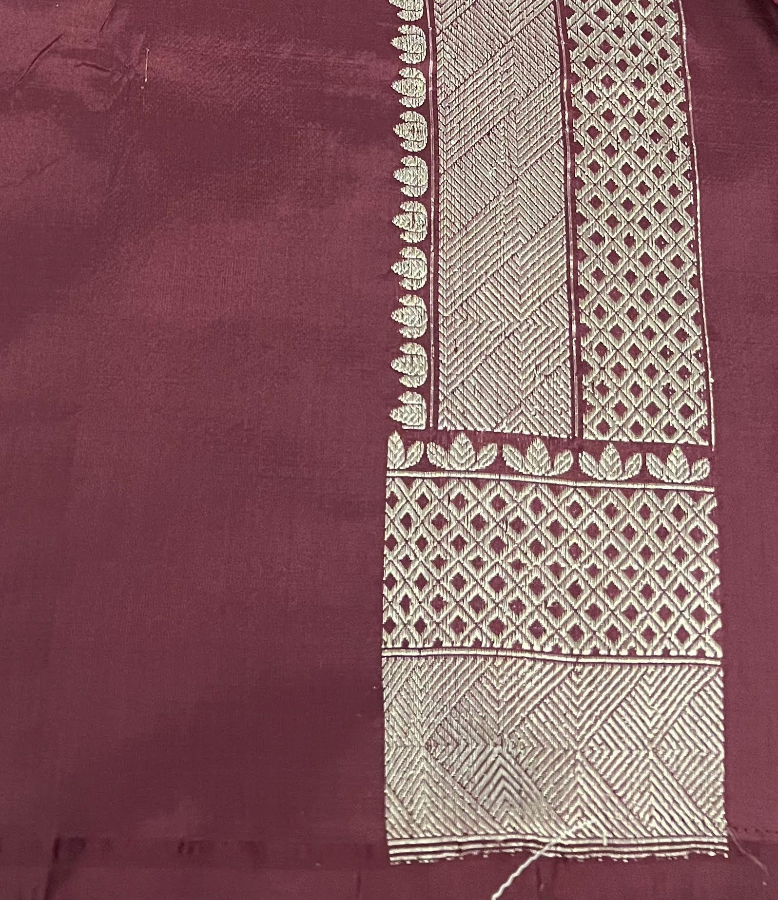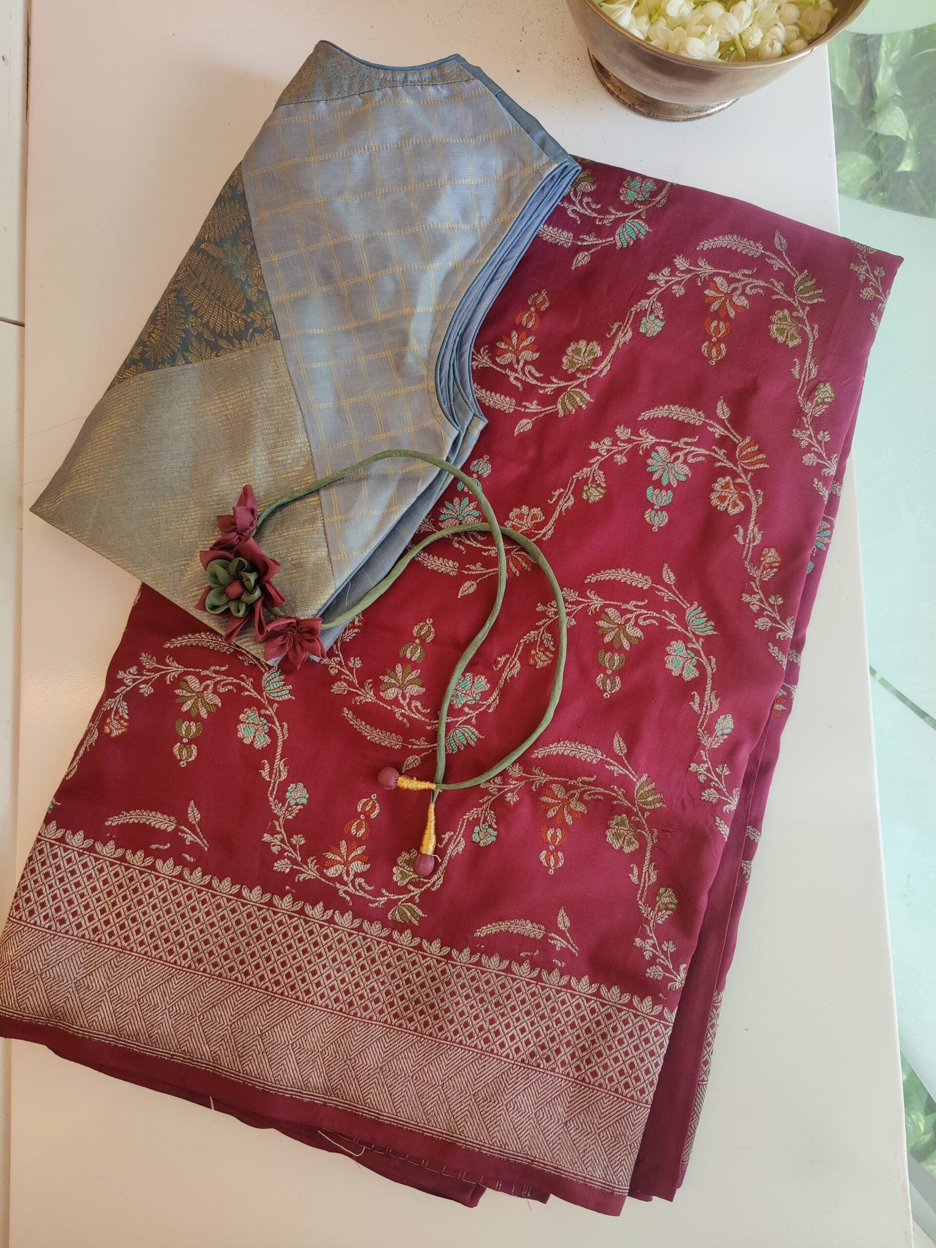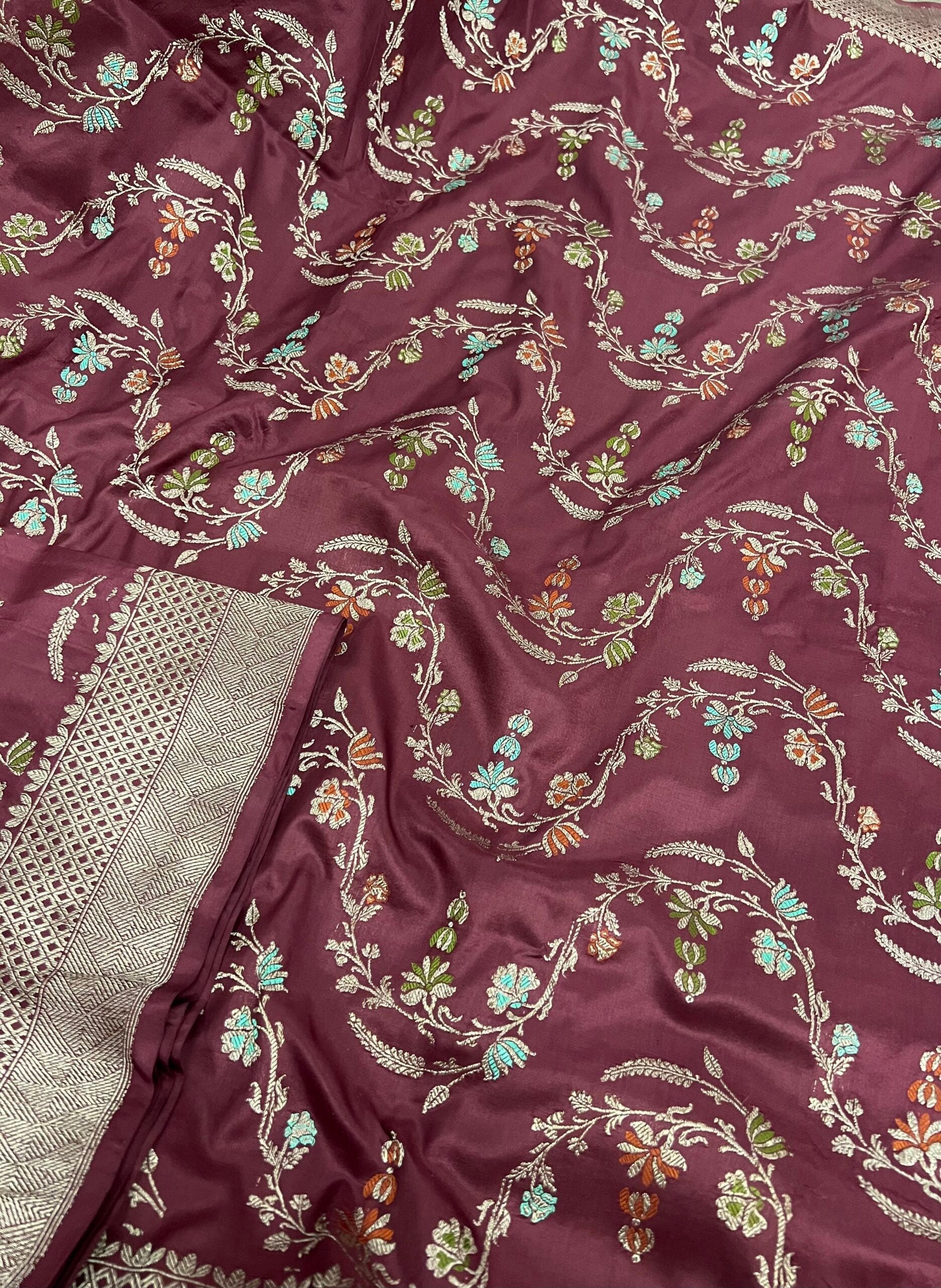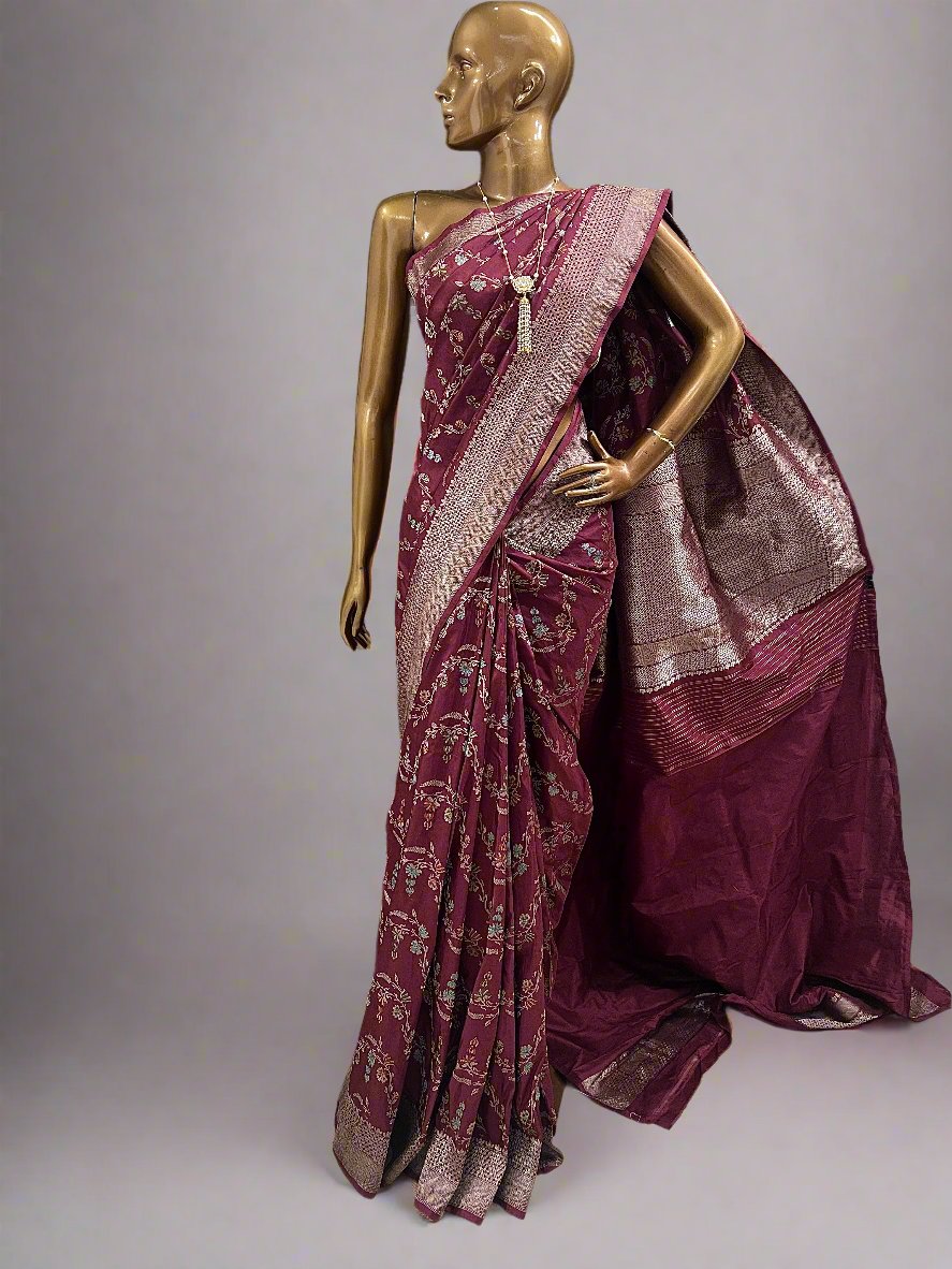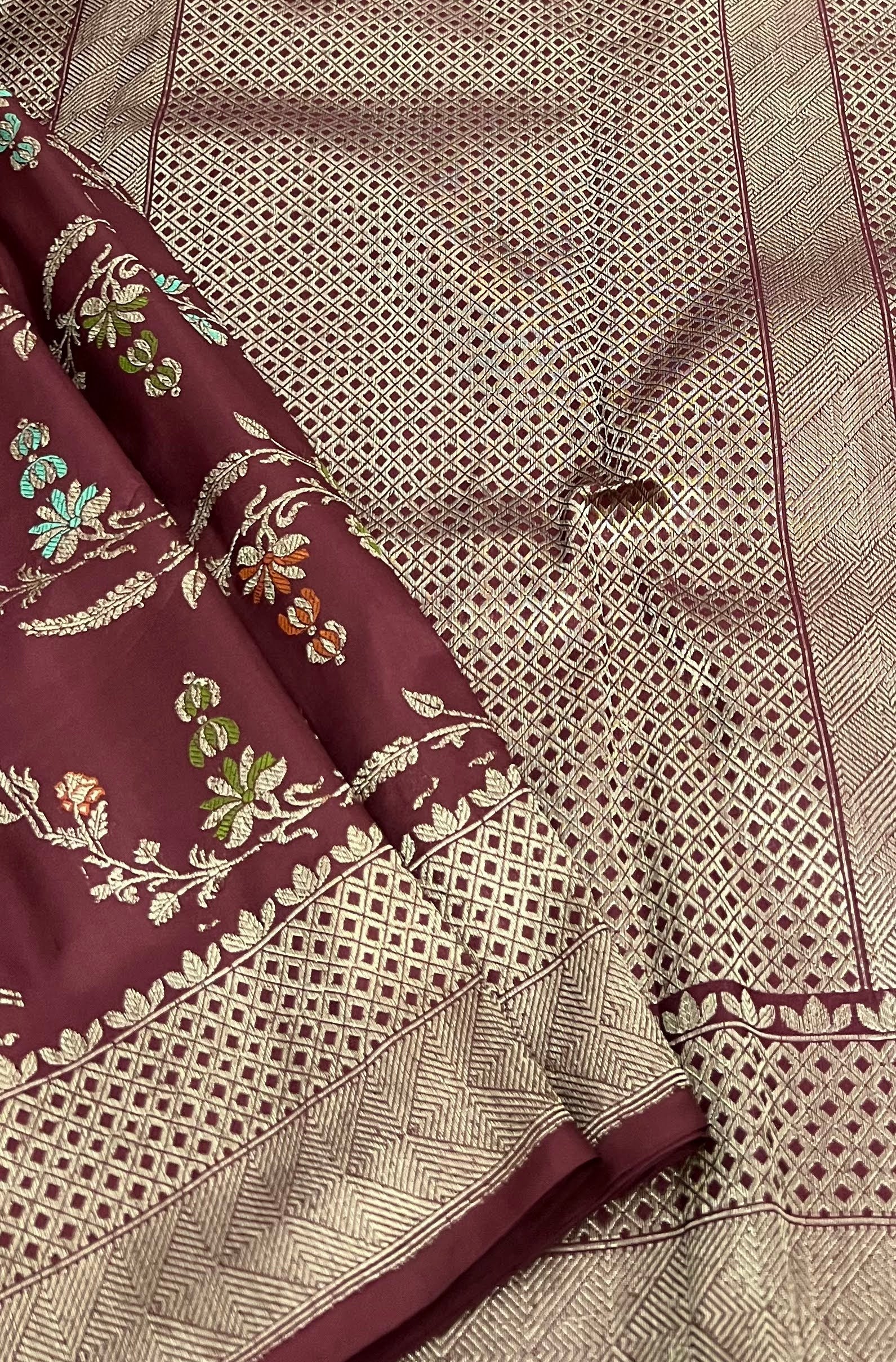 Dark brown handwoven pure silk saree with multicolour floral design along with gold zari all over the body in Benaras weave. The border of the saree is woven in dark brown with geometric patterns in gold zari. The pallu of the saree geometric patterns in gold zari on dark brown. Blouse : Dark brown silk with gold zari border It can be paired with any silver jewelry and ready to wear blouse to add more shine and colour and the same can be purchased from the Accessories and Ready to wear section respectively. Note : The tailored blouse featured is only for reference.