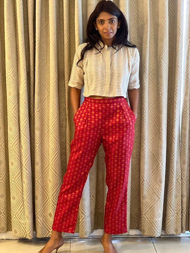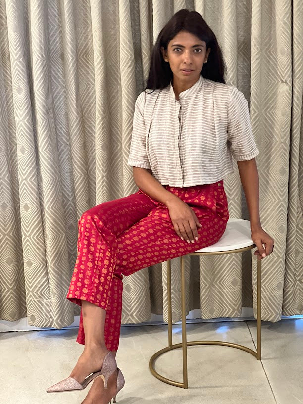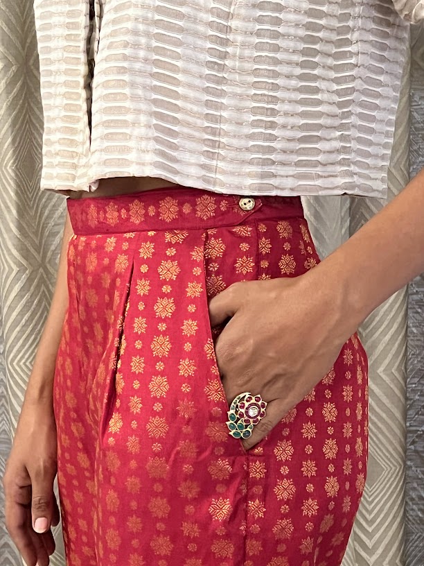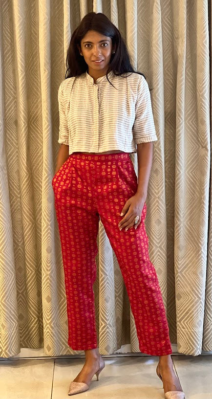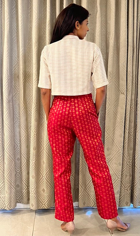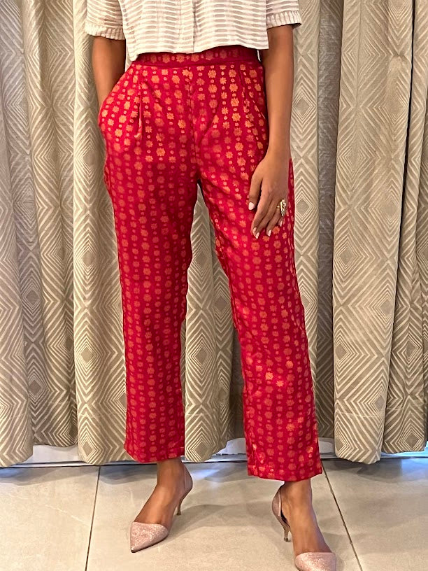 A stylish high waisted kanchipuram silk zari brocade pants in blood redThe product is available only online and can also be customized and a lead time of 7 to 10 days as all outfits are made on orderPant length - 40"The model is 5'7" and she is wearing an XS size