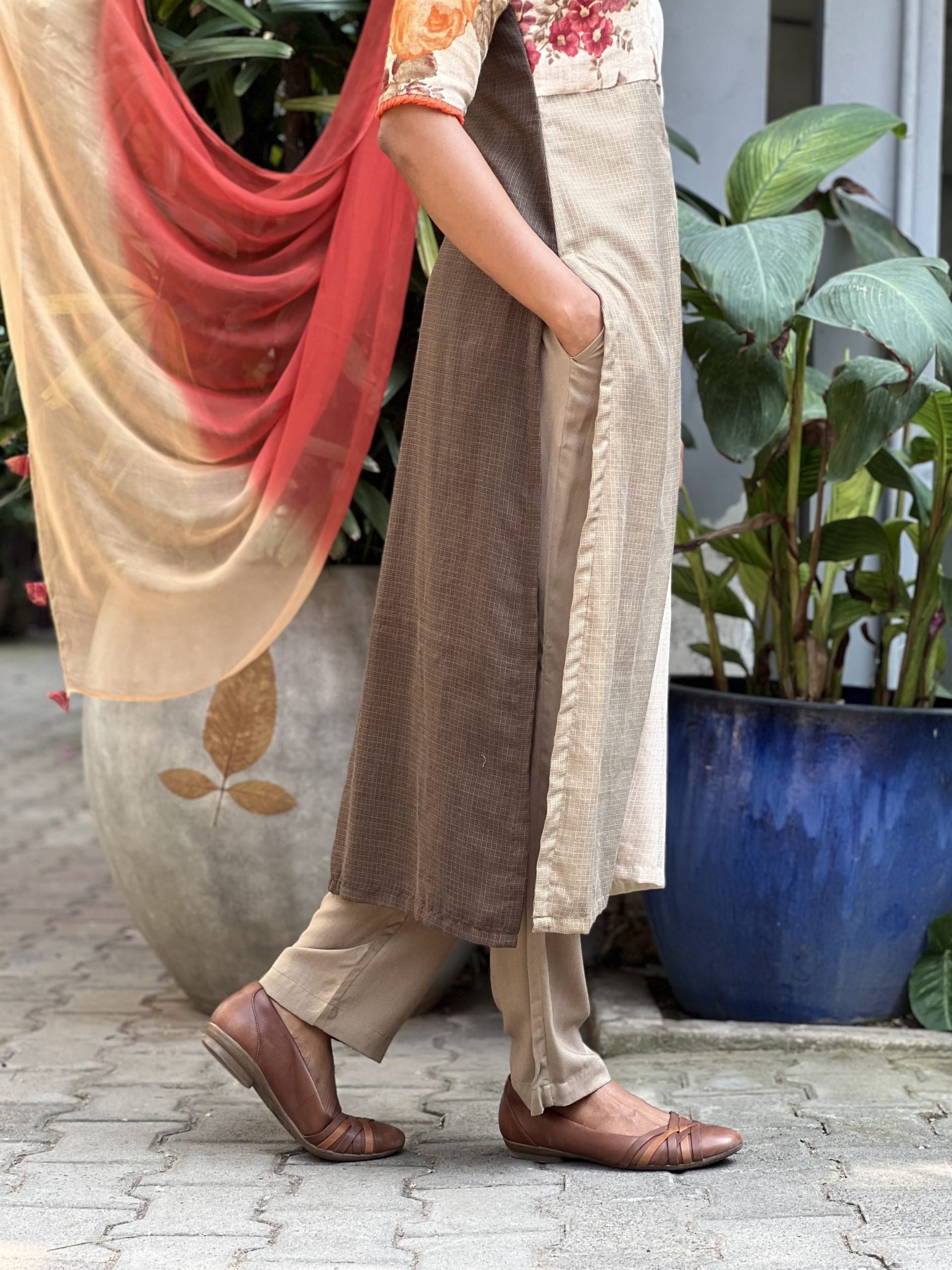 Brown soft cotton straight pants with elastic at the back and band and drawstring at the front with side pockets.