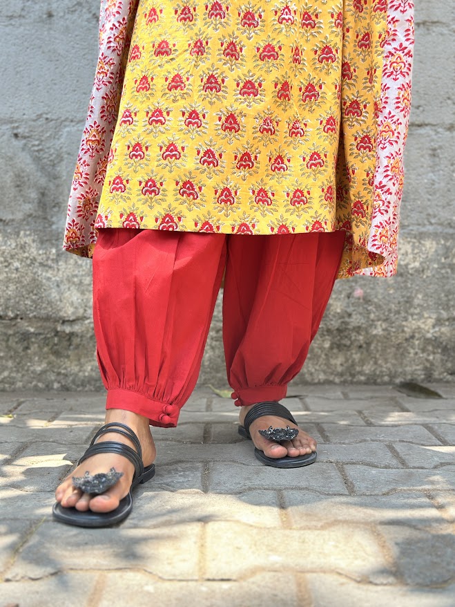 Zephyr Red cotton pants - As summer sizzles in the tropics, we've got your style and comfort covered. Introducing our chic and contemporary cotton redpants with playful button down detailing along the edges. Stay cool and stylish all season long with this must have and explore its versatality by pairing it with kurtas and shirts from your own collection or with our matching shirt or kurta for some coord inspirations. To view more outfits in cottons likeZephyr Red cotton pants , click onhttps://aavaranaa.com/cotton-ready-to-wear-outfits/ Print medium has been one of our favorite way to embellish sarees & yardages. Over the years we have dabbled in bagh, bagru, dabu, ajrak, sanganeri, discharge & screen prints. We have consciously worked with various hand-printed forms and we particularly love block prints. We work with both traditional motifs as well as contemporary prints. For instance, with our range of silk and Madras Margarita, we have experimented a fair bit with new age florals. We also like to revisit traditional bagru & dabu prints on our kotas and enhance them with our surface embellishments. Hand-prints are mixed with applique, embroidery & cutwork to further enhance the designs.