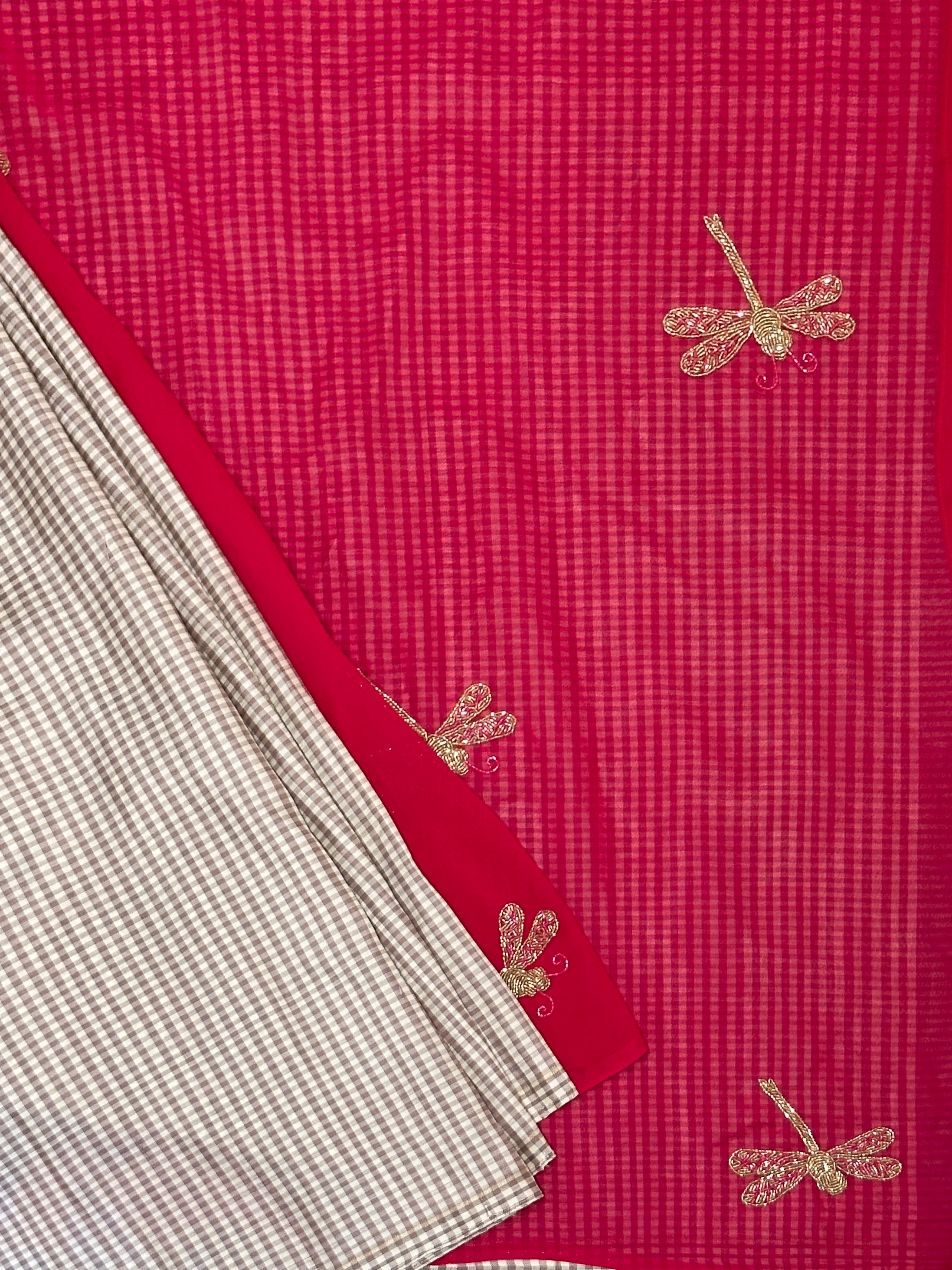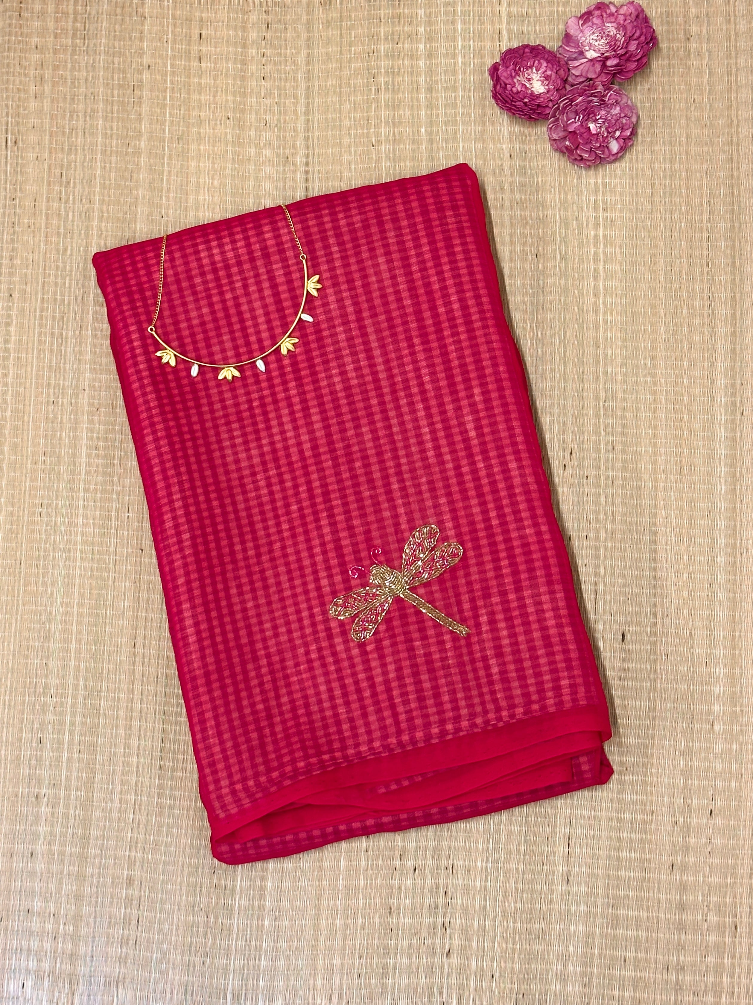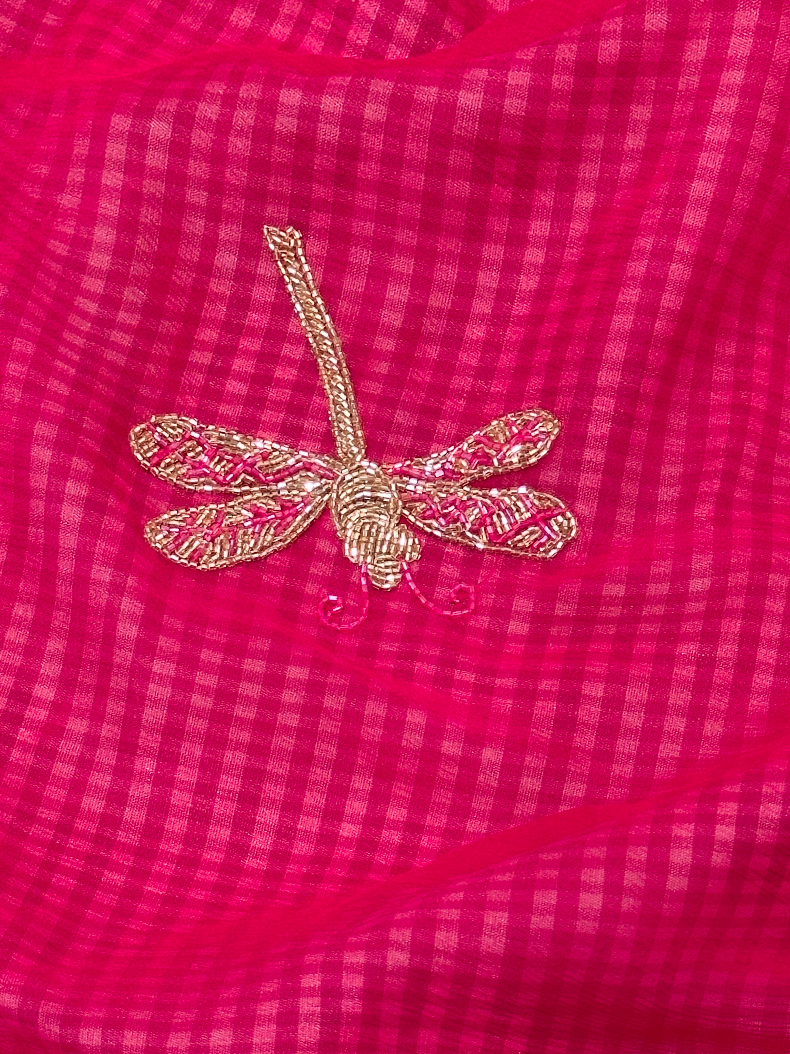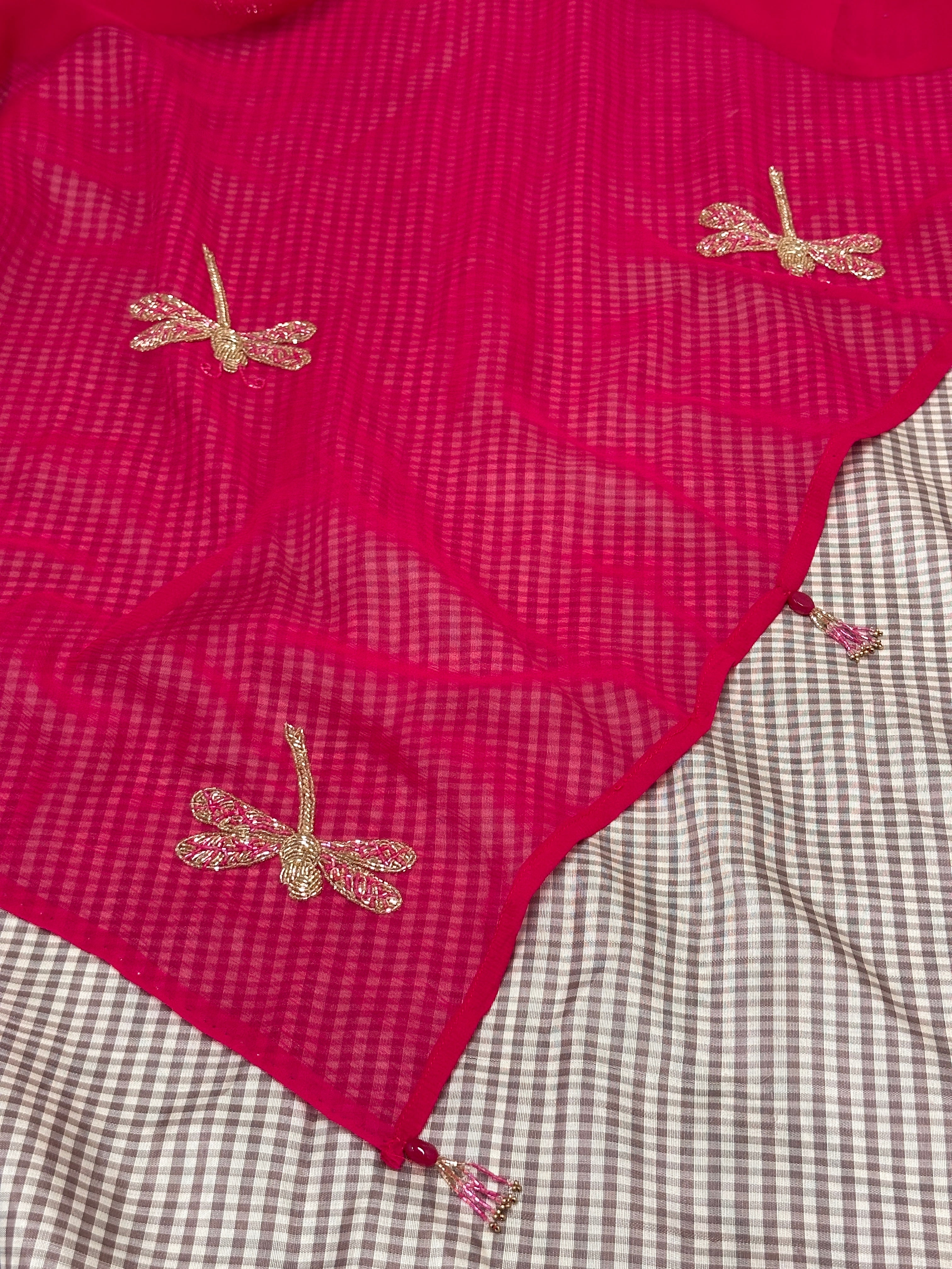 - The body has a unique embroidery features birds, butterflies that gives the saree a stunning and fresh look.