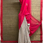 Half-and-half design featuring Chiffon and Kanchipuram silk in elegant colour. blocking.