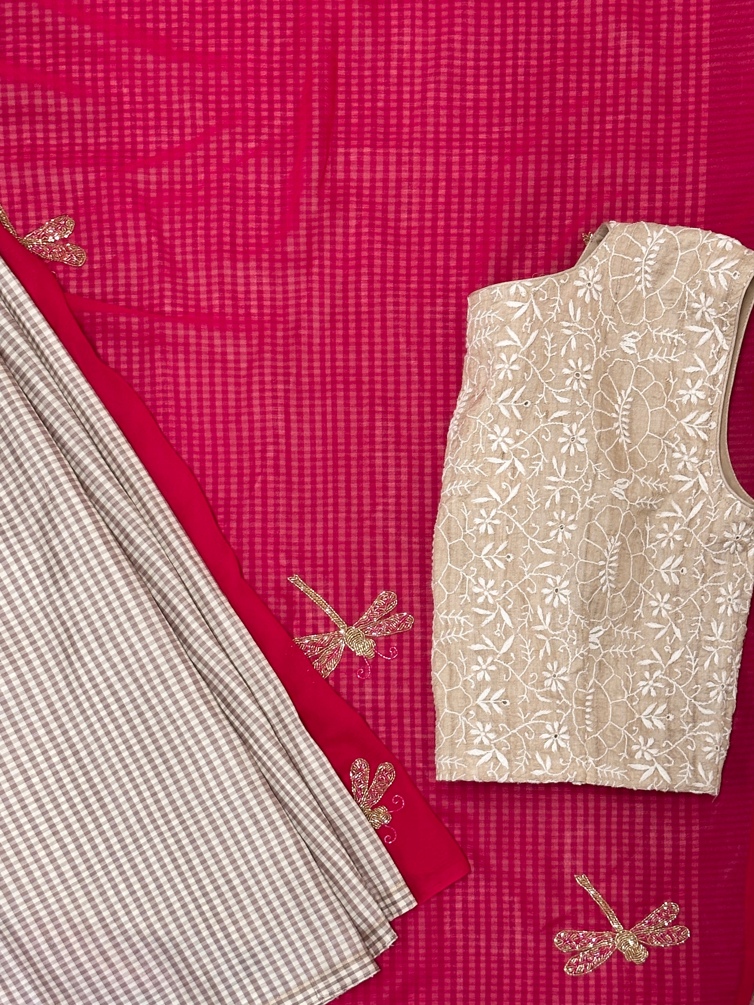 Comes with a contrast blouse piece adorned with subtle prints or embroideries according to the individual style.