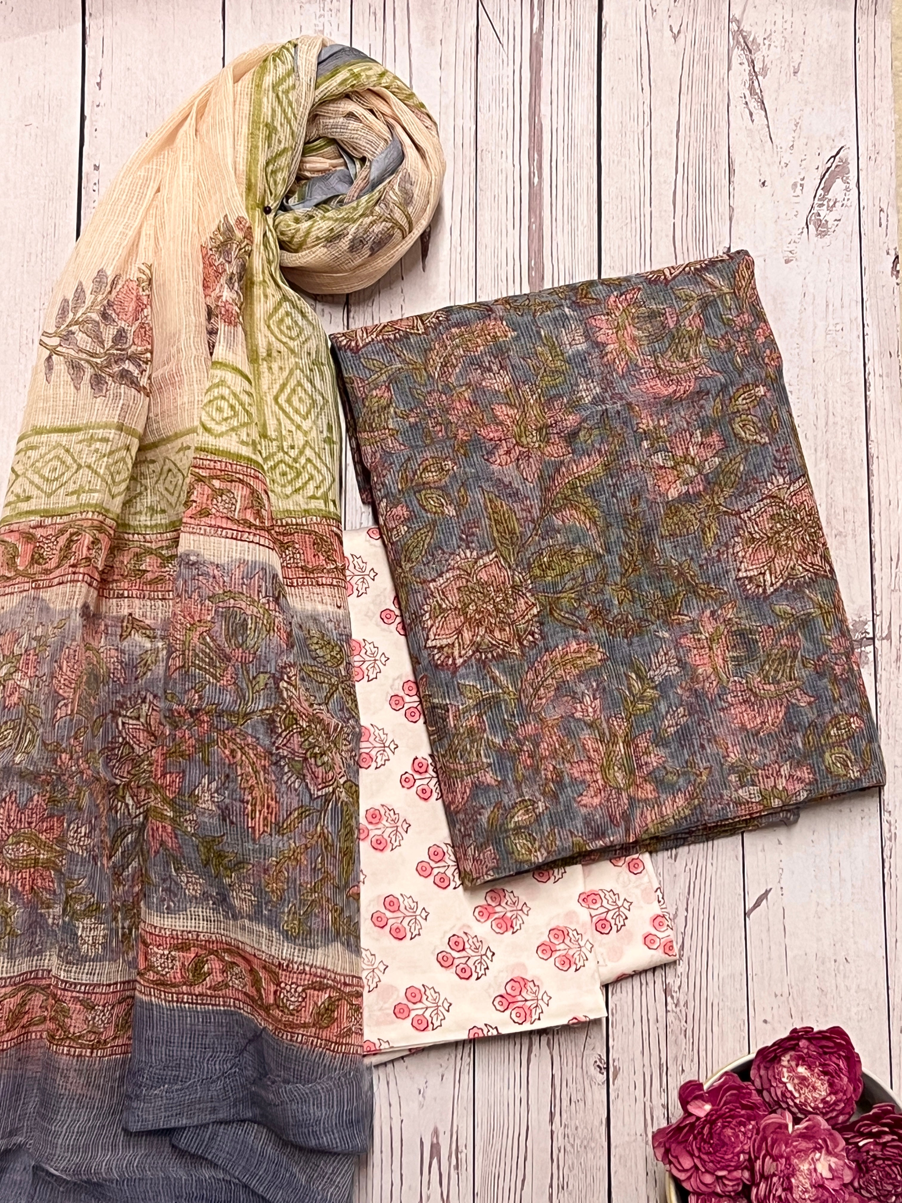 - 4 piece set, comes with a paired lining, printed cotton bottom fabric and kota doriya dupatta