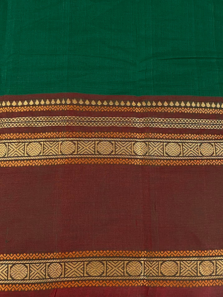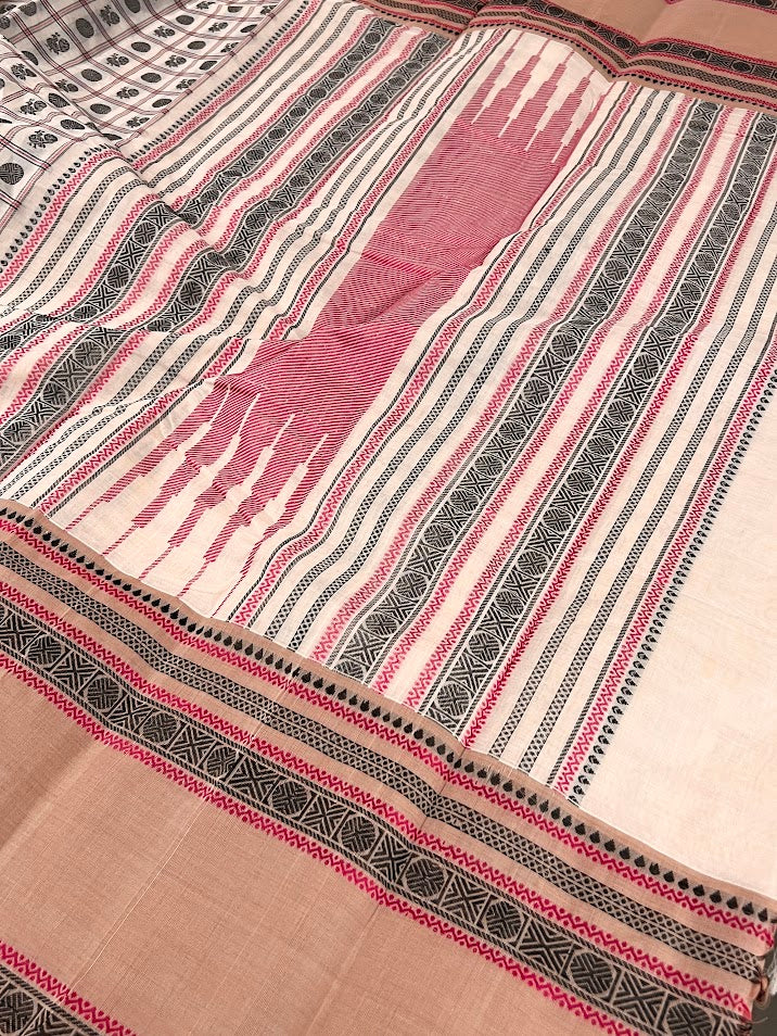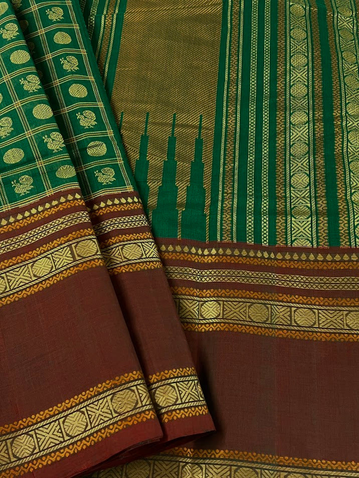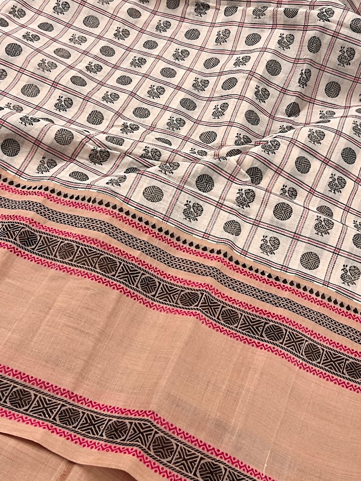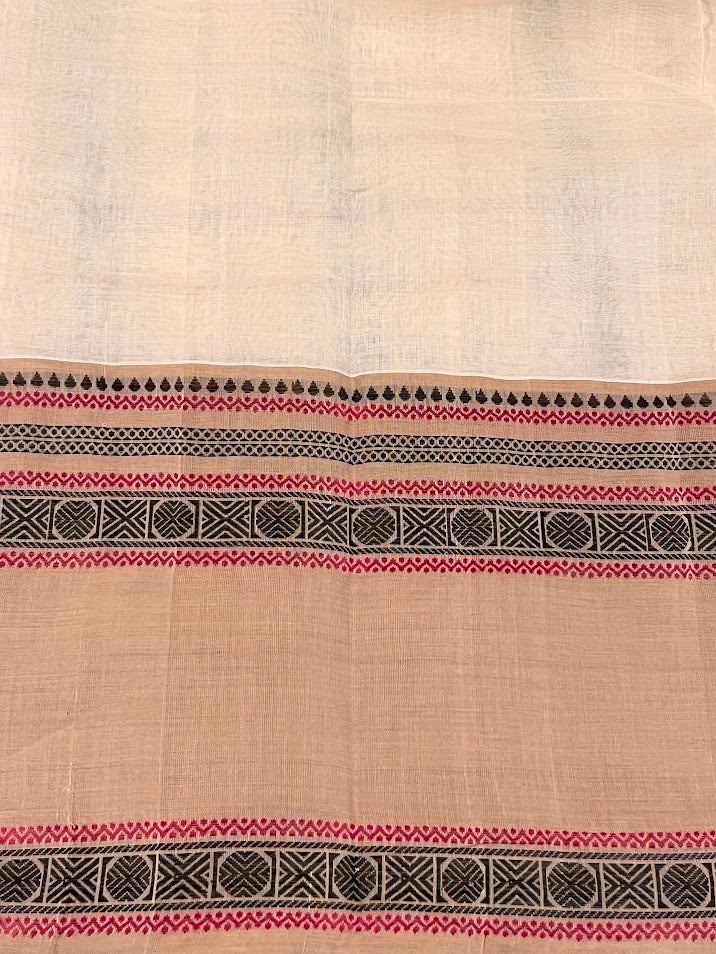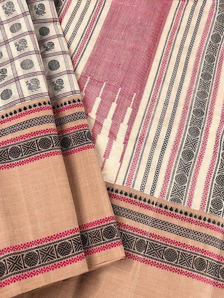 Woven with fine combed cotton yarns, it carries the breath of the artisan’s touch in every thread. Subtle motifs and borders reflect the region’s temple architecture and age-old symbolism—minimalist in style, but deeply rooted in soul.