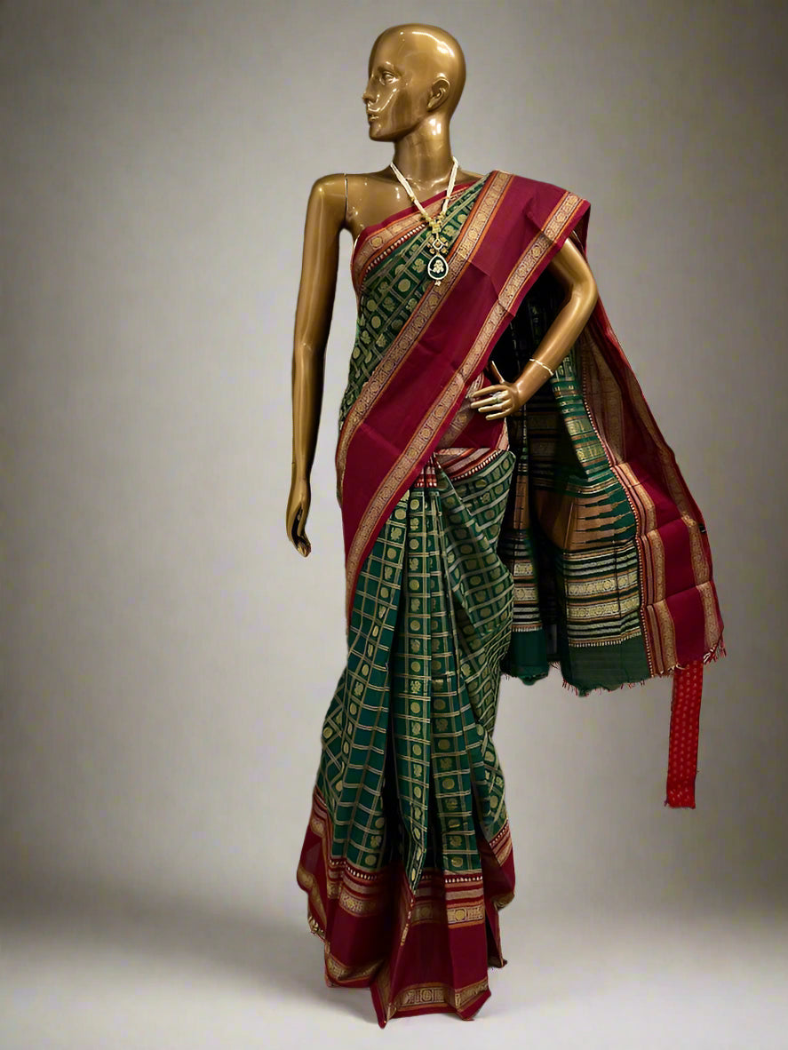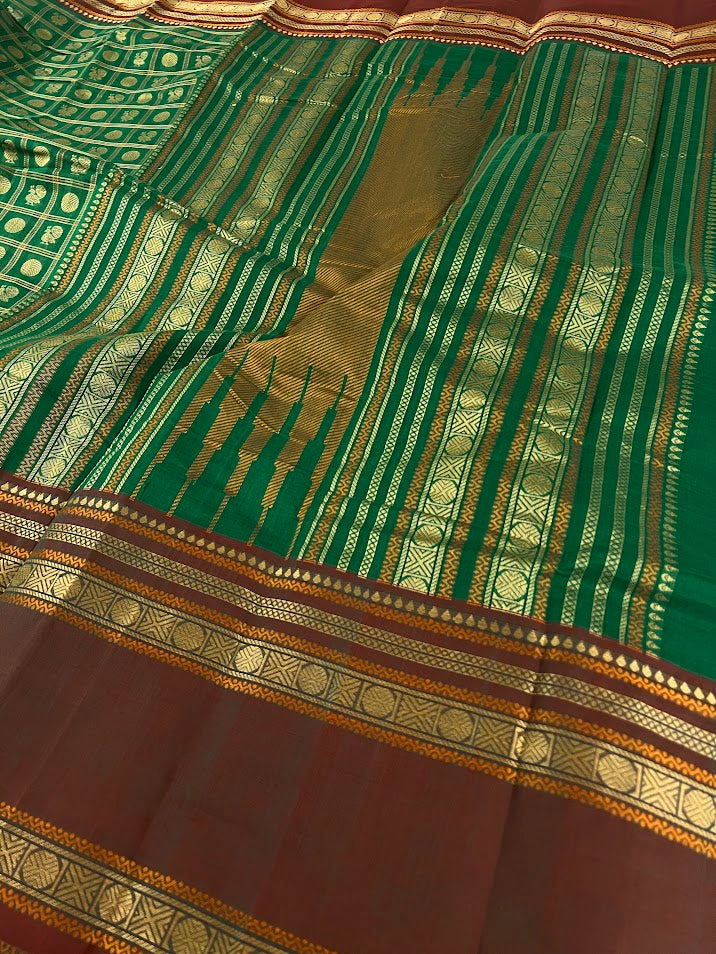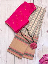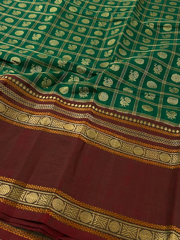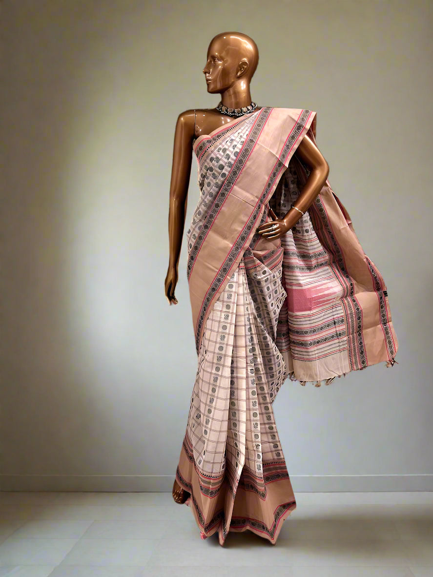 Woven with fine combed cotton yarns, it carries the breath of the artisan’s touch in every thread. Subtle motifs and borders reflect the region’s temple architecture and age-old symbolism—minimalist in style, but deeply rooted in soul.