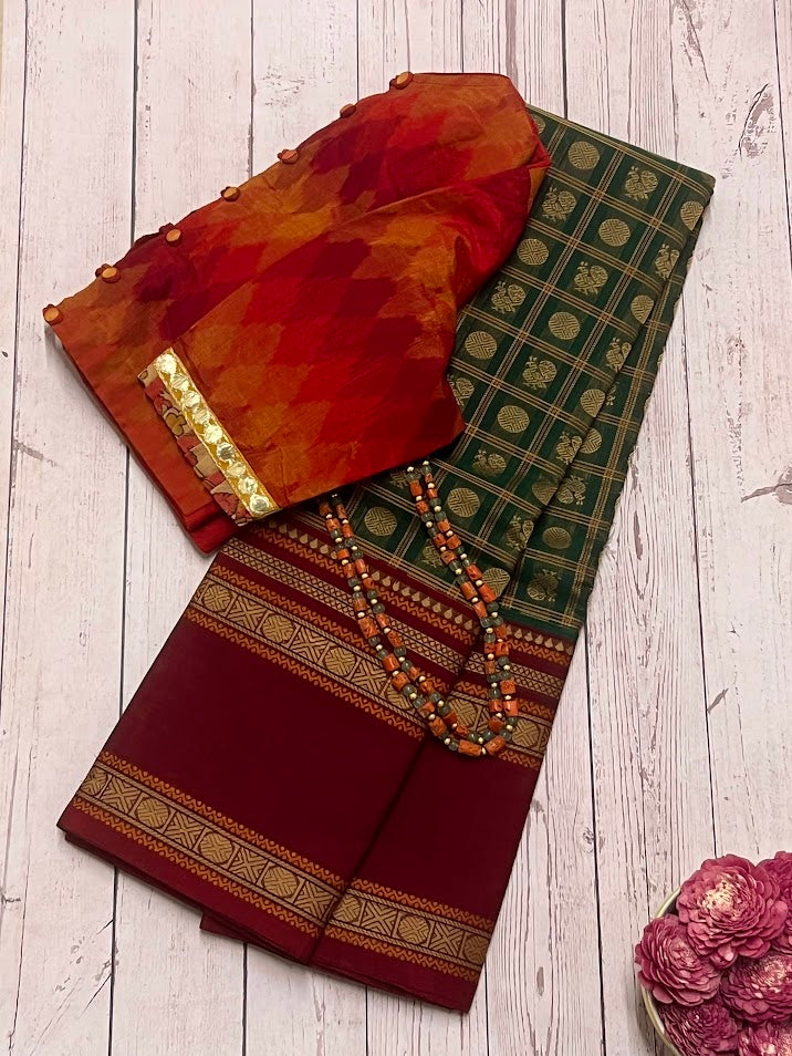 Wrap yourself in heritage with this handwoven Kanchi cotton sari—an ode to timeless craftsmanship from the looms of Tamil Nadu. Lightweight yet structured, this sari drapes with grace, making it a perfect companion for long workdays, cultural gatherings, or quiet evenings of reflection.