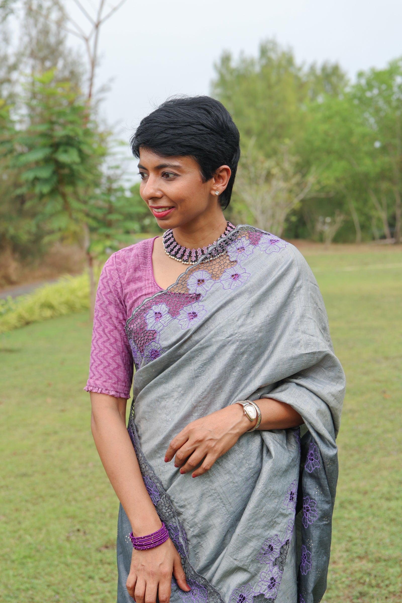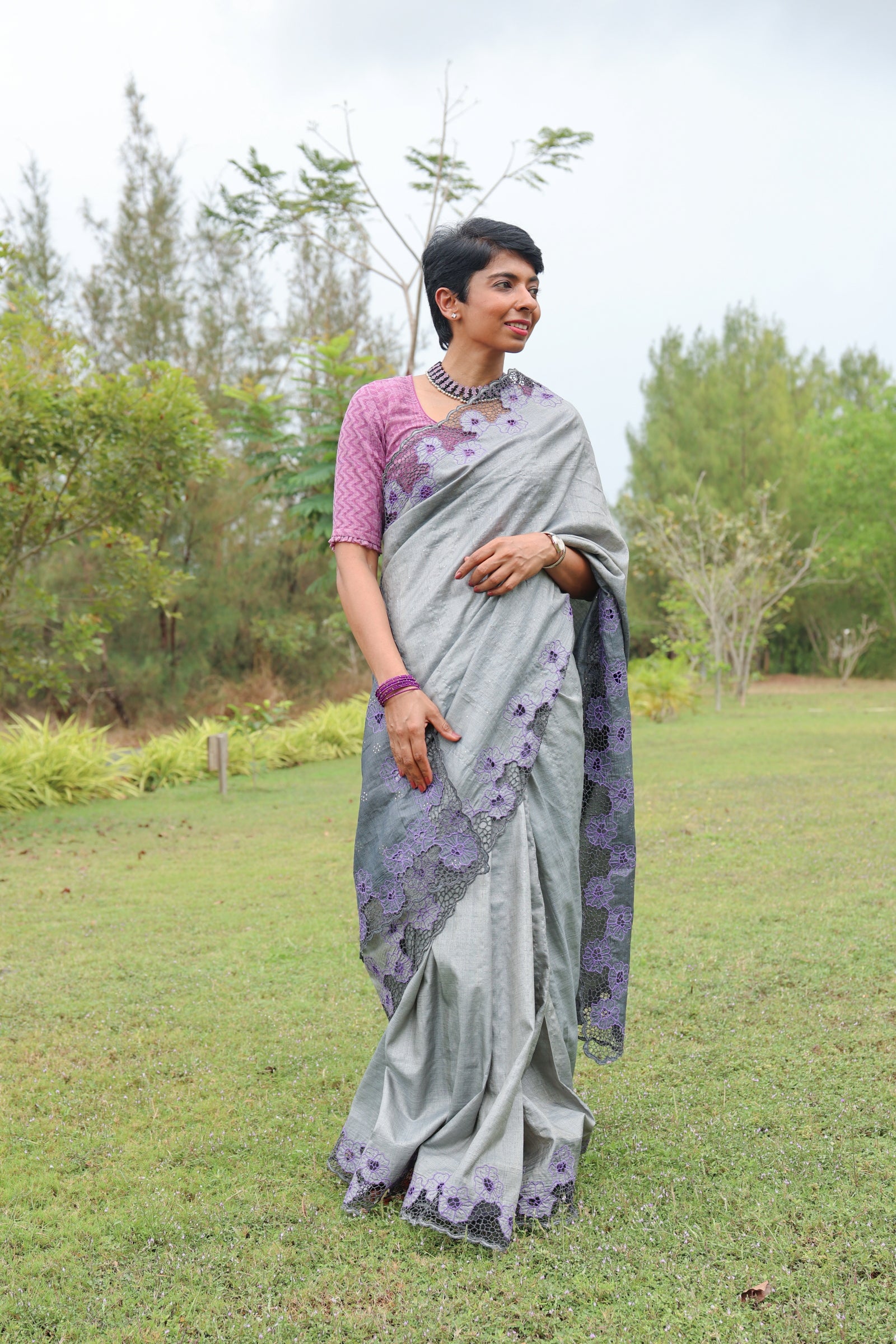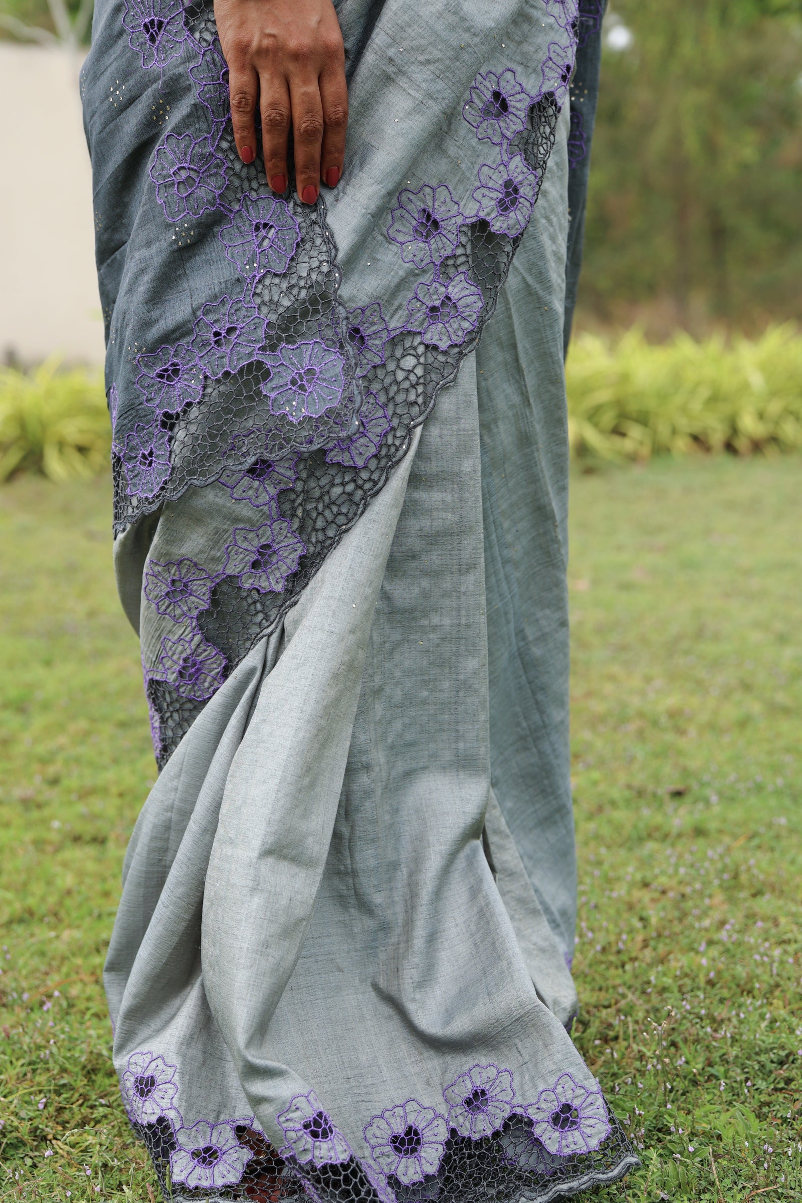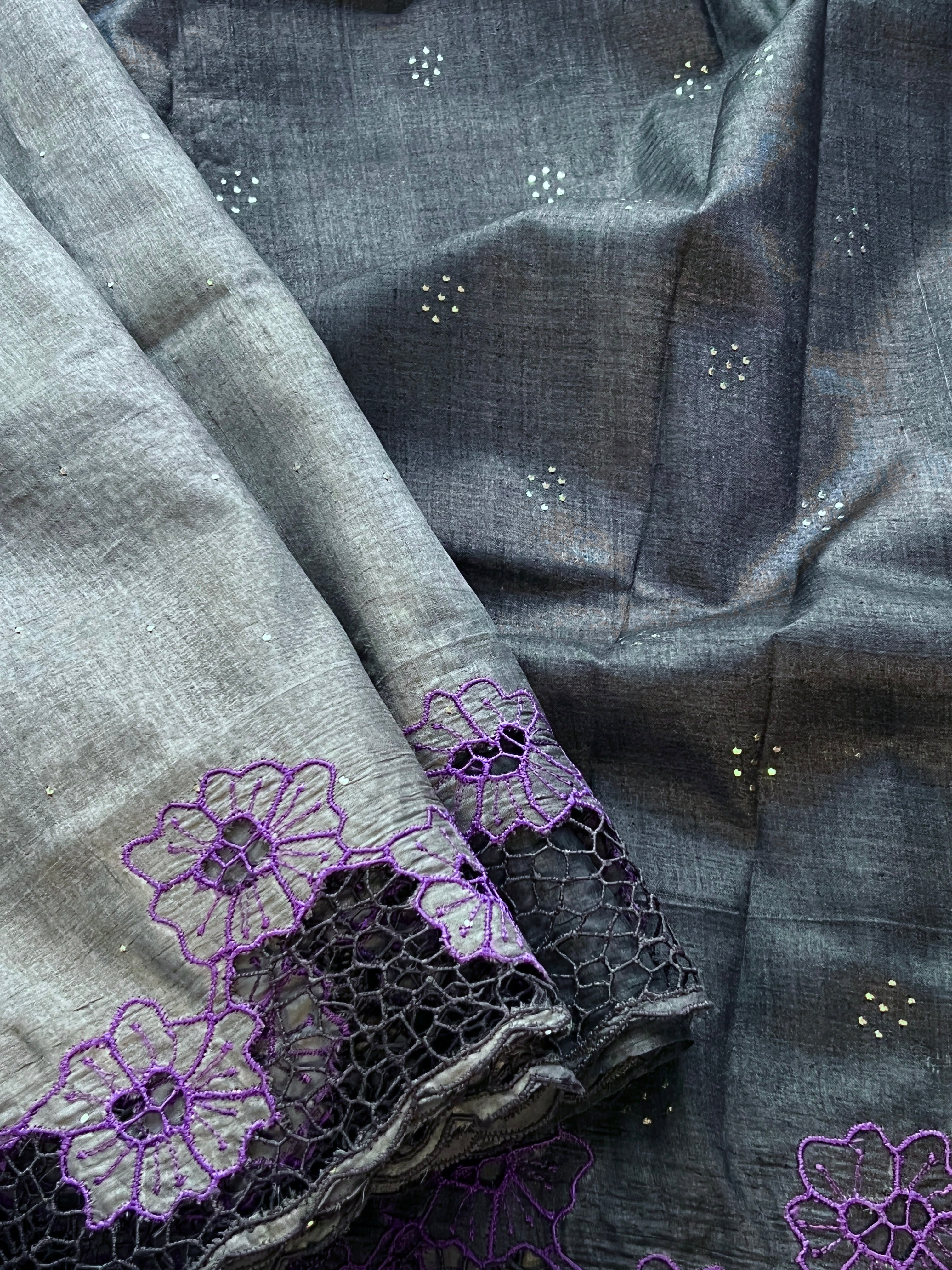 Grey tussar cutwork saree