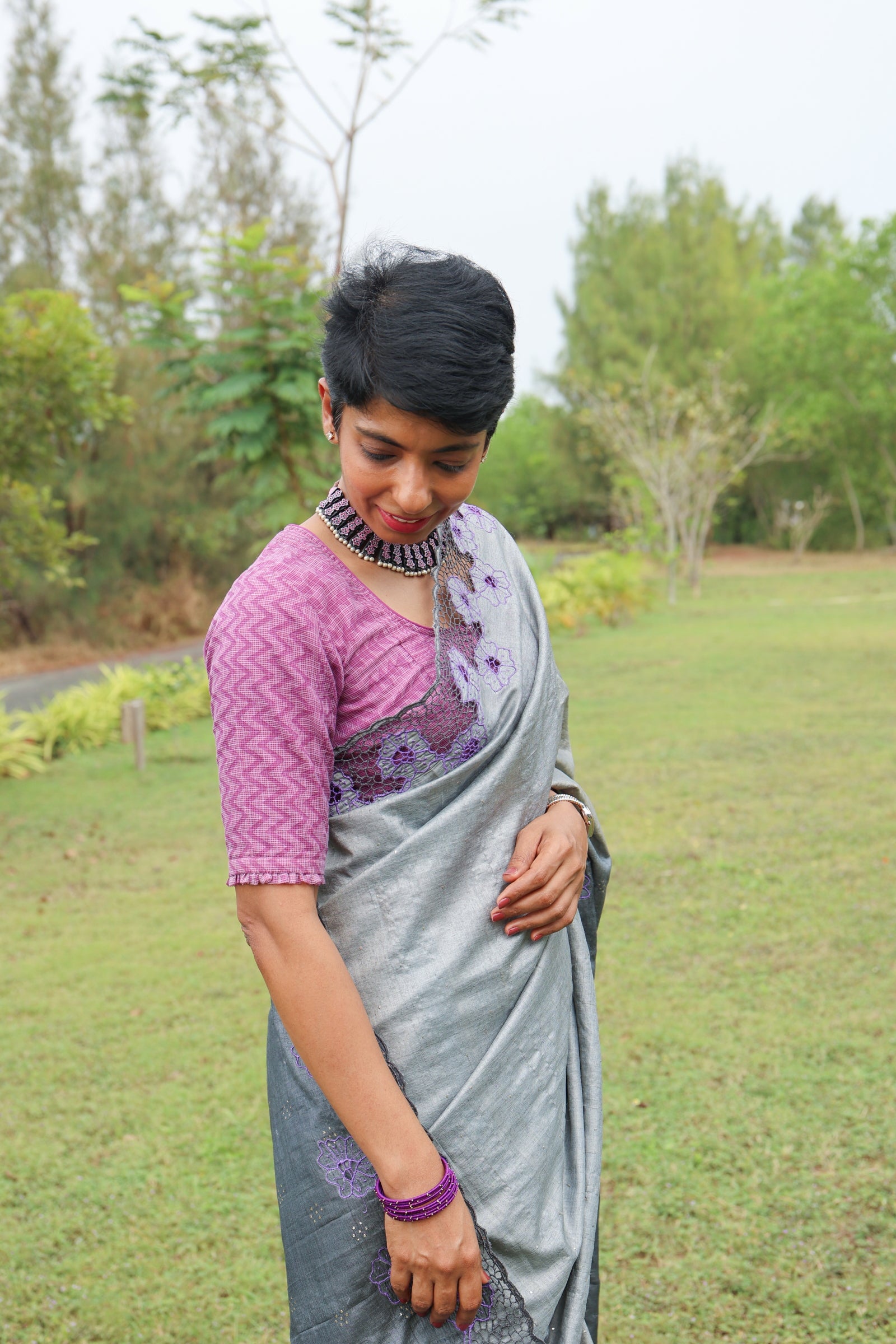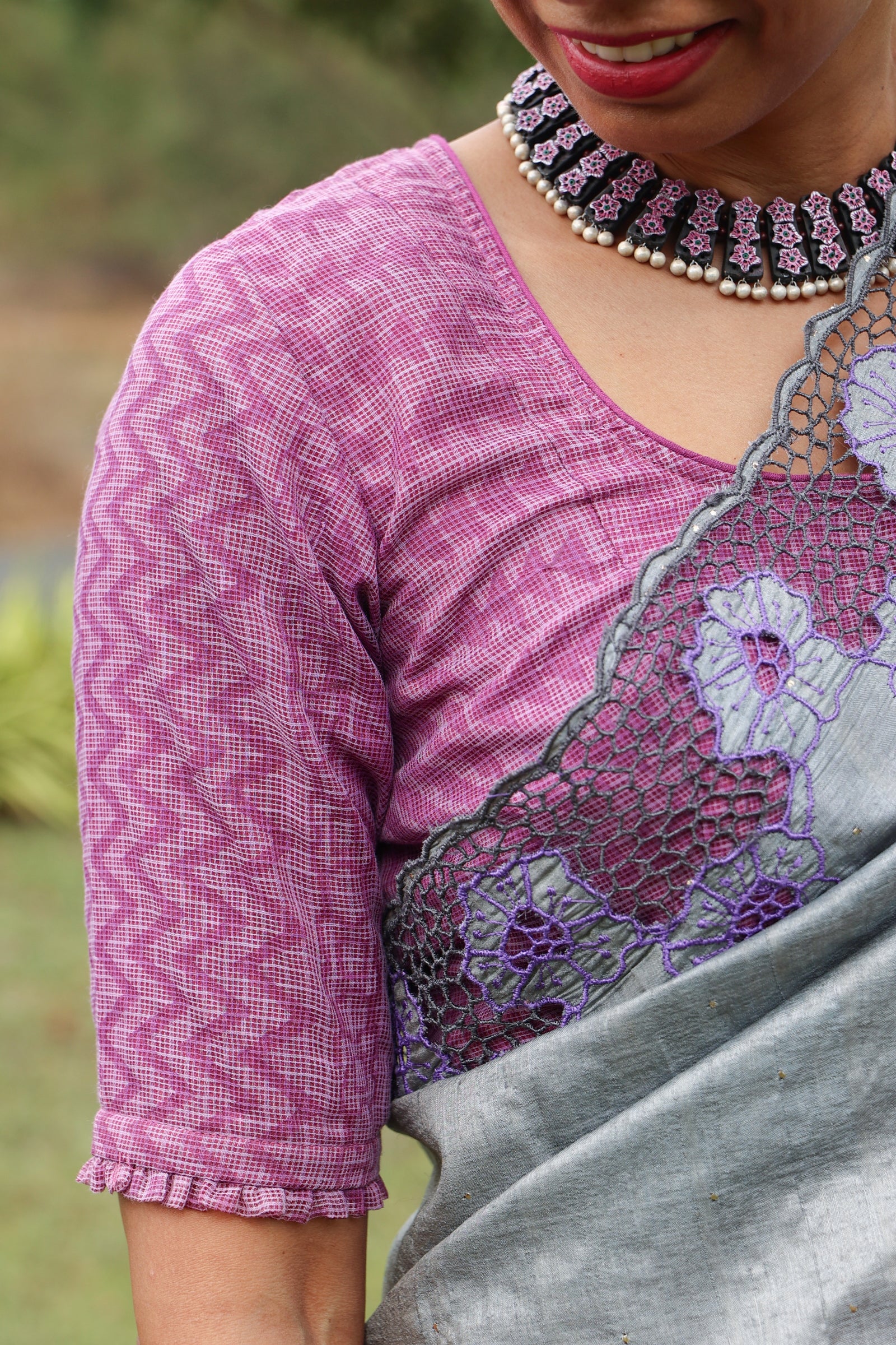- Contrast blouse with cutwork on sleeves