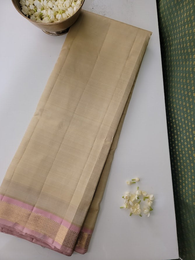 cream coloured pure kanchi silk veshti with pink borderThe length of the veshti is 3.75 metres and the width is 1.25 metresWe can also tailor the dhoti ,so that it can be worn readily. Please contact us for more clarification