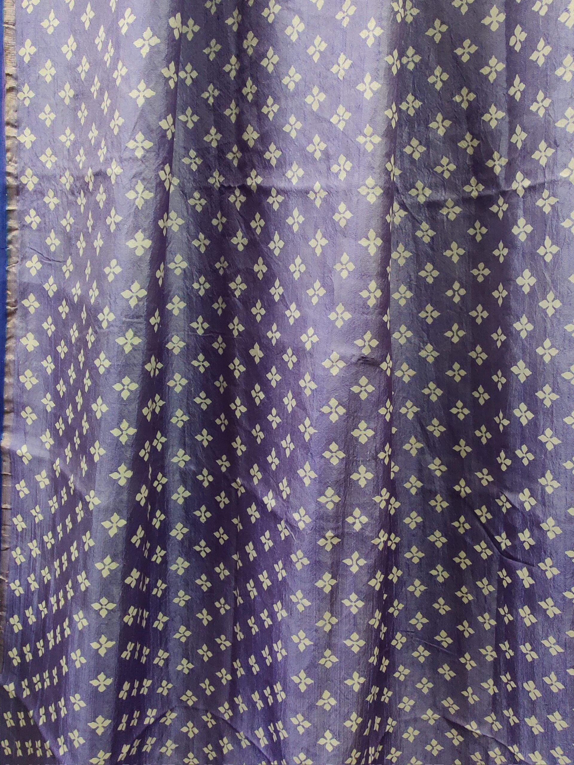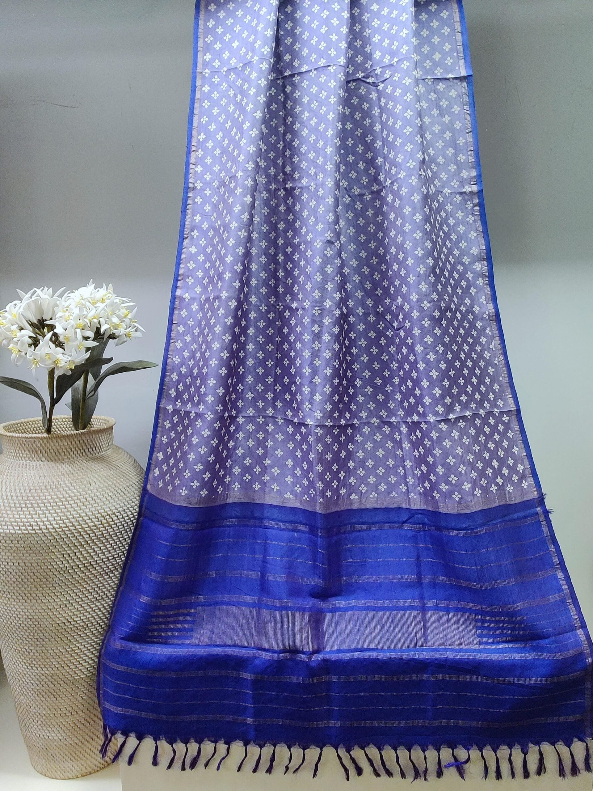 Lavender and indigo Kanchipuram silk dupatta with handblock print floral buttis all over the body with thin zari line as border with indigo selvedge. The pallu of the dupatta is woven in indigo with simple zari lines.