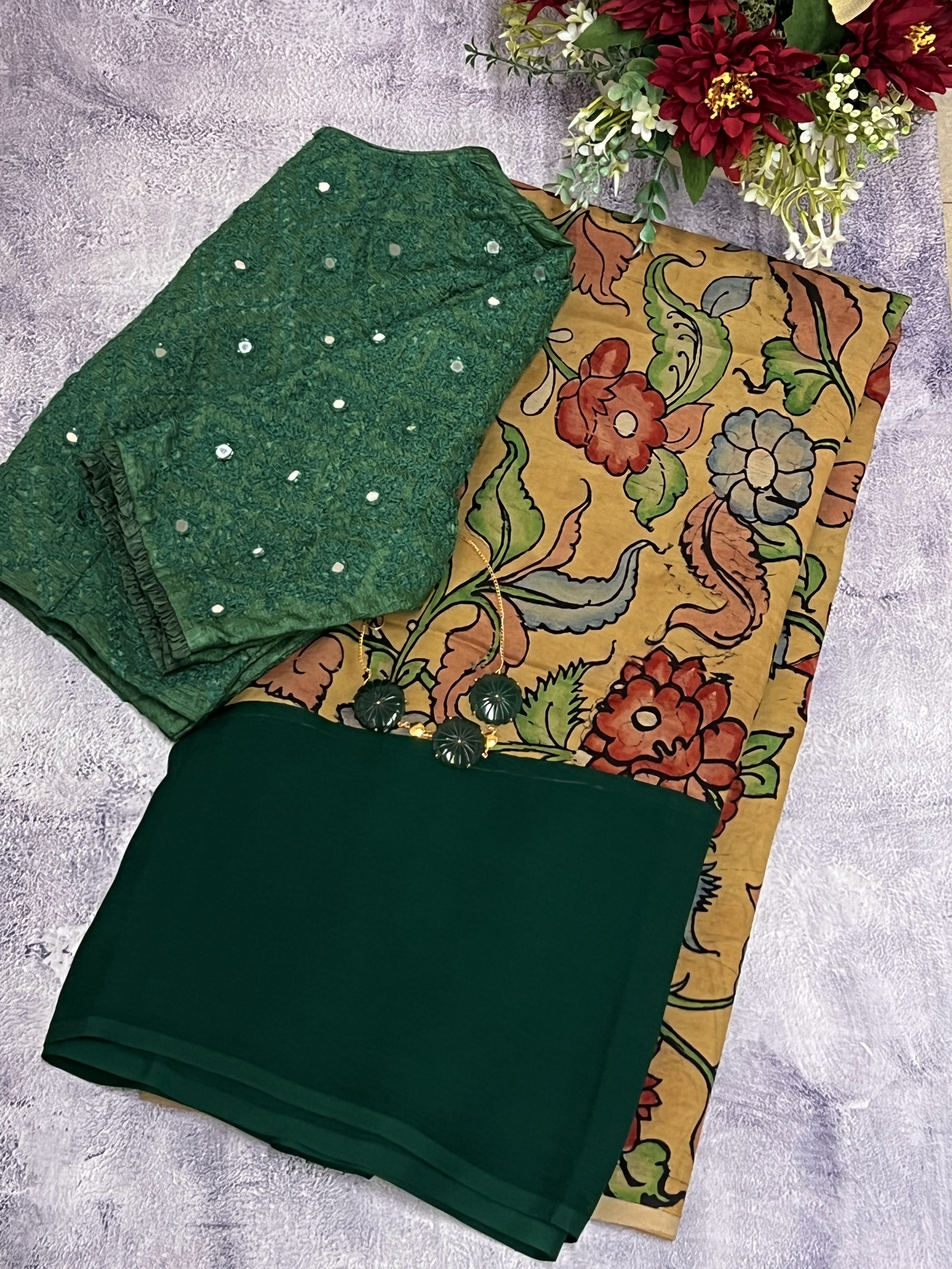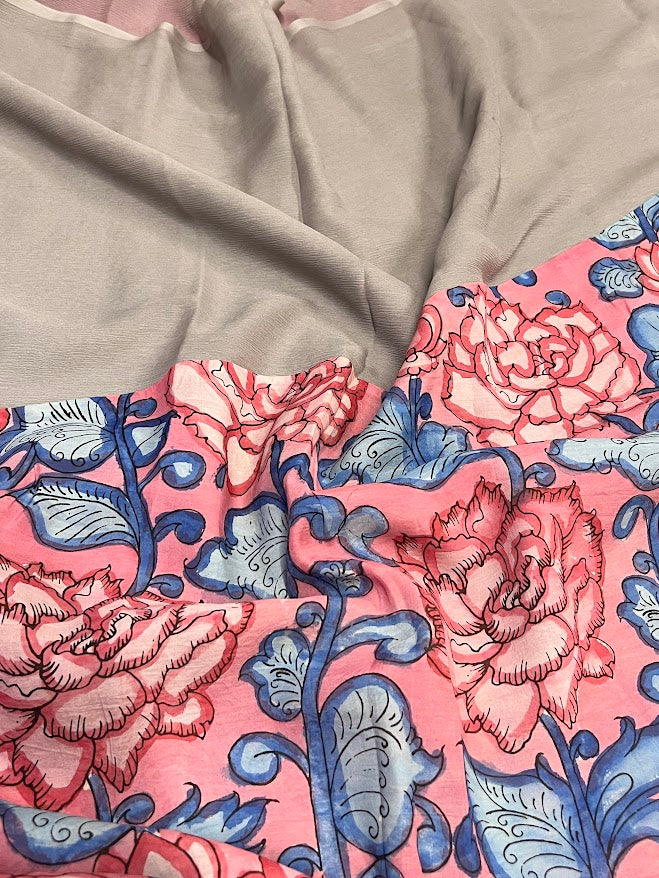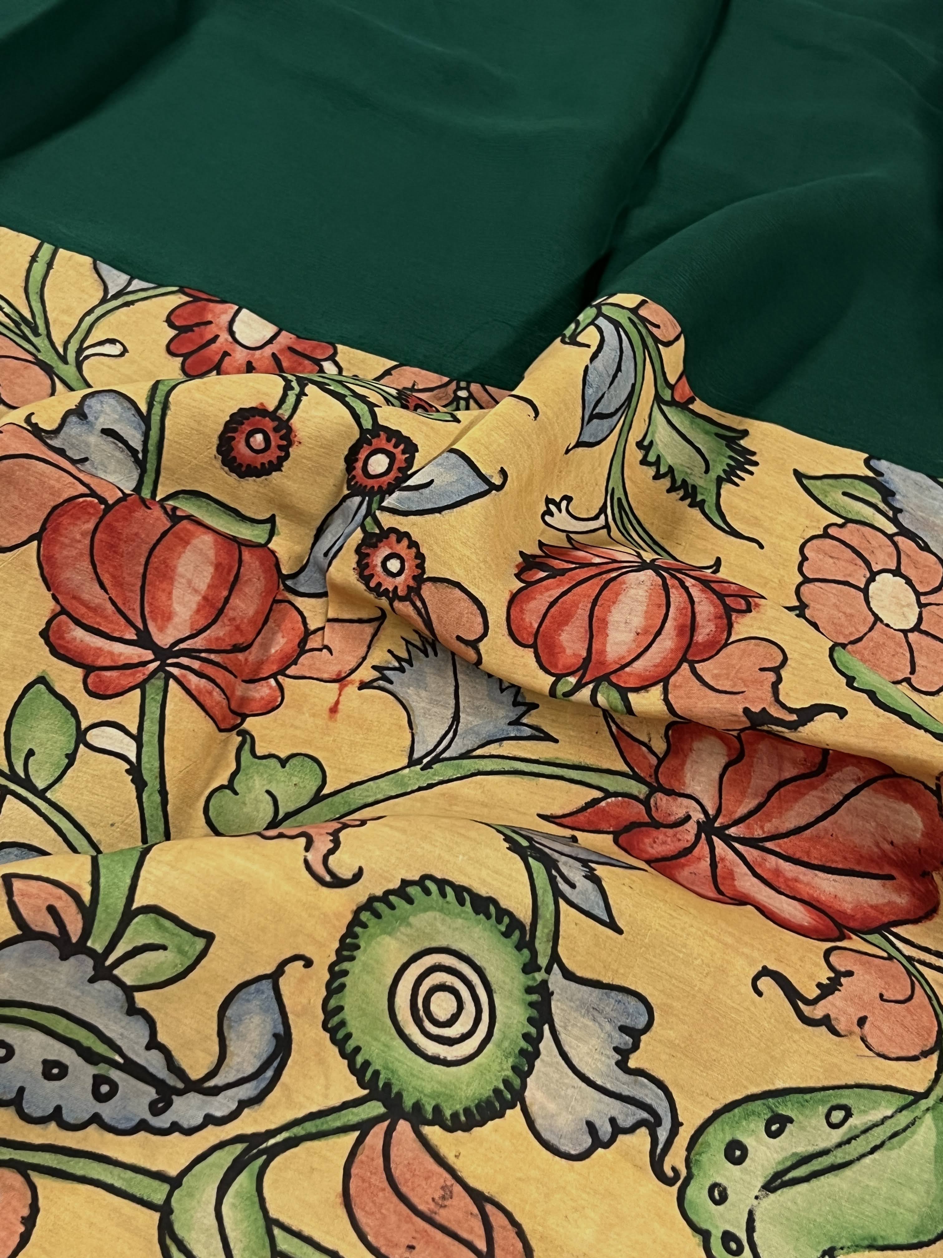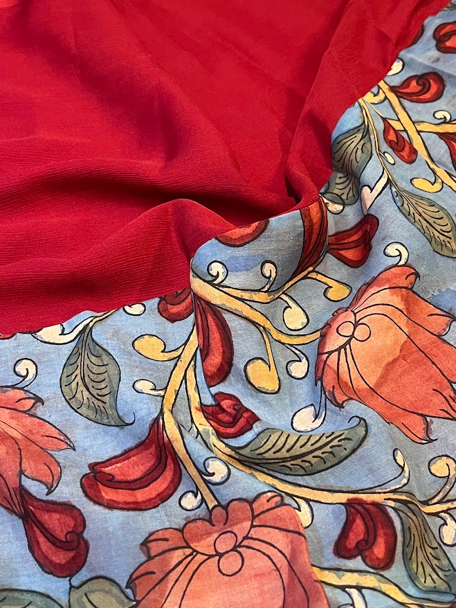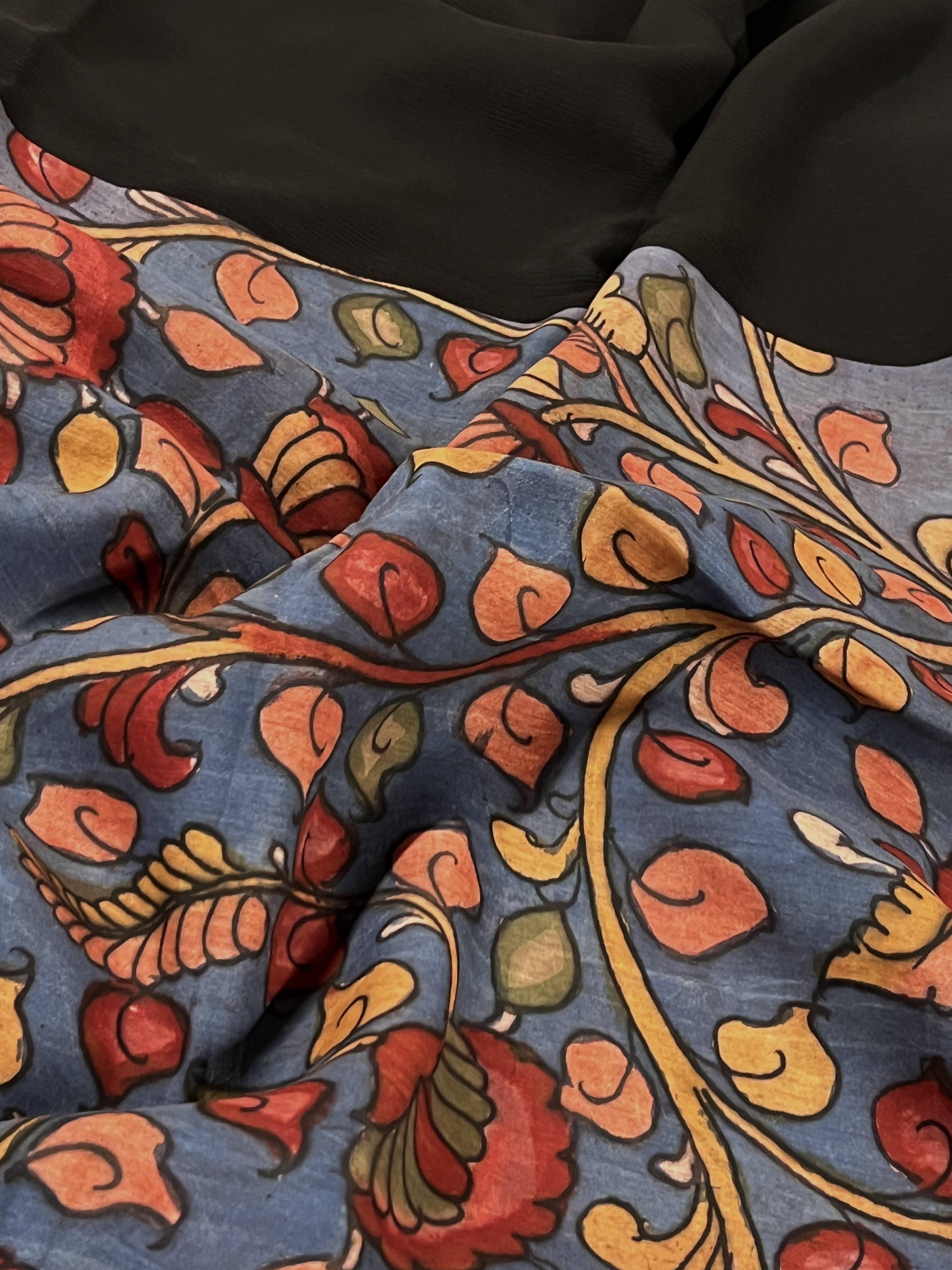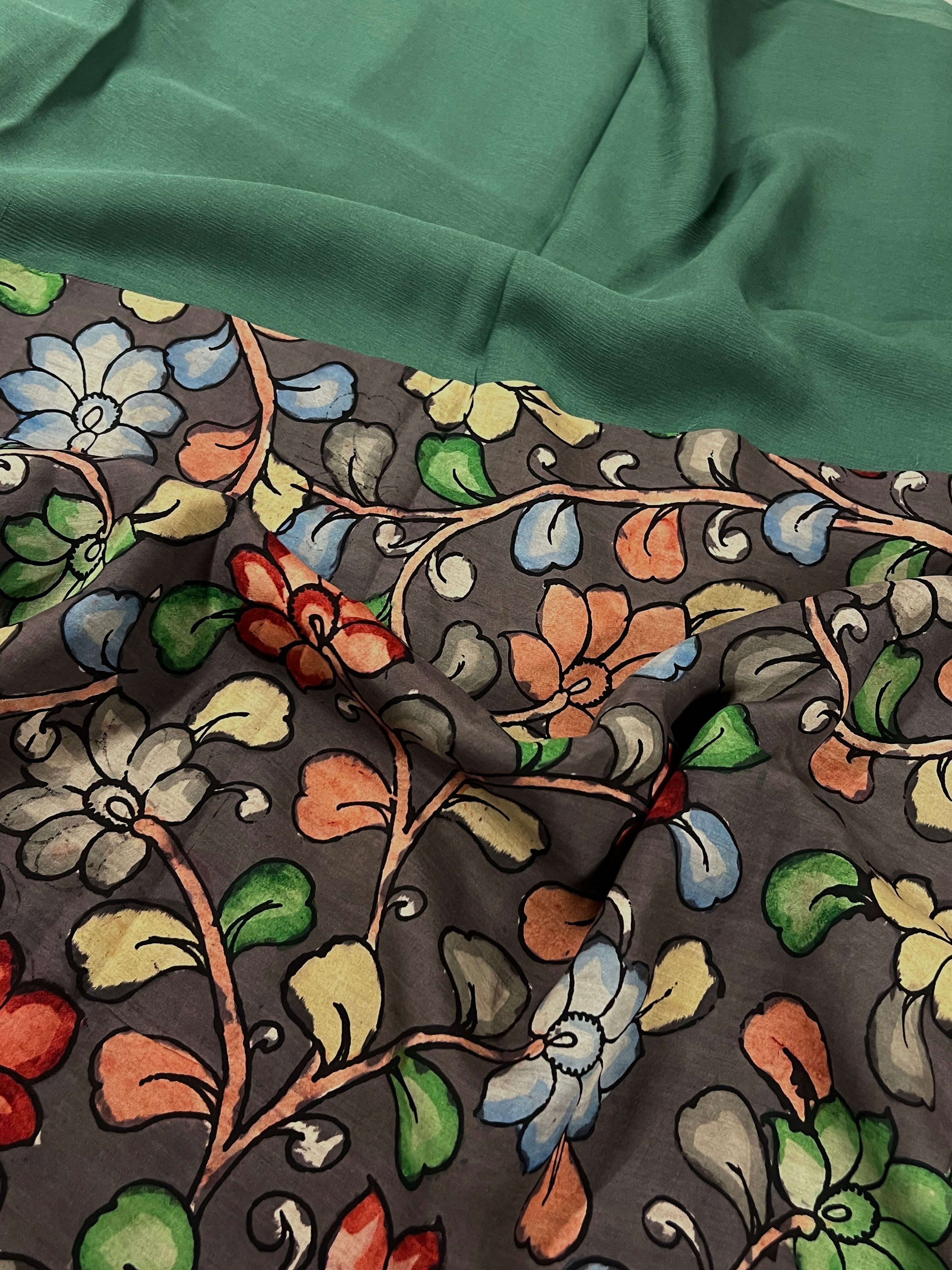 Hand painted kalamkari in silk Fusion with pure chiffon Hand painted kalamkari silk blouse piece Rising border pattern Light and easy to drape Dry clean only