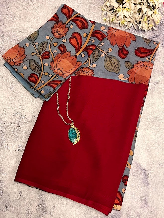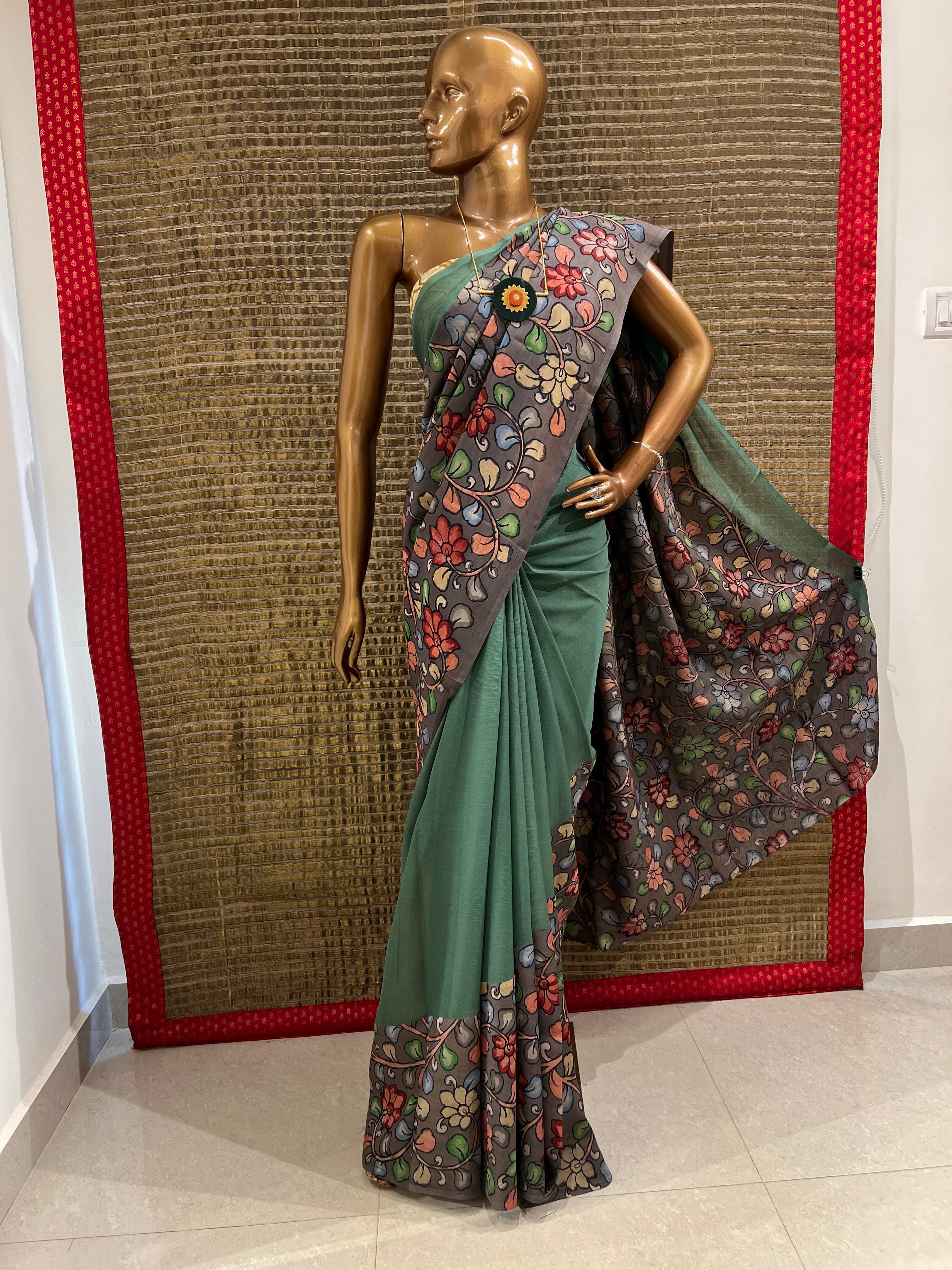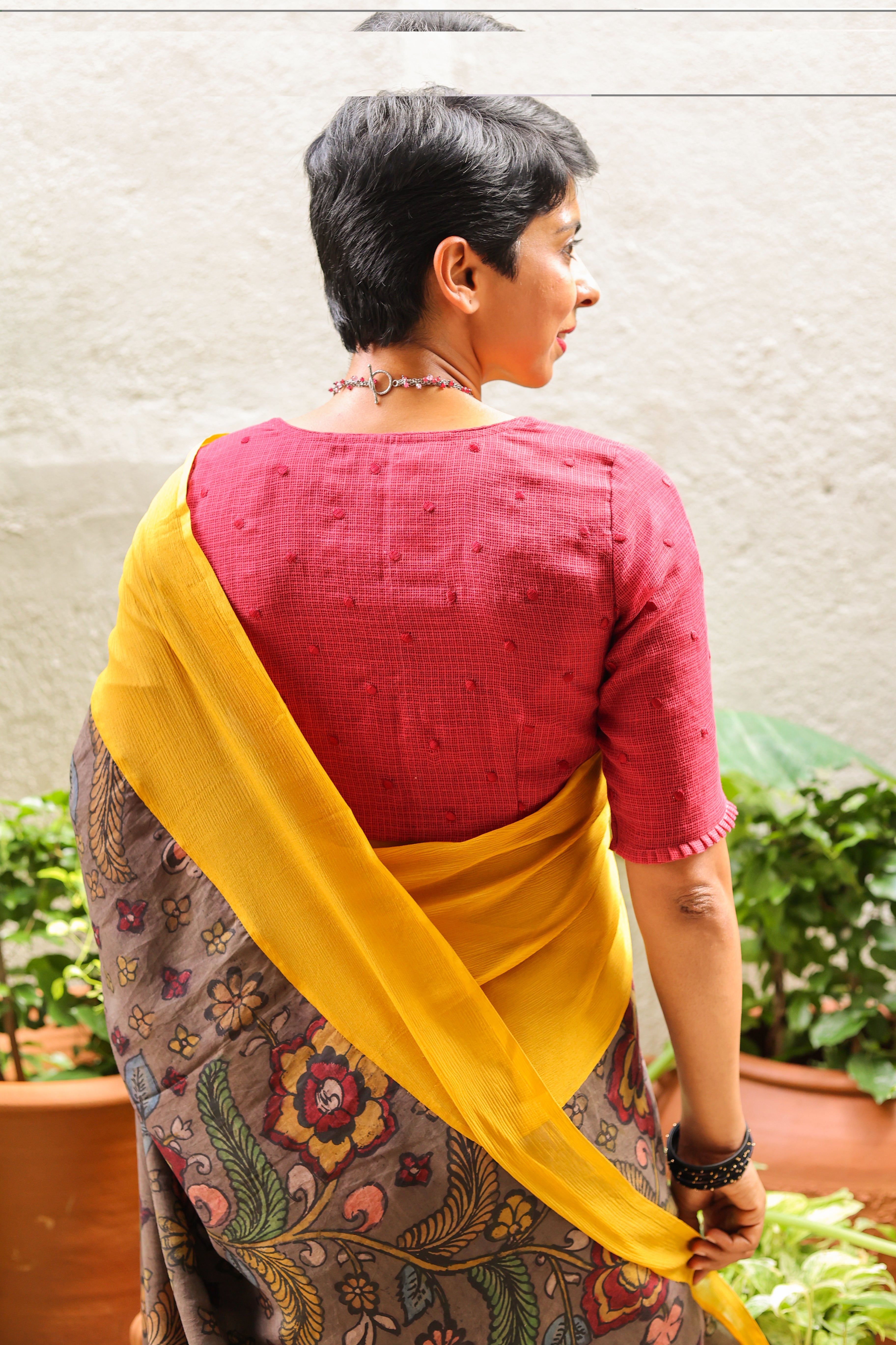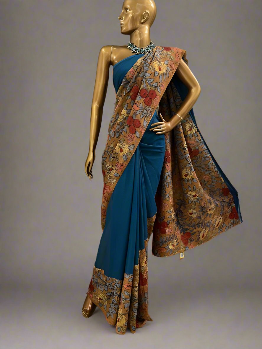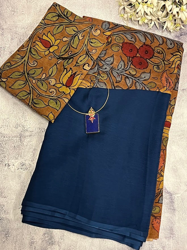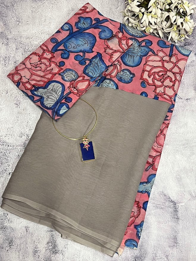 Hand painted kalamkari in silk Fusion with pure chiffon Hand painted kalamkari silk blouse piece Rising border pattern Light and easy to drape Dry clean only