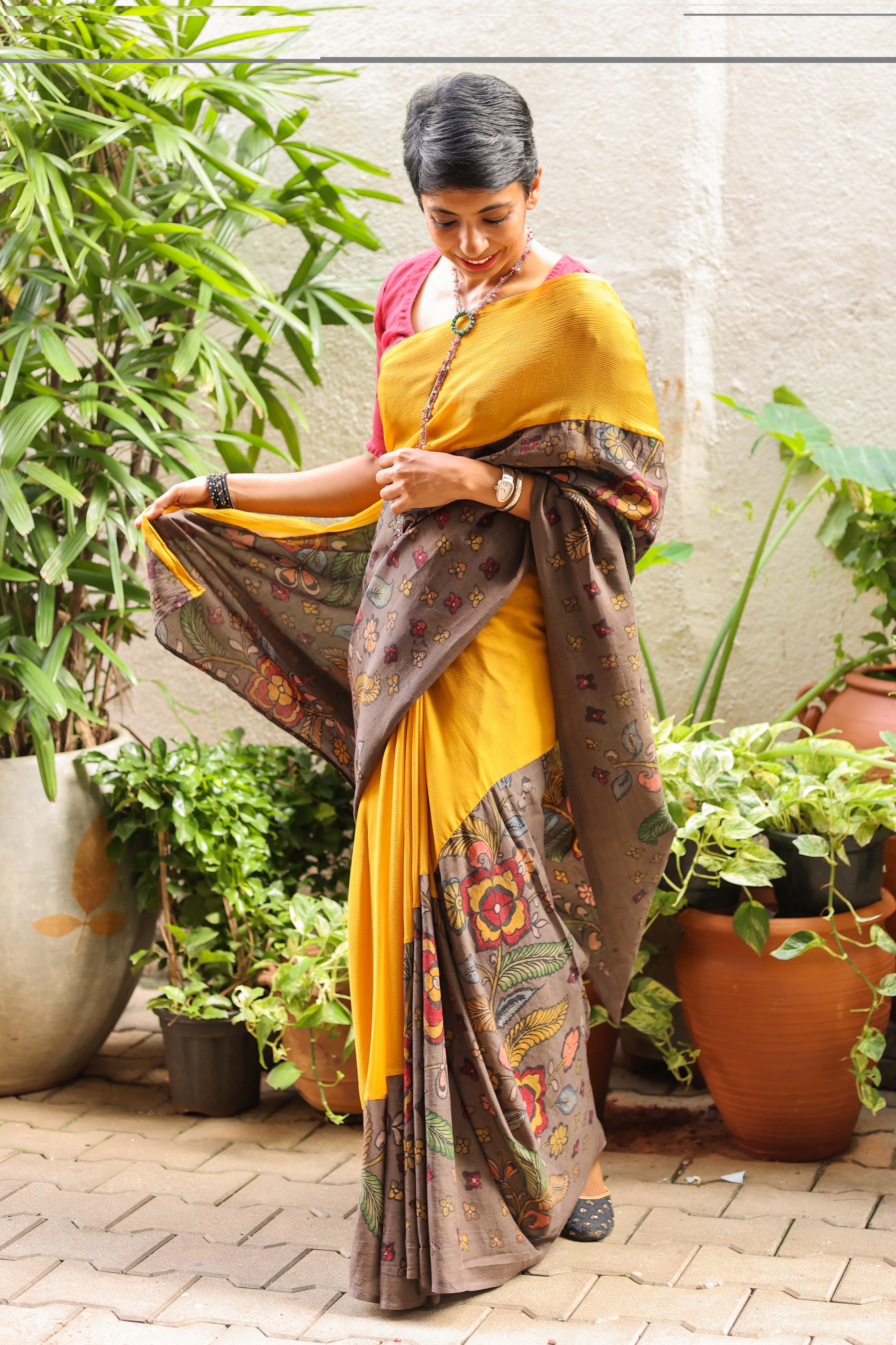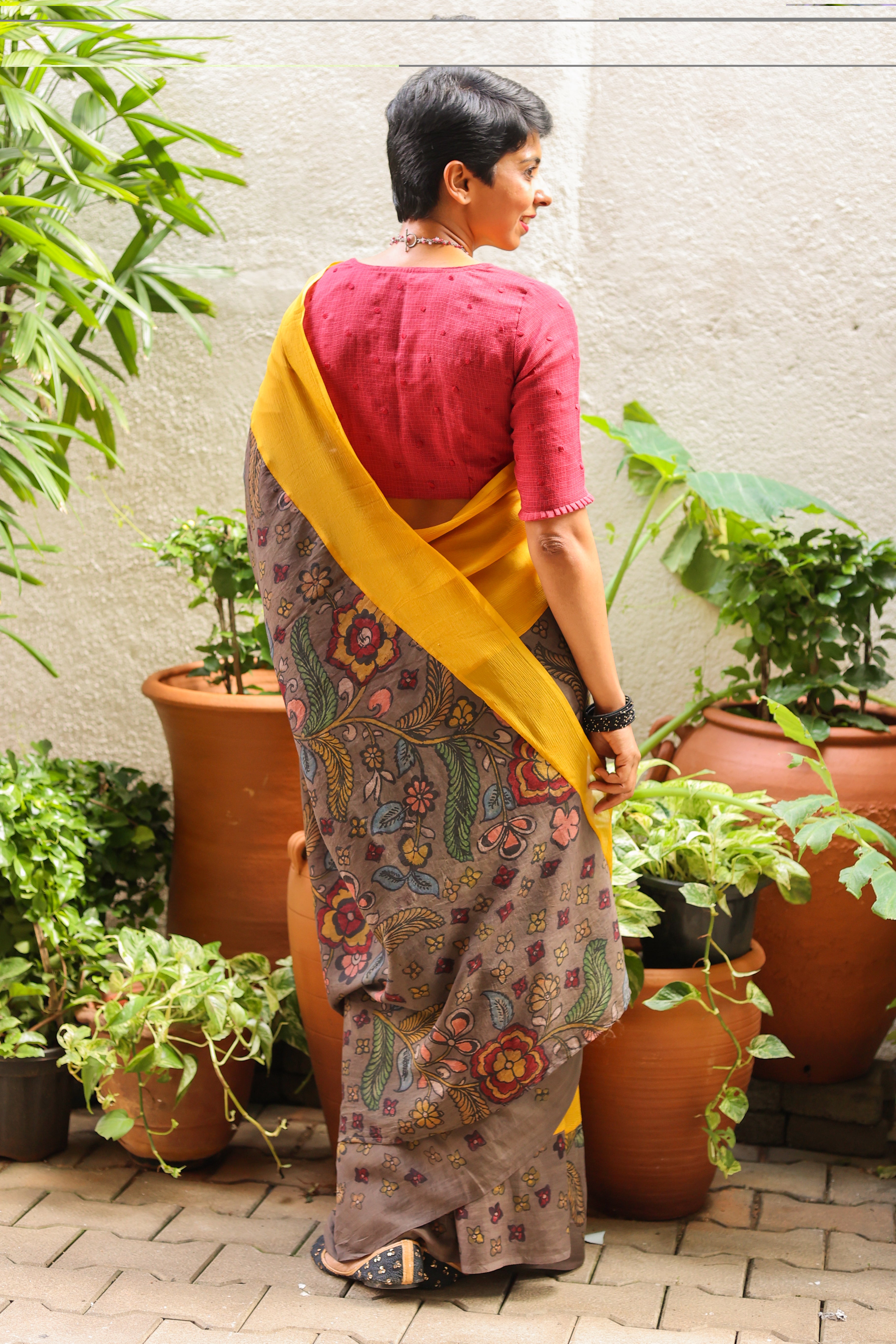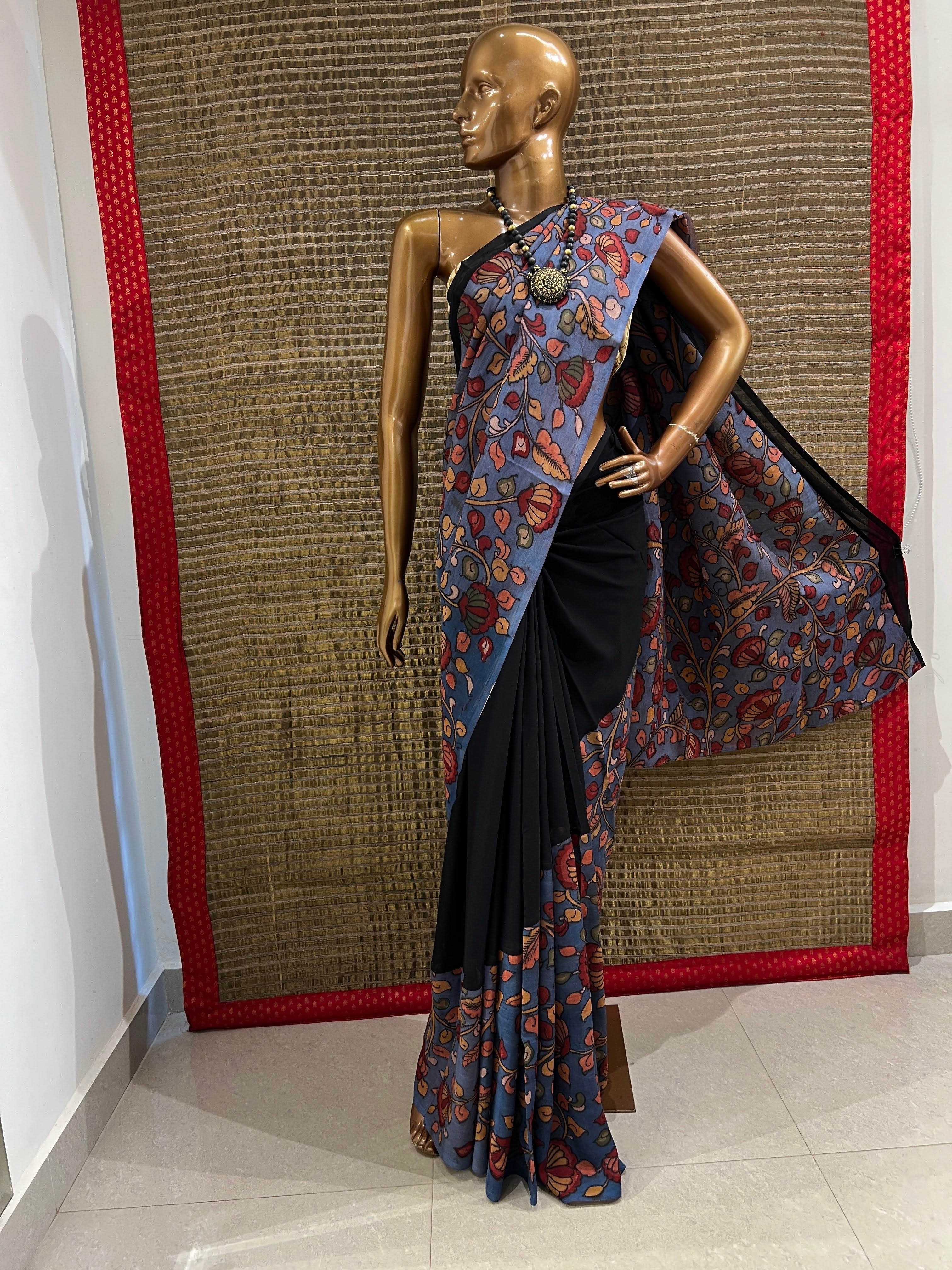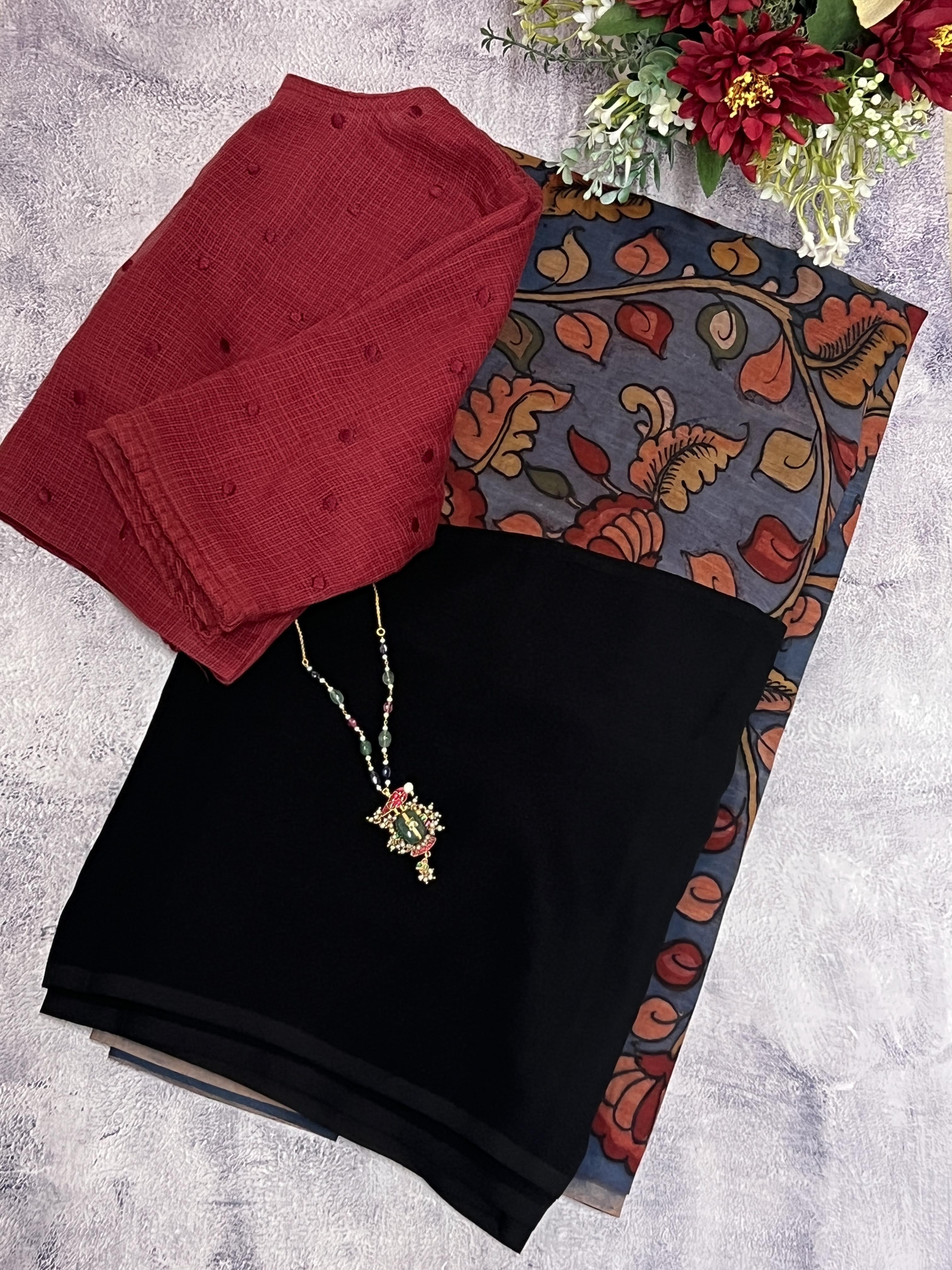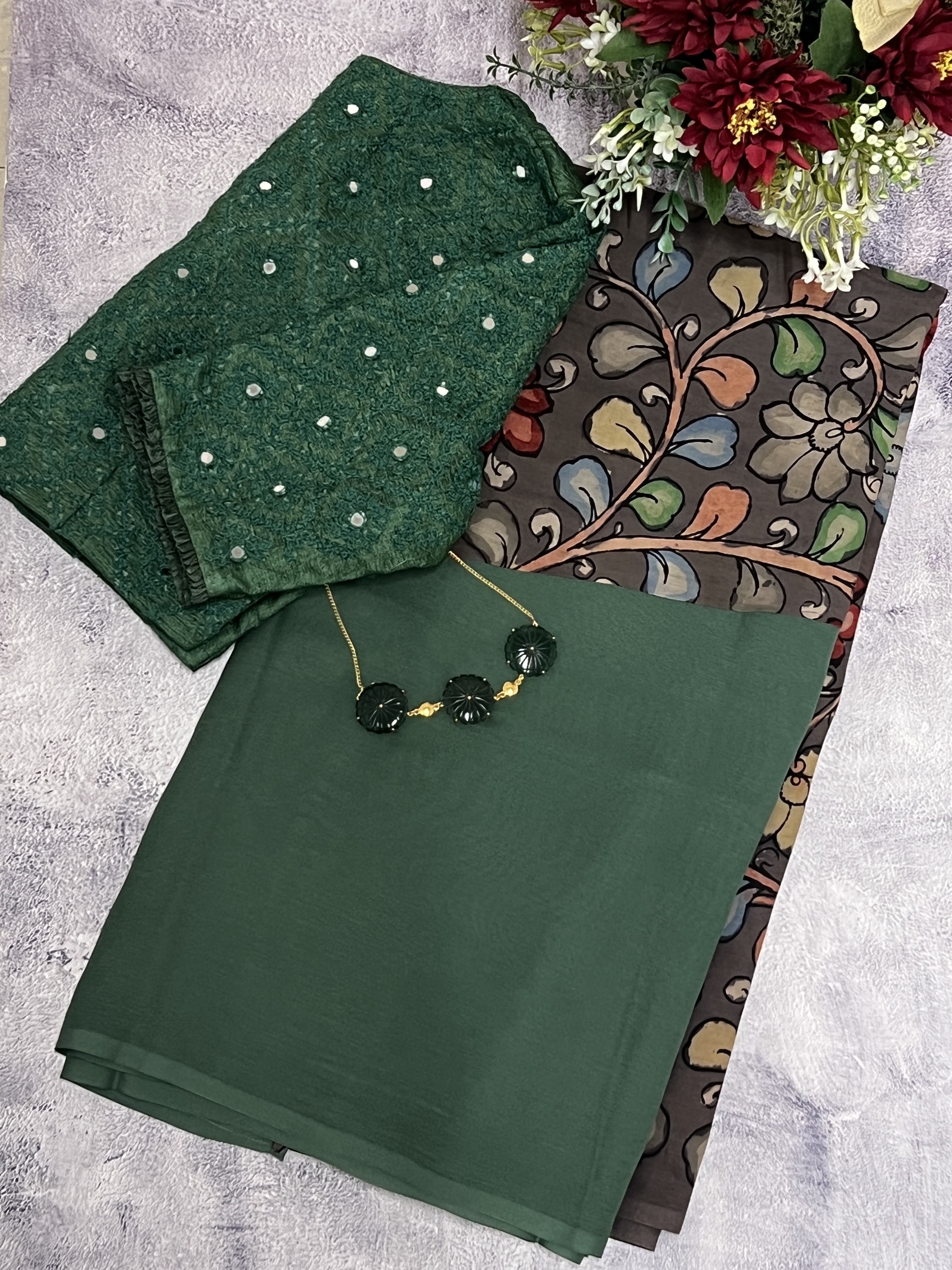 Hand painted kalamkari in silk Fusion with pure chiffon Hand painted kalamkari silk blouse piece Rising border pattern Light and easy to drape Dry clean only