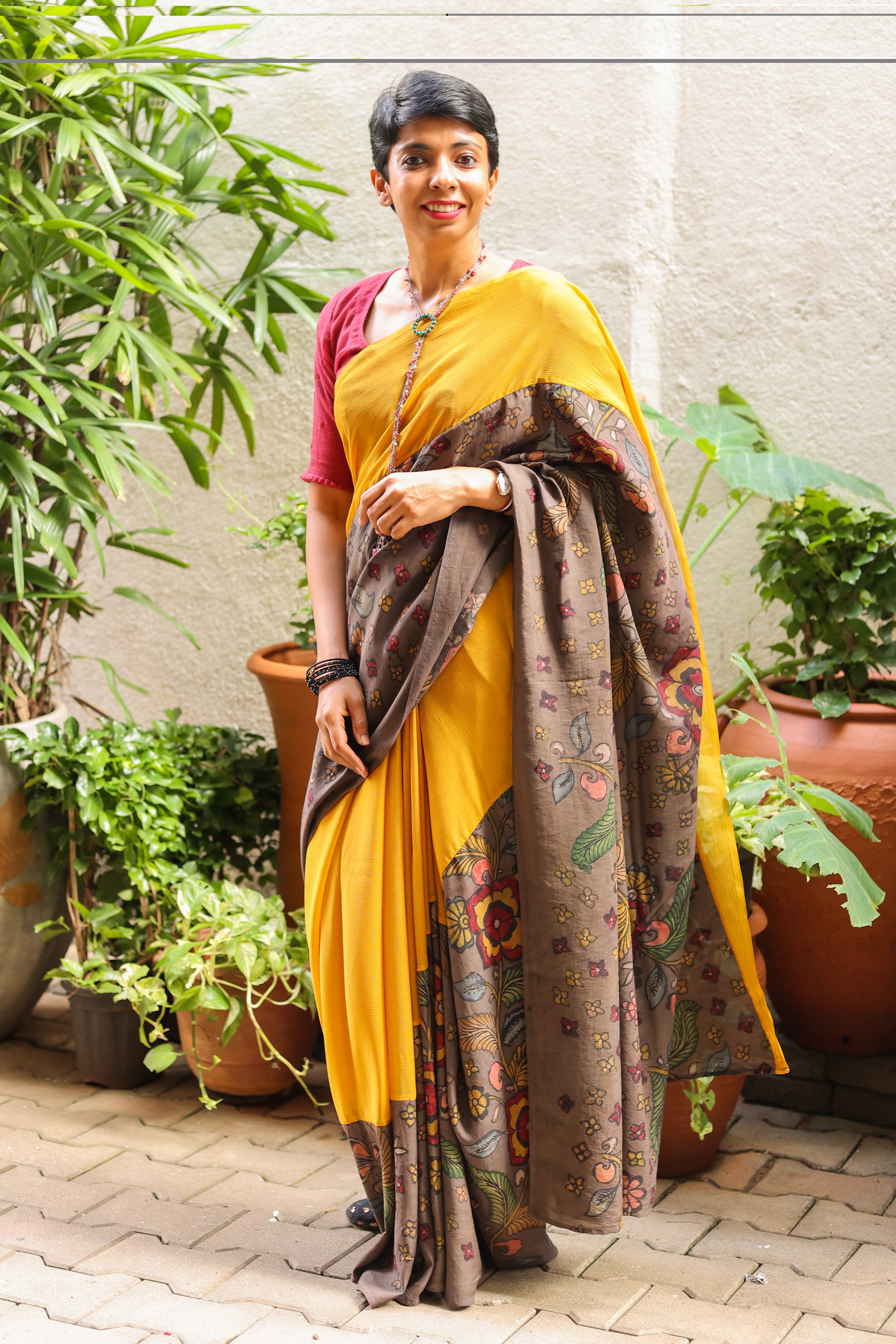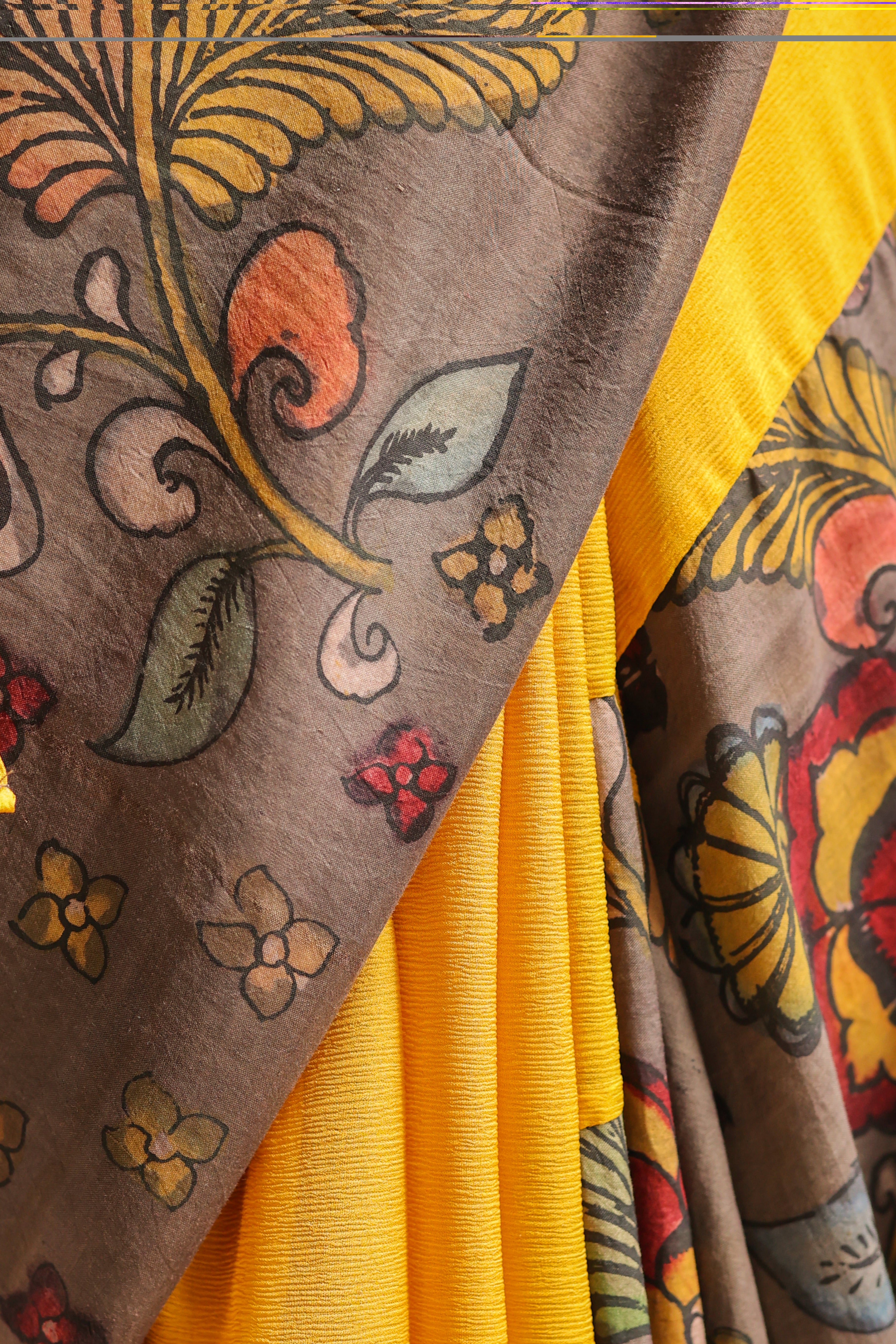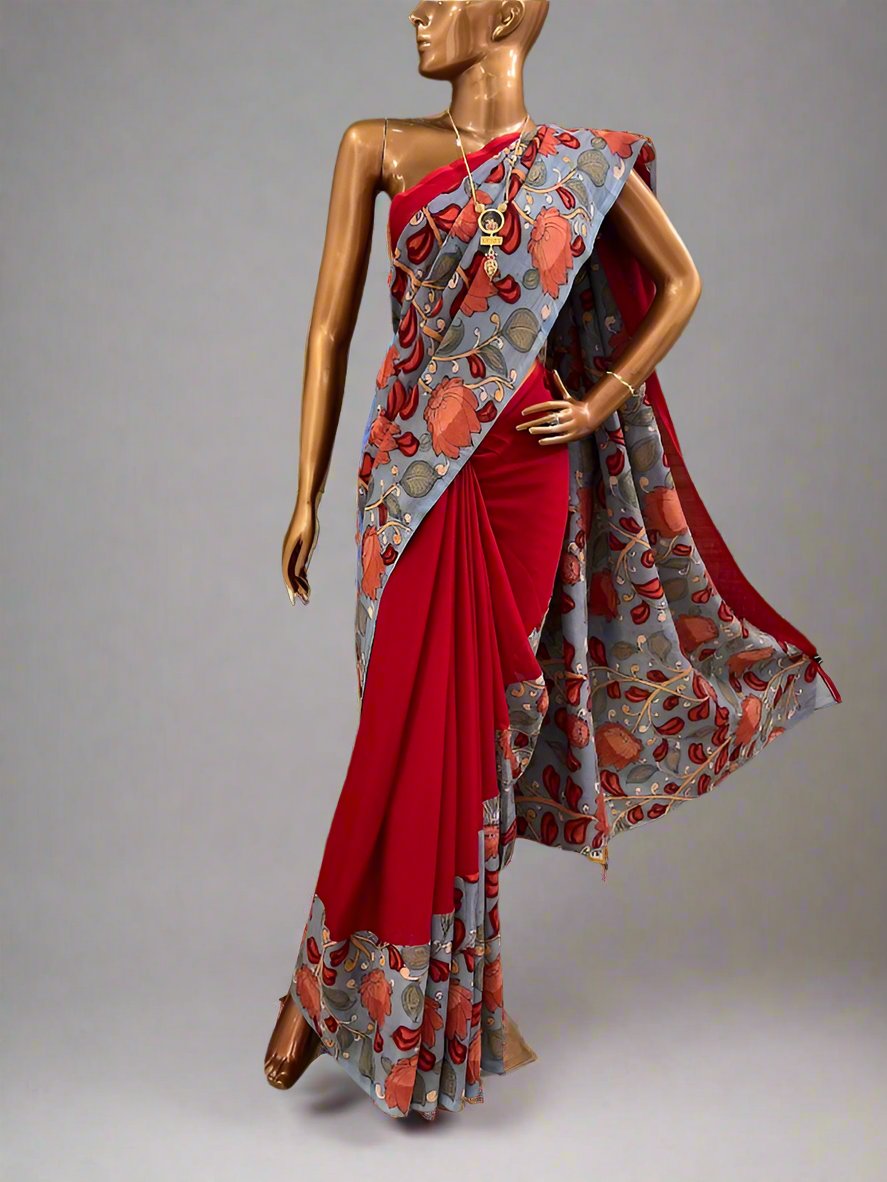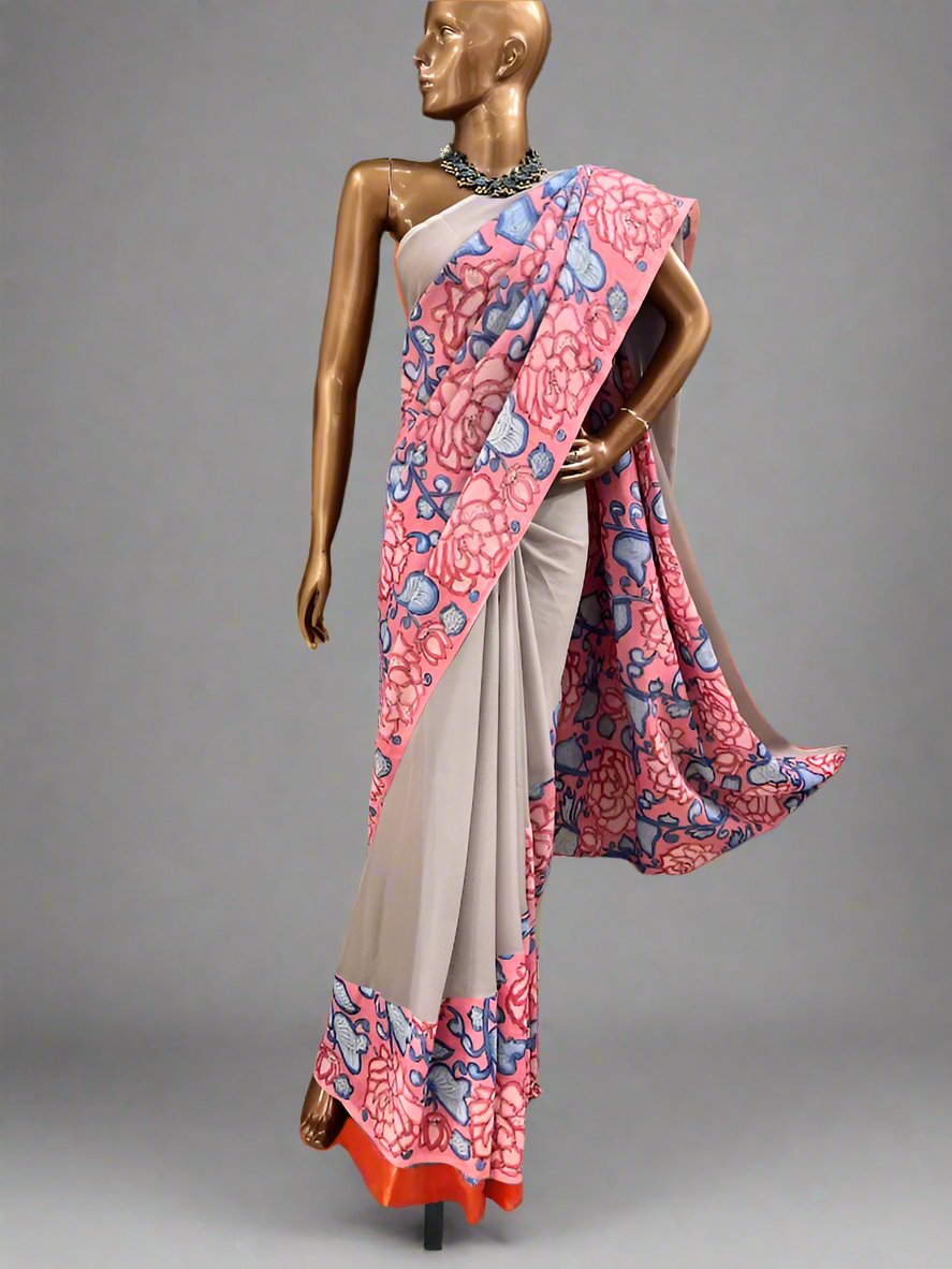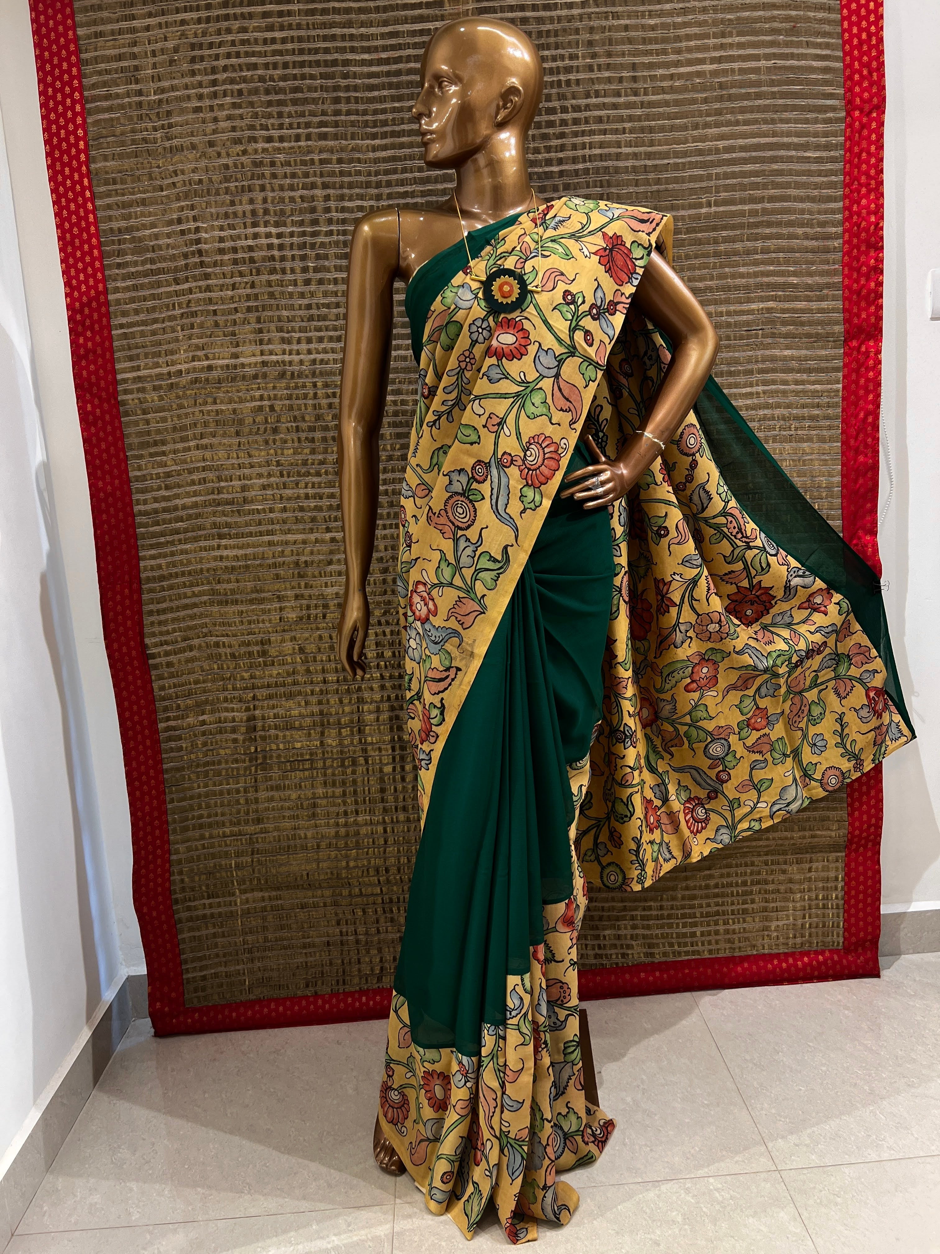 Hand painted kalamkari in silk Fusion with pure chiffon Hand painted kalamkari silk blouse piece Rising border pattern Light and easy to drape Dry clean only