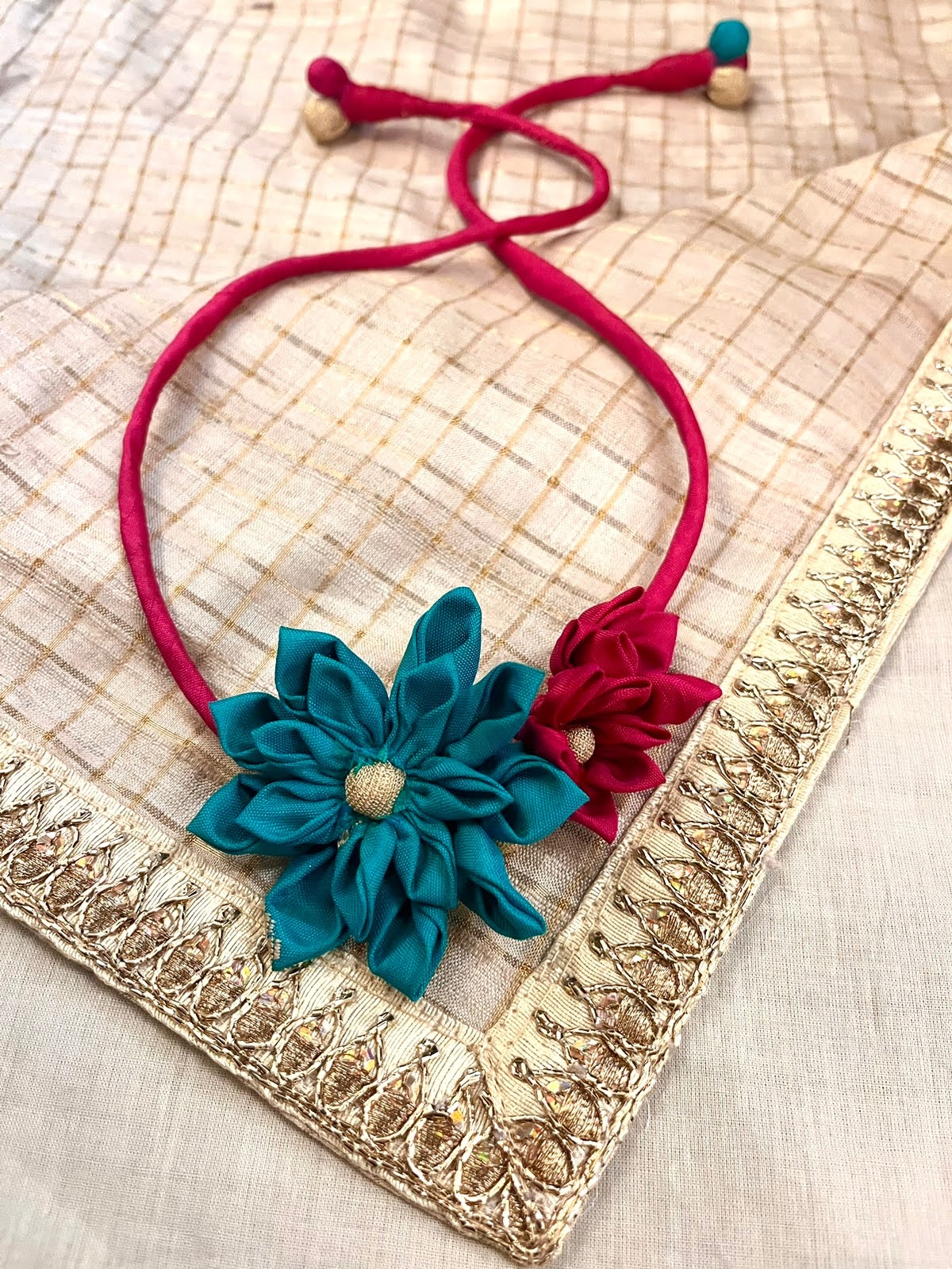 Blue and red crafted flowers Gajra neatly tucked on to the silk Dori with tassels. Note: It Can be used as hair accessory, a bracelet or even as a neck choker