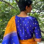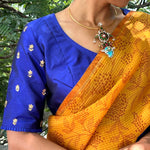 Kalavati MS blue embroidered silk blouse - Introducing our exquisite collection of Pitai (beaten zardosi) work blouses, now part of our versatile range of ready-to-wear blouses. This royal MS blue pure handwoven silk blouse is meticulously hand-embroidered with intricate beaten zardosi work, creating a sophisticated and elegant piece perfect for festive and occasion wear. The luxurious craftsmanship and timeless design make this blouse an essential addition to your ethnic wardrobe. To view more similar blouses, pls click onhttps://aavaranaa.com/blouses/