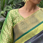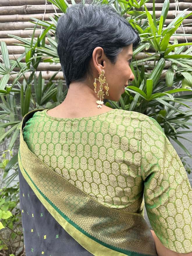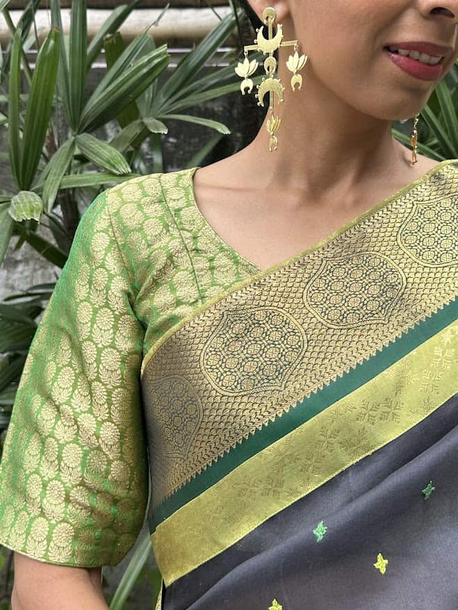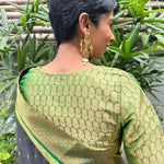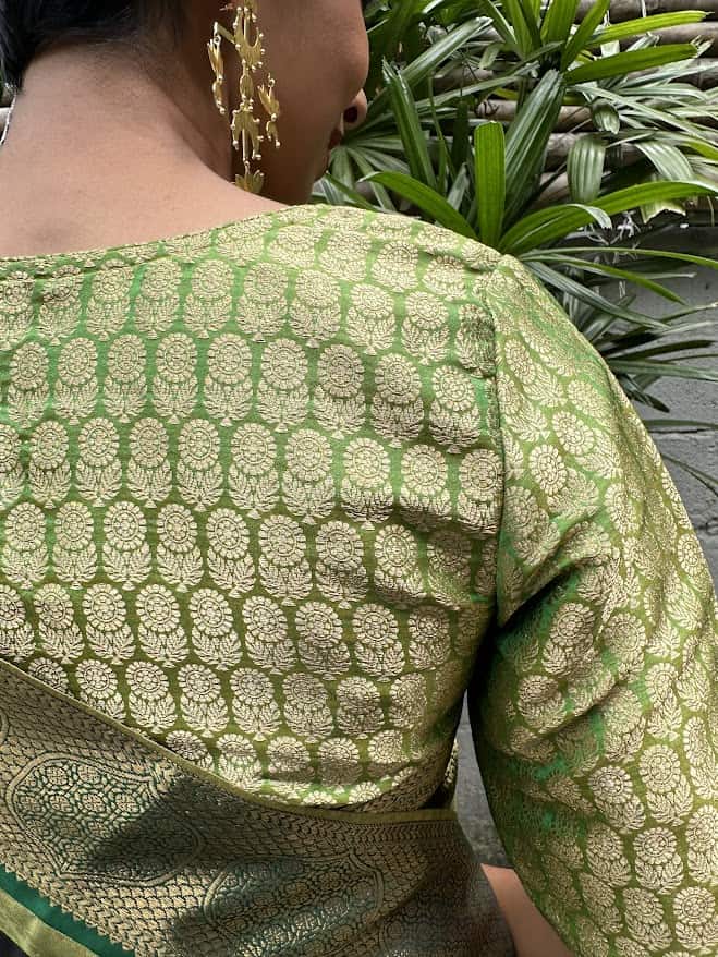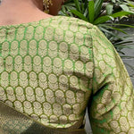 This leaf green brocade silk blouse is a versatile addition to every wardrobe. The green and gold combination subtly blends with any green or stand out as a contrast with other tones. The blouse is lined with soft cotton and opens in the front. The front neck is kept low to enable accessories to show well.