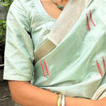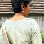 A lovely pastel addition to our range of versatile and stylish blouses is this powder blue silk brocade blouse. It has antique zari work all over which is highlighted with the high neck back. With a low round neck at the front and a front-opening design, it elevates the functionality of your wardrobe ensuring it works effortlessly for you.