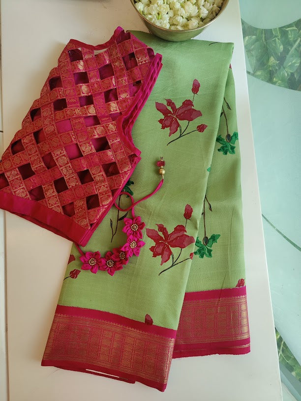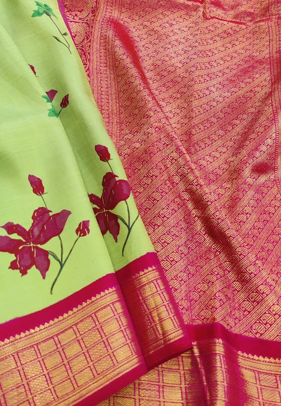 Cardamom green kanchipuram silk saree with hand woven pink korvai border featuring zari enhanced by floral prints on the body . Pallu is completely woven in zari Blouse: Rani pink with zari border and buttis Woodblock printing on textiles is the process of printing patterns on textiles, usually of linen, cotton or silk by means of incised wooden blocks. It is the earliest and slowest of all methods of textile printing. Block printing by hand is a slow process. It is however, capable of yielding highly artistic results, some of which are unobtainable by any other method. It can be paired with any silver jewelry and ready to wear blouse to add more shine and colour and the same can be purchased from the Accessories and Ready to wear section respectively. Note : The tailored blouse featured is only for reference.