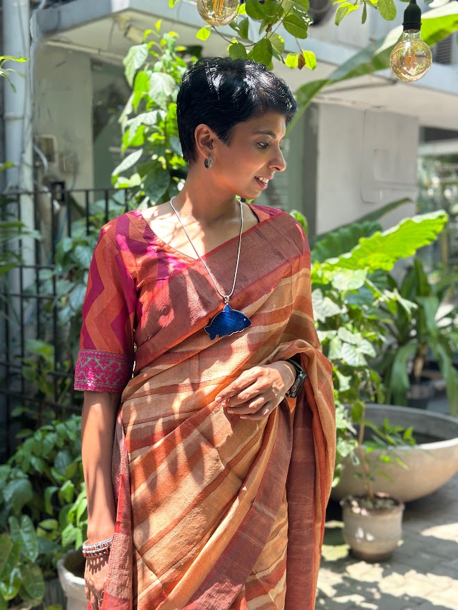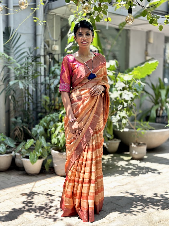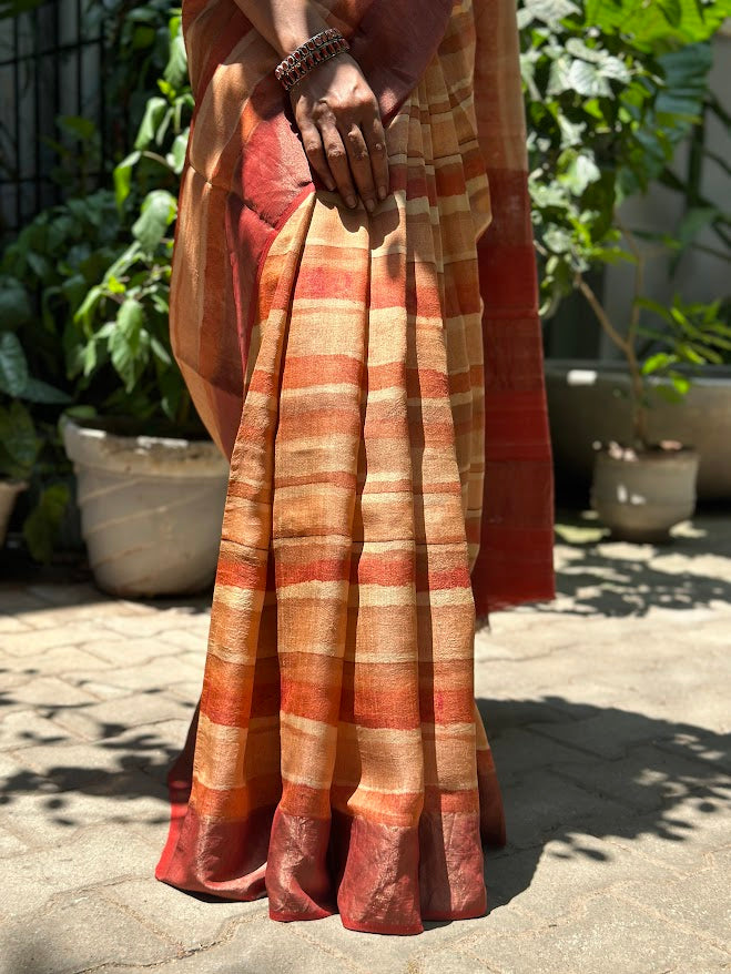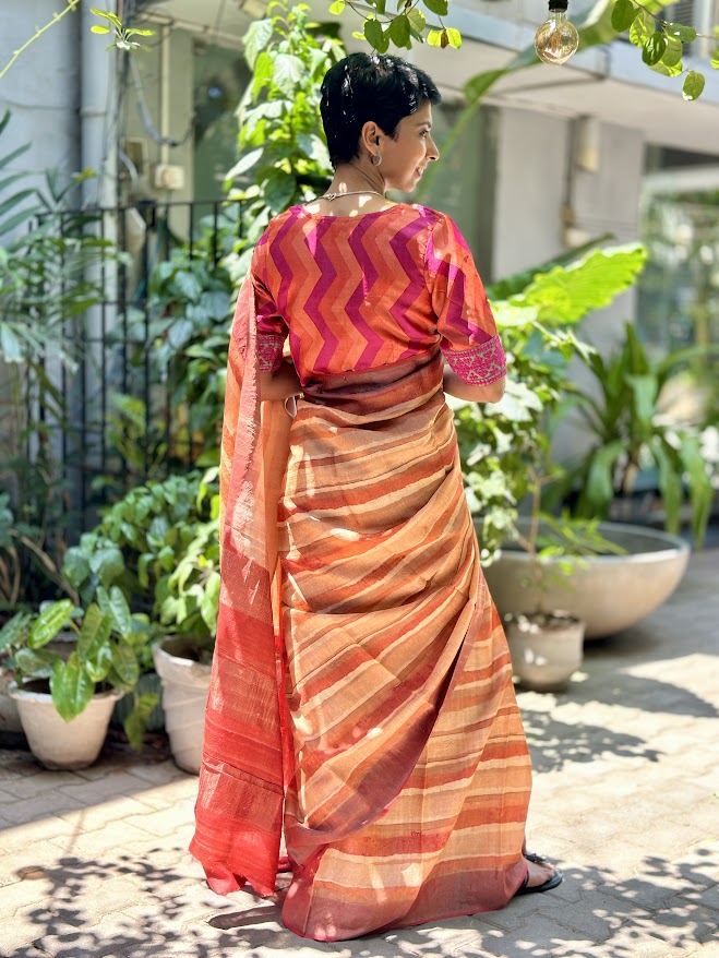This dreamy saree is crafted from raw and lustrous pure handwoven tussar silk. Handprinted bands of orange-hued stripes emulate the fluidity and translucence of watercolors. The addition of pure zari borders and a zari-striped pallu enhances the elegance of this sophisticated earthy drape. The saree comes with a floral printed orange and beige blouse piece that is the perfect yin to the yang.