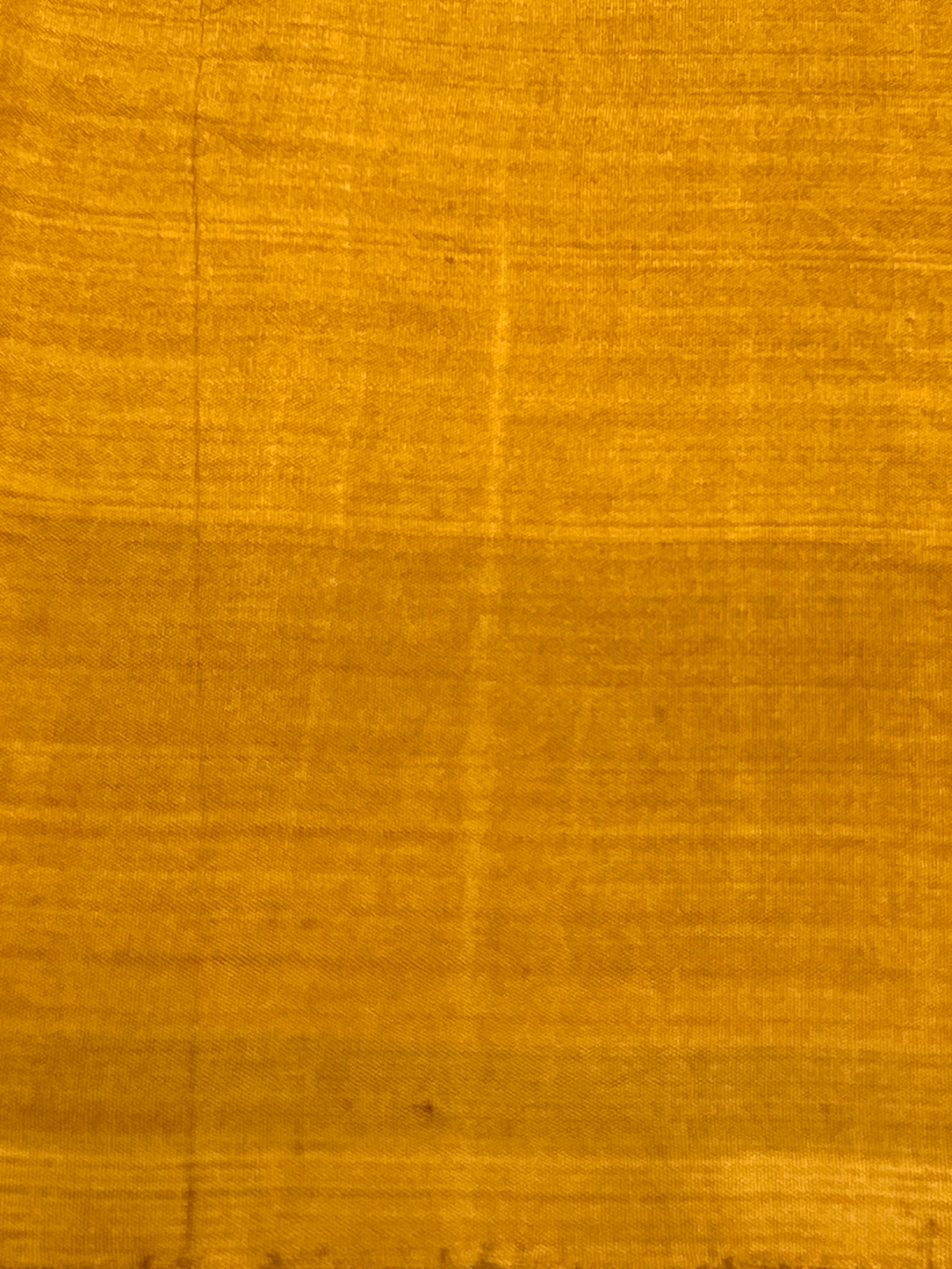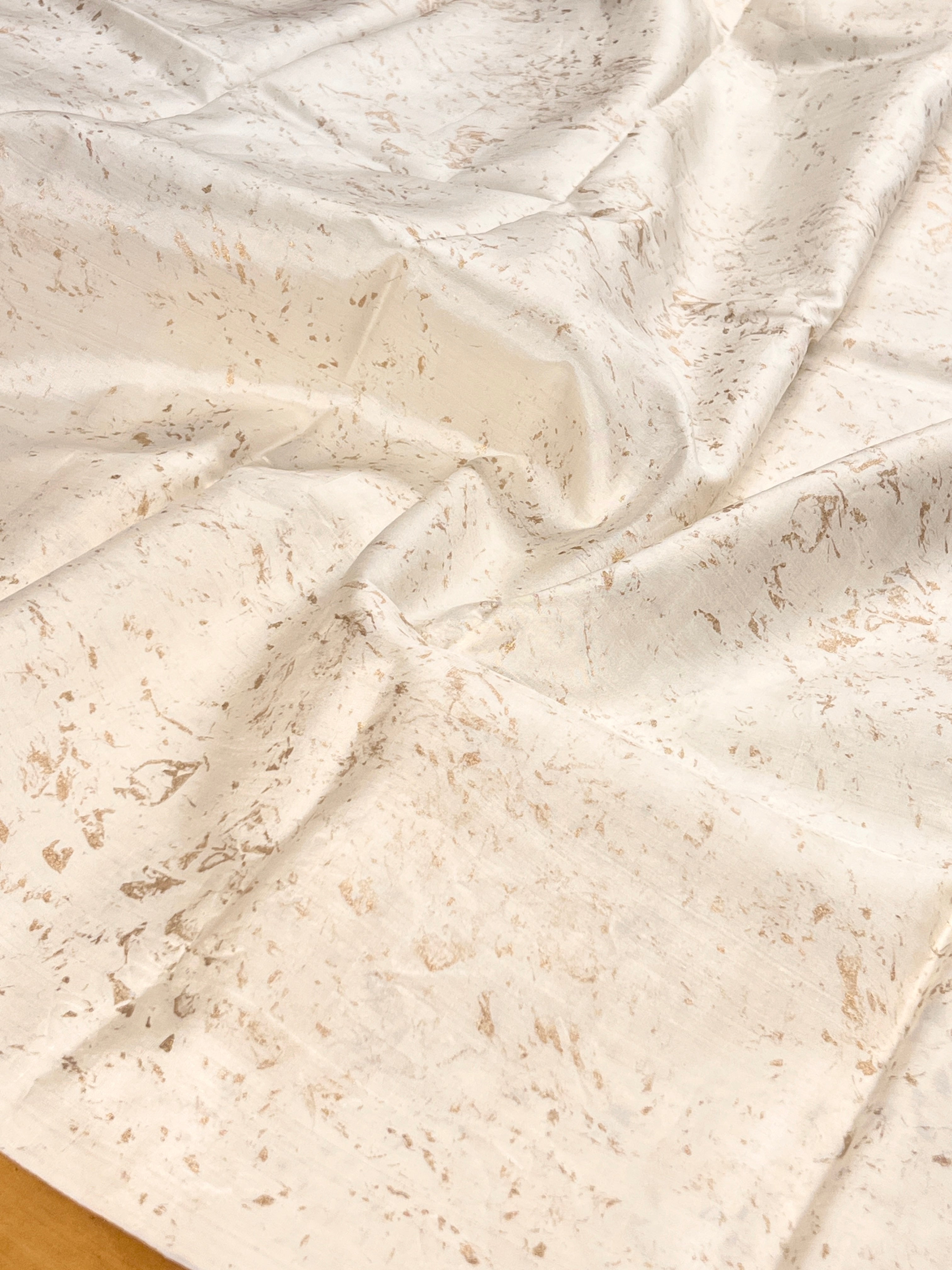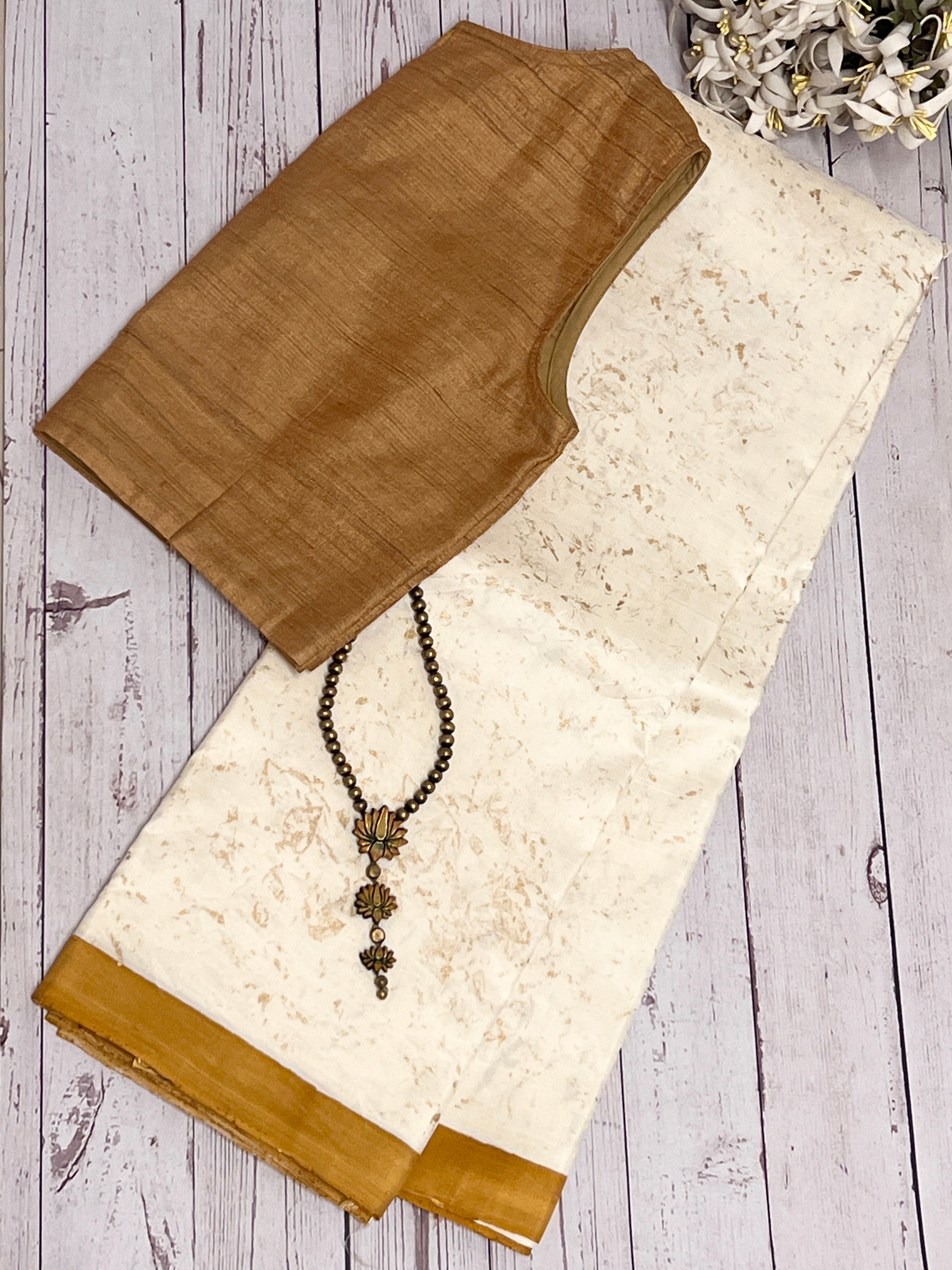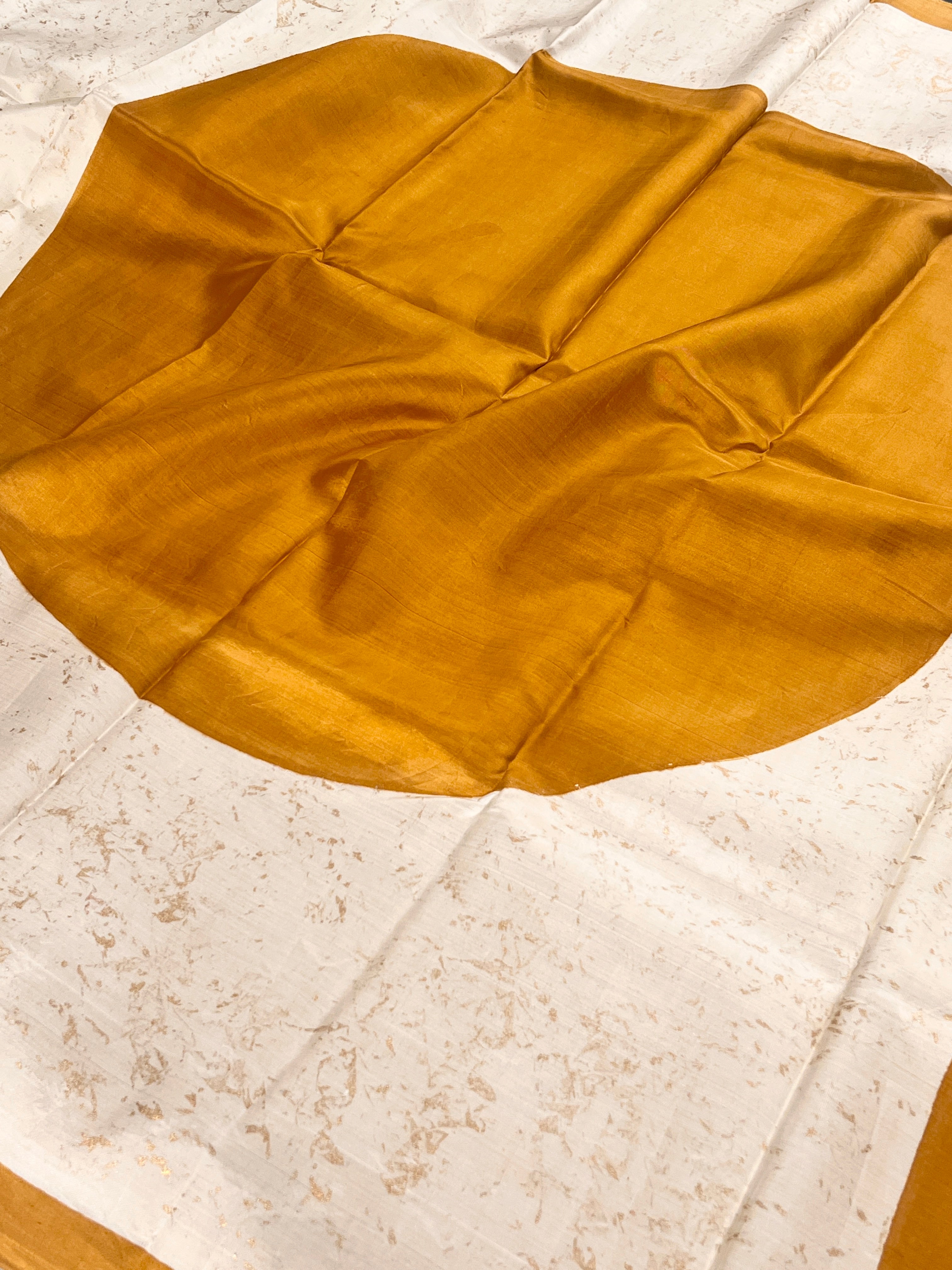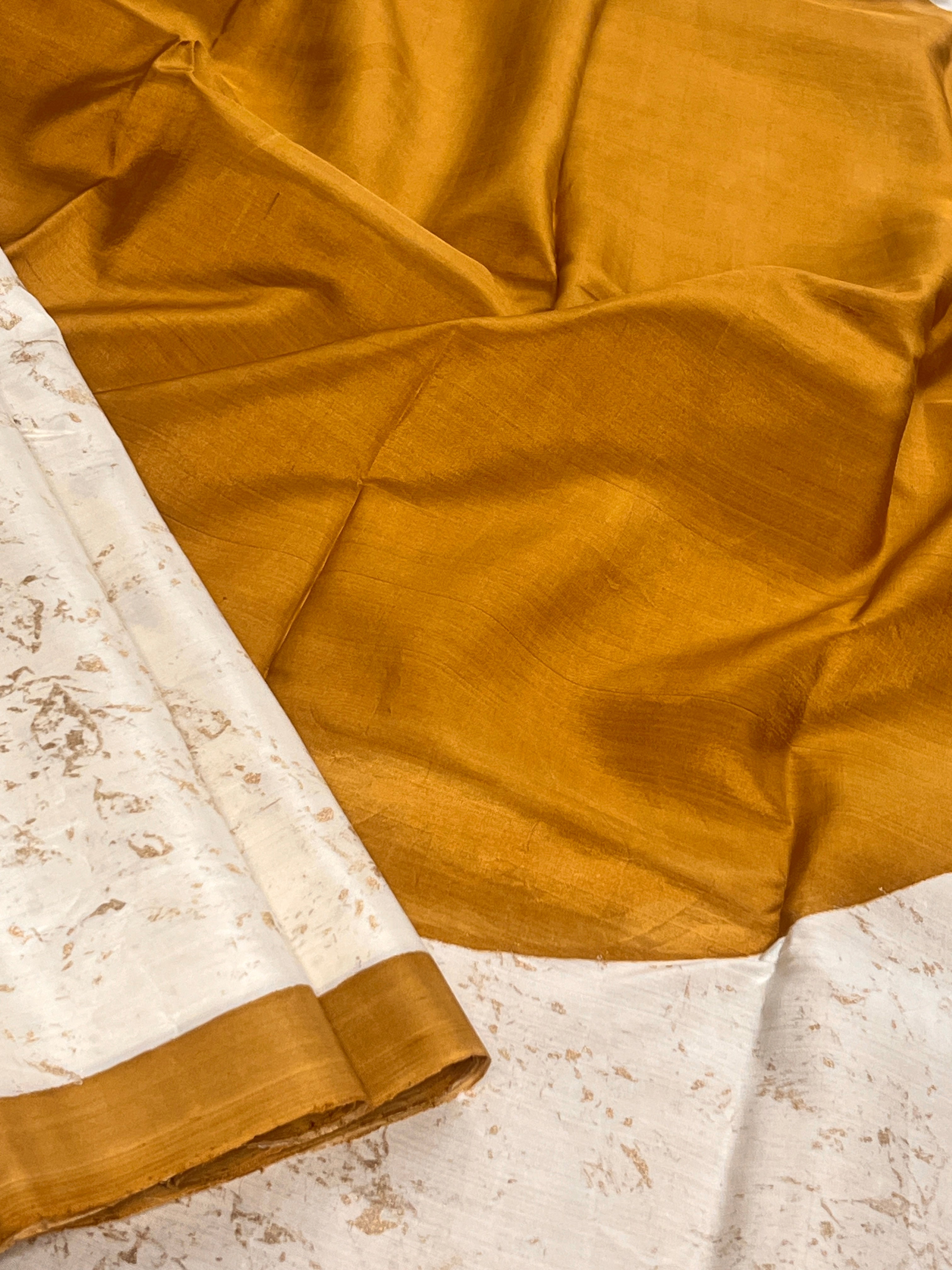 - White silk saree with gold foil prints and a contrasting yellow selvage.