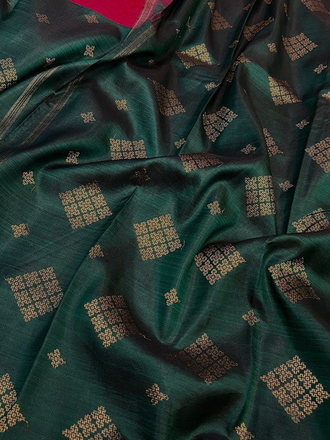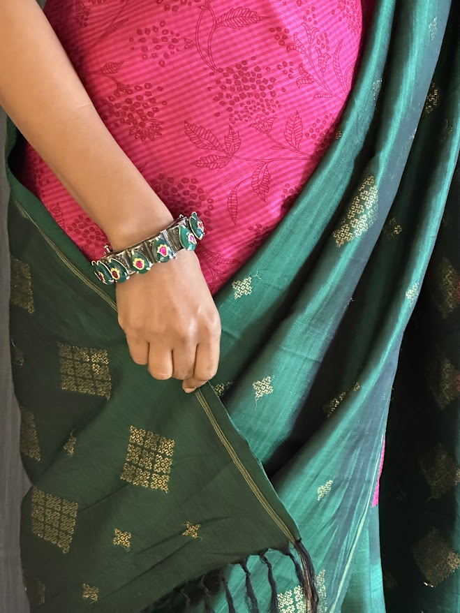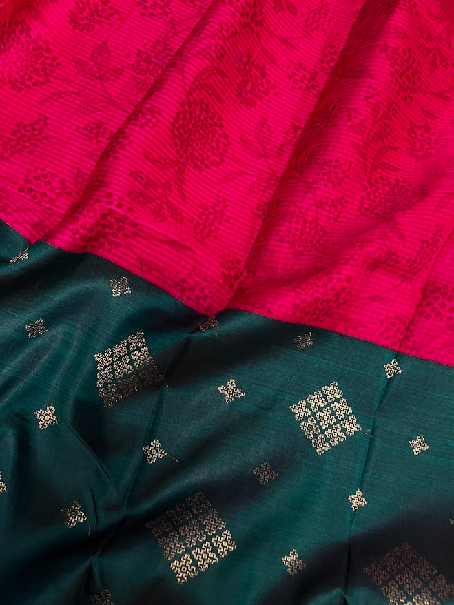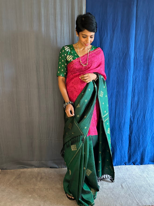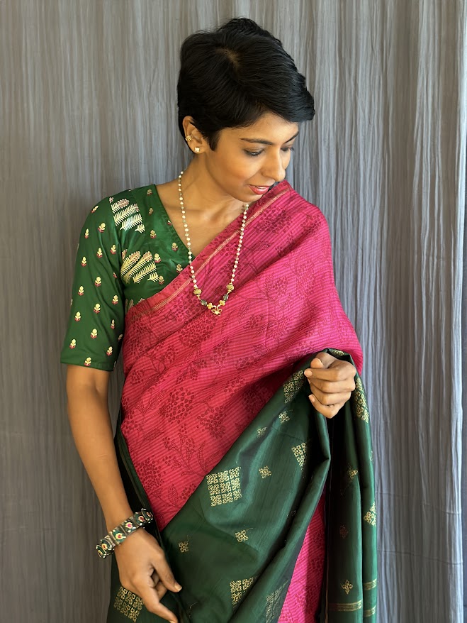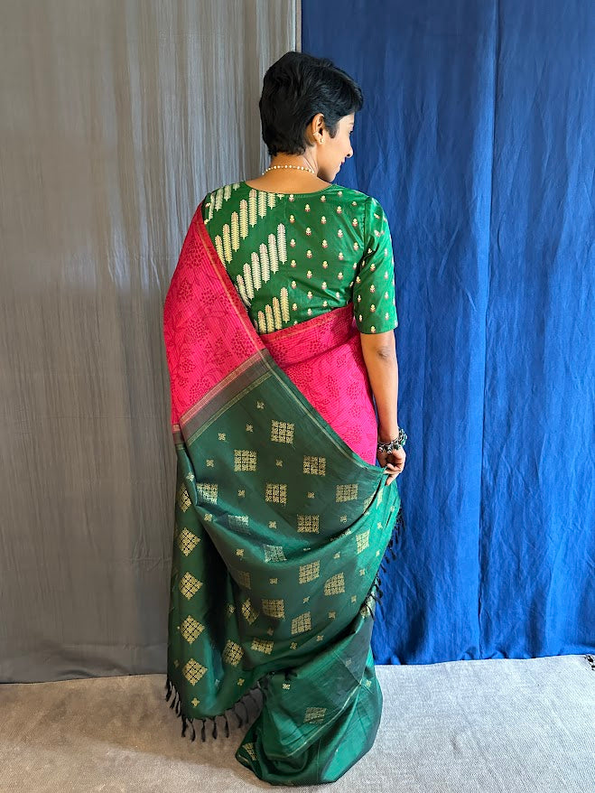 Mila pink green organza kanchipuram saree - Discover the elegance of our kai korvai pure Kanchipuram saree, featuring a unique blend of pink micro checked organza for the top portion and luxurious Kanchi silk for the bottom. The silk section is adorned with kasuti-inspired motifs in pure zari, while the pink organza showcases delicate monotoned hand-printing . This exquisite saree seamlessly combines traditional craftsmanship with contemporary design, making it perfect for festive occasions and special events. Enhance your ethnic wardrobe with this stunning and beautifully crafted piece. To view more similar fusion sarees, pls click onhttps://aavaranaa.com/product-tag/mila/