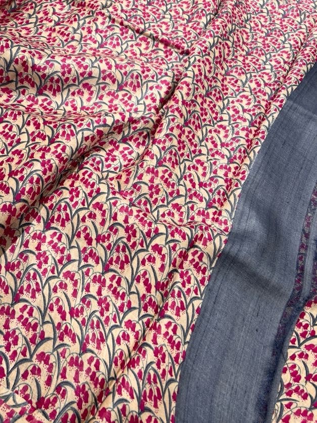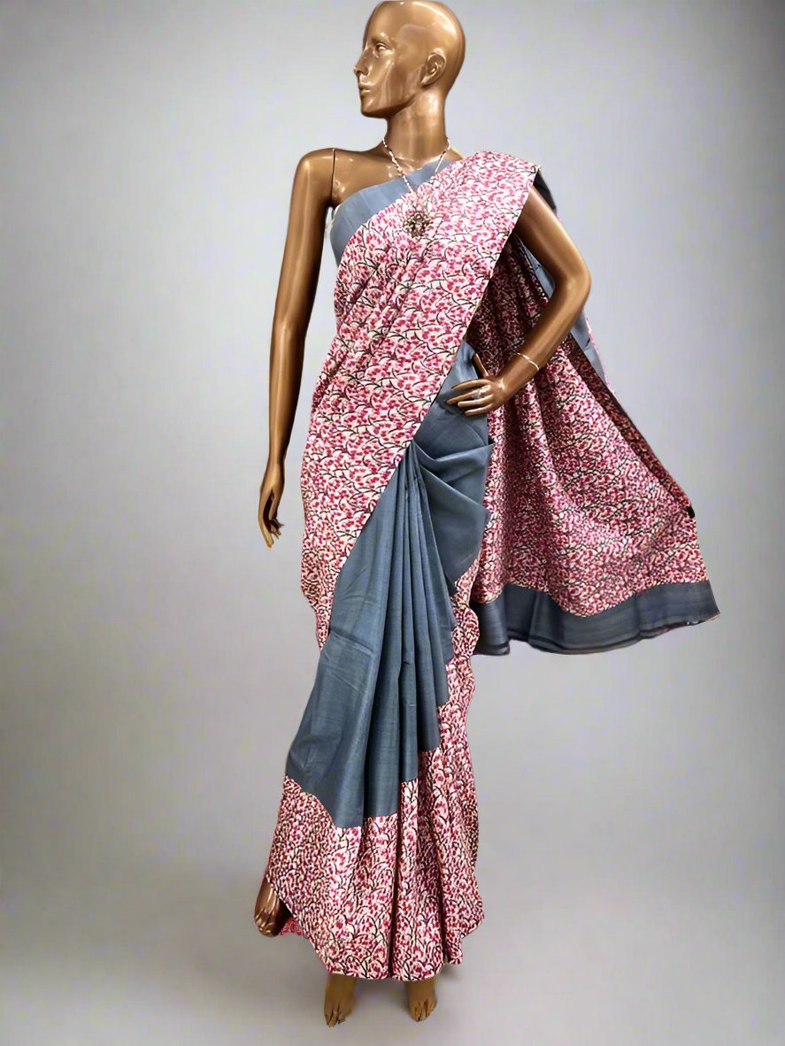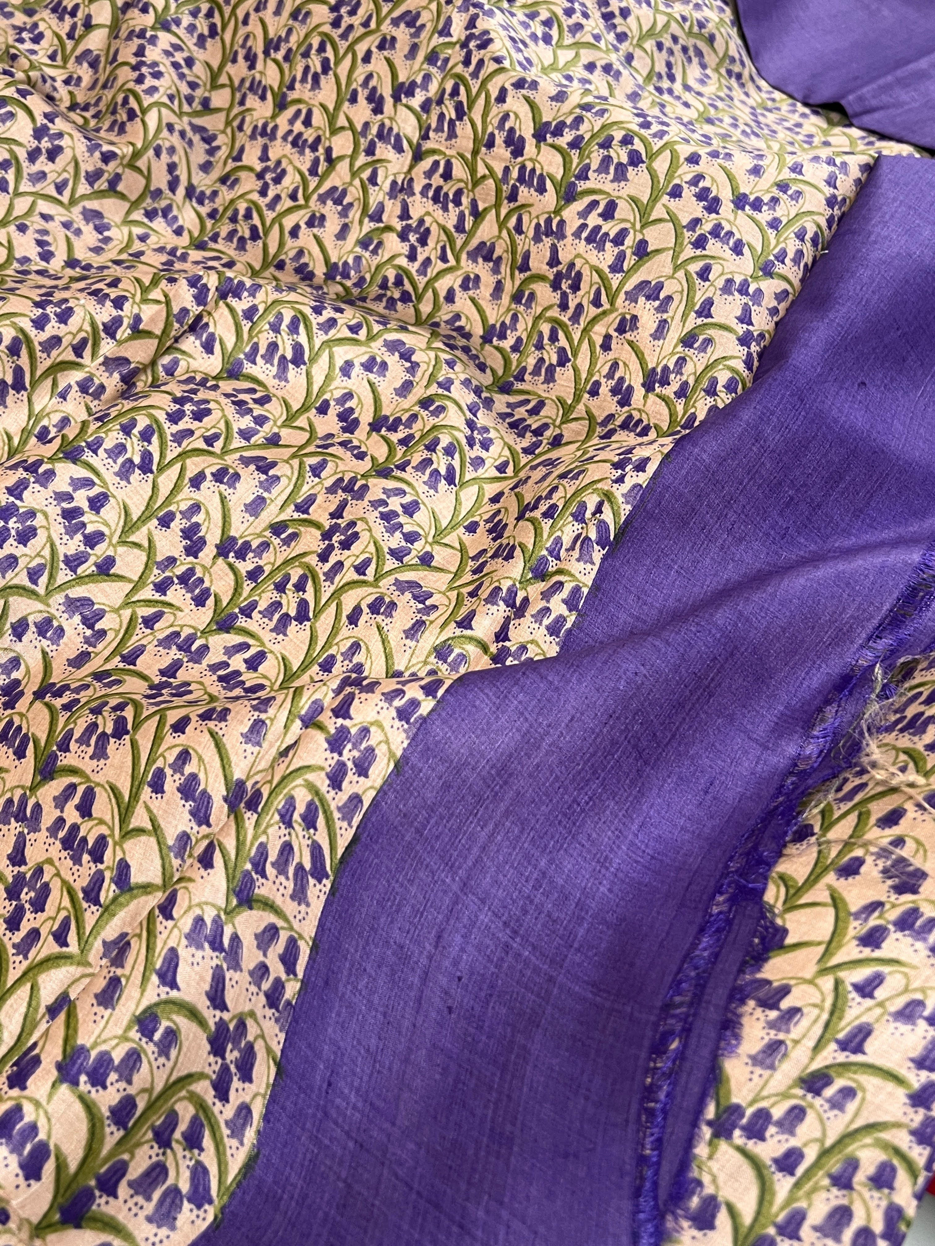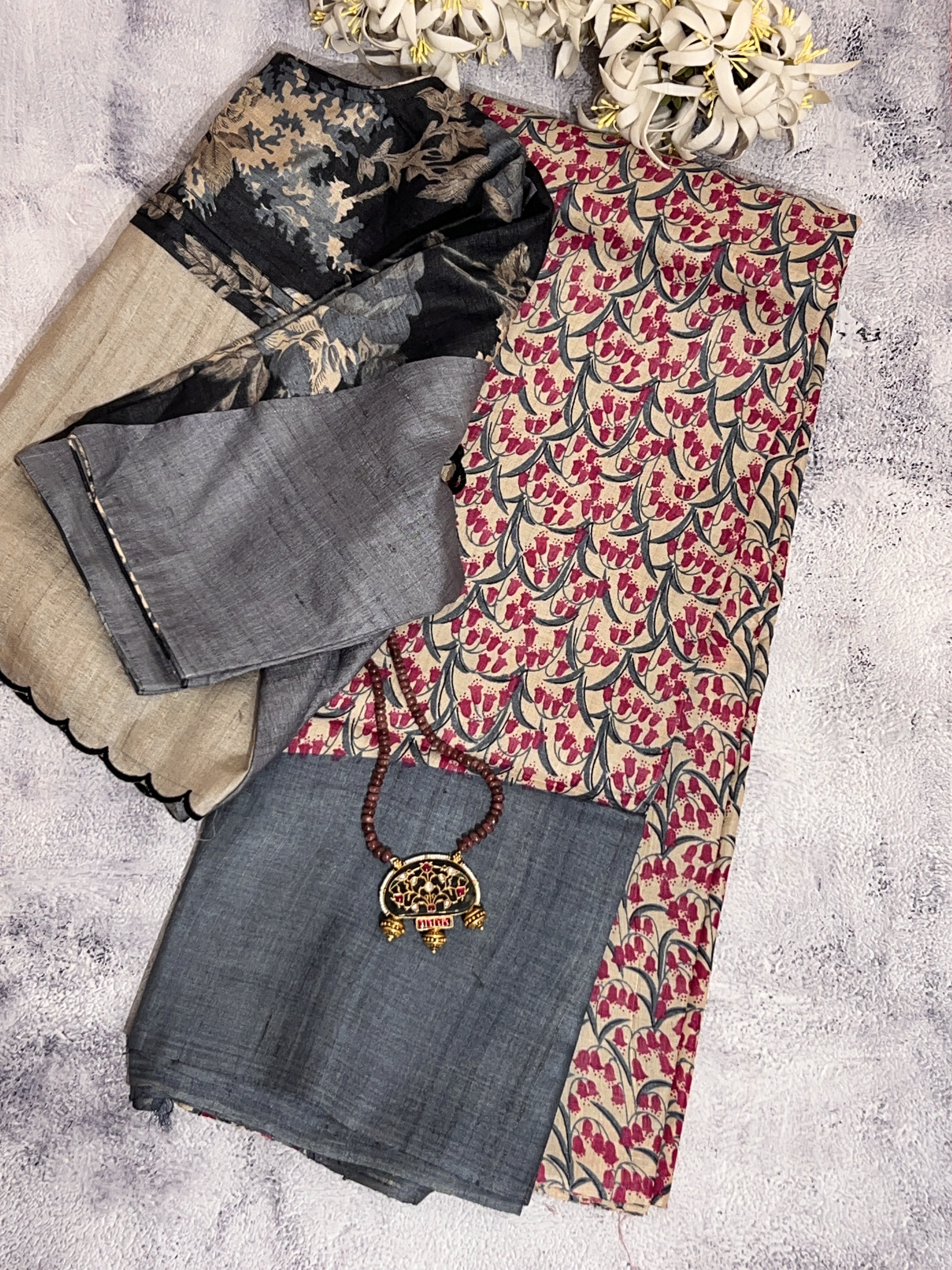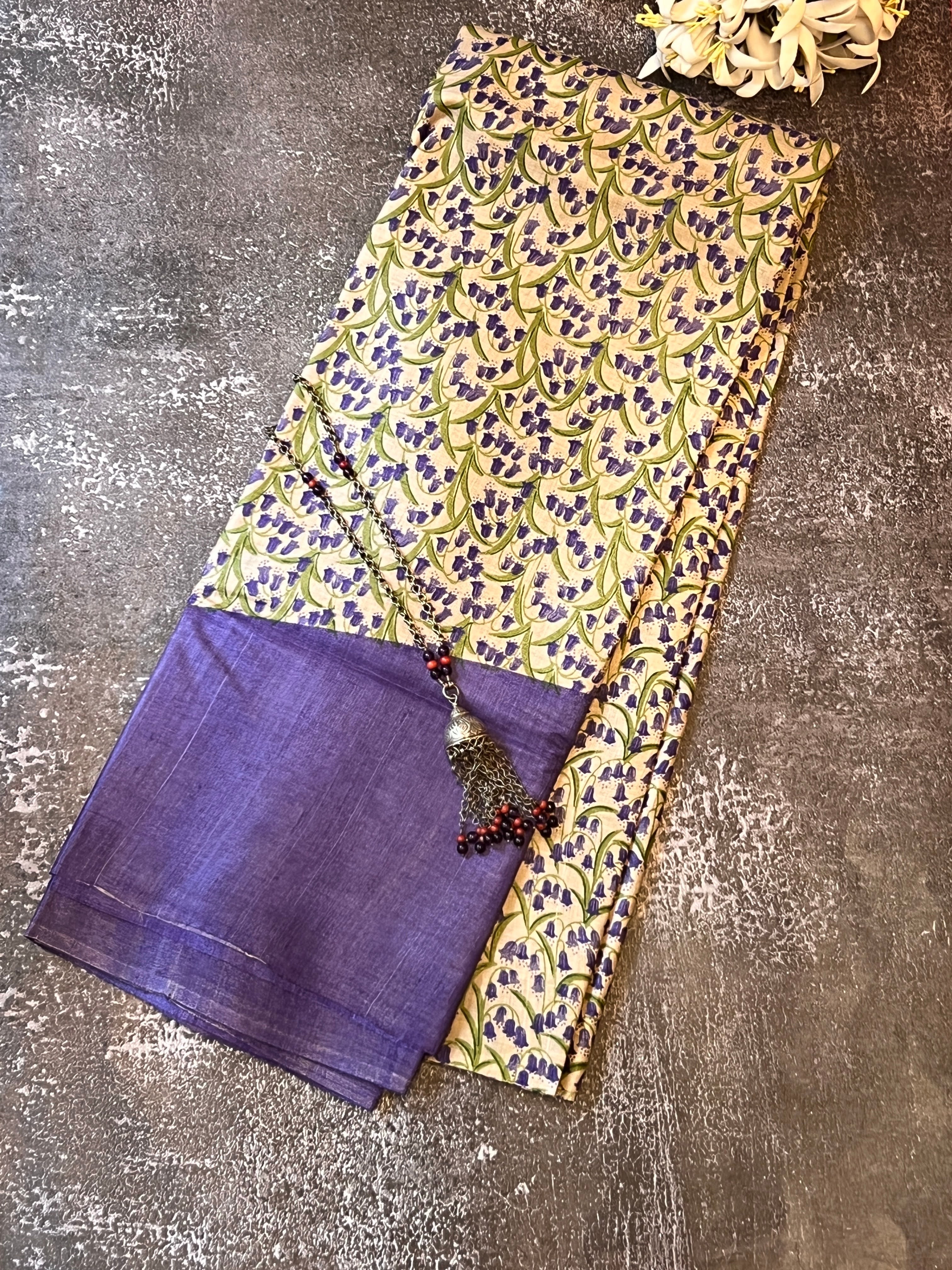 Handprinted tussar Completely woven by hand Contrast pallu and blouse piece Signature prints from Aavaranaa Dry clean only