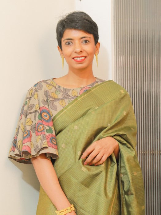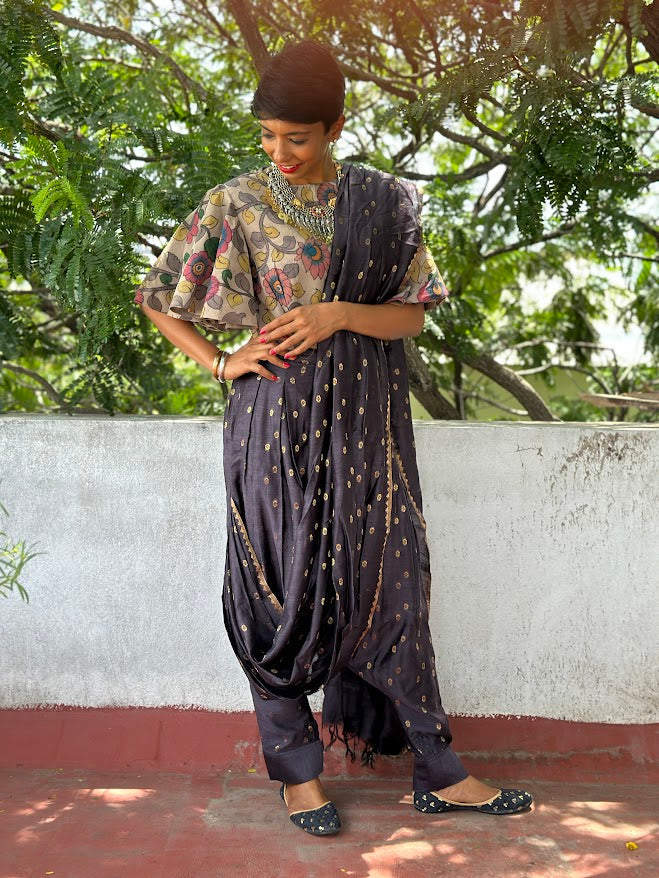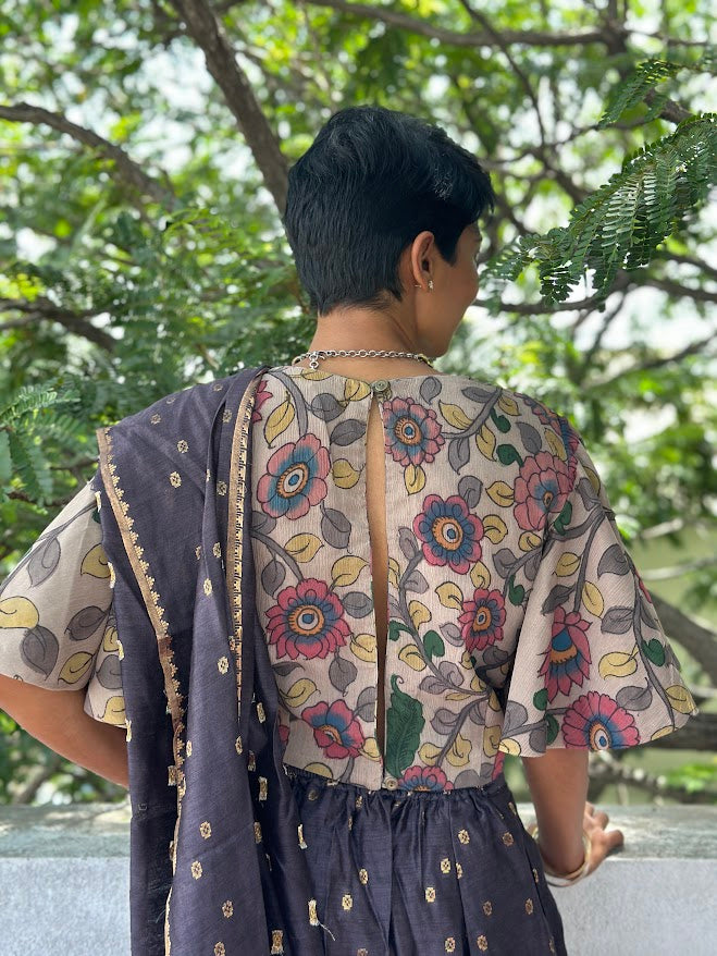 Handpainted kalamkari on chiffon Crafted by skilled artisans Pure chiffon Open at the back with a full slit Dry clean only