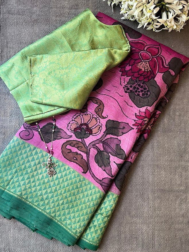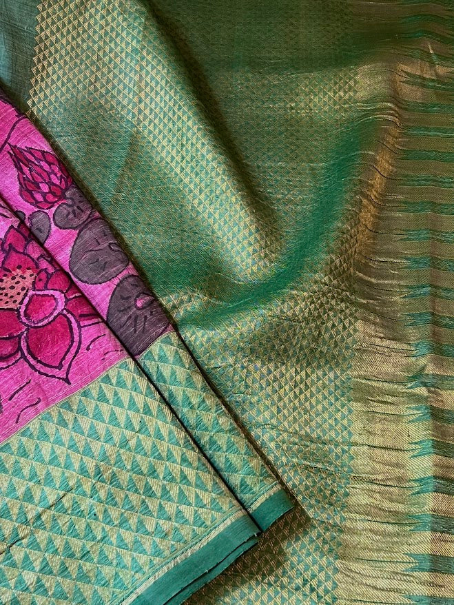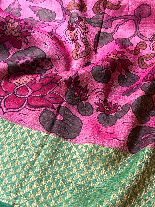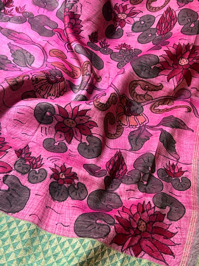 Kalpataru pink silk kalamkari saree Completely handwoven and handpainted using natural dyes Classic kuyil kann designs woven in pure zari on the border and pallu Contemporary colours of pastel pink and mint green Pure zari Unique and exclusive One of a kind To view other kalamkari sarees, please click on https://aavaranaa.com/product-tag/kalpataru/ Silk is made from the cocoon of silk worms. India has a rich heritage of silk weaving. Apart from Mulberry silk, India is known for producing tussar, muga and ahimsa silks. Some of these are wild and some of these are farmed commercially. Each of these silks has its own property when it comes to sheen, shine and wear. Being a natural fabric, silk does shed, wear and tear with age. However, caring for them ensures they have a long life. Silk Care & Wash# We recommend air drying silks after every use. Silks do not require washing after every wear unless soiled.# We recommend giving our sarees for dry cleaning for the first few washes.# Silk sarees can be washed at home using a gentle detergent or soap nuts. Avoid soaking & scrubbing these fabrics. Any stains should be dry cleaned.# Avoid tumble dry and instead line dry away from direct sunlight.# Silk sarees should be regularly worn to avoid fraying. If kept in humid or dry spaces for long without wear, silks are likely to deteriorate. So wear your sarees well.# If you are unable to wear them regularly, remove them and change folds from time to time. We do not recommend hanging them. If stacked, ensure there isn’t too much weight on the sarees.# Avoid using naphthalene balls or other chemicals while storing silks. Heavy silks may be stores in muslin bags.# If you can, roll them on wooden rods to store them wrinkle free. However, gentle folding works well too.