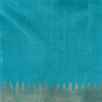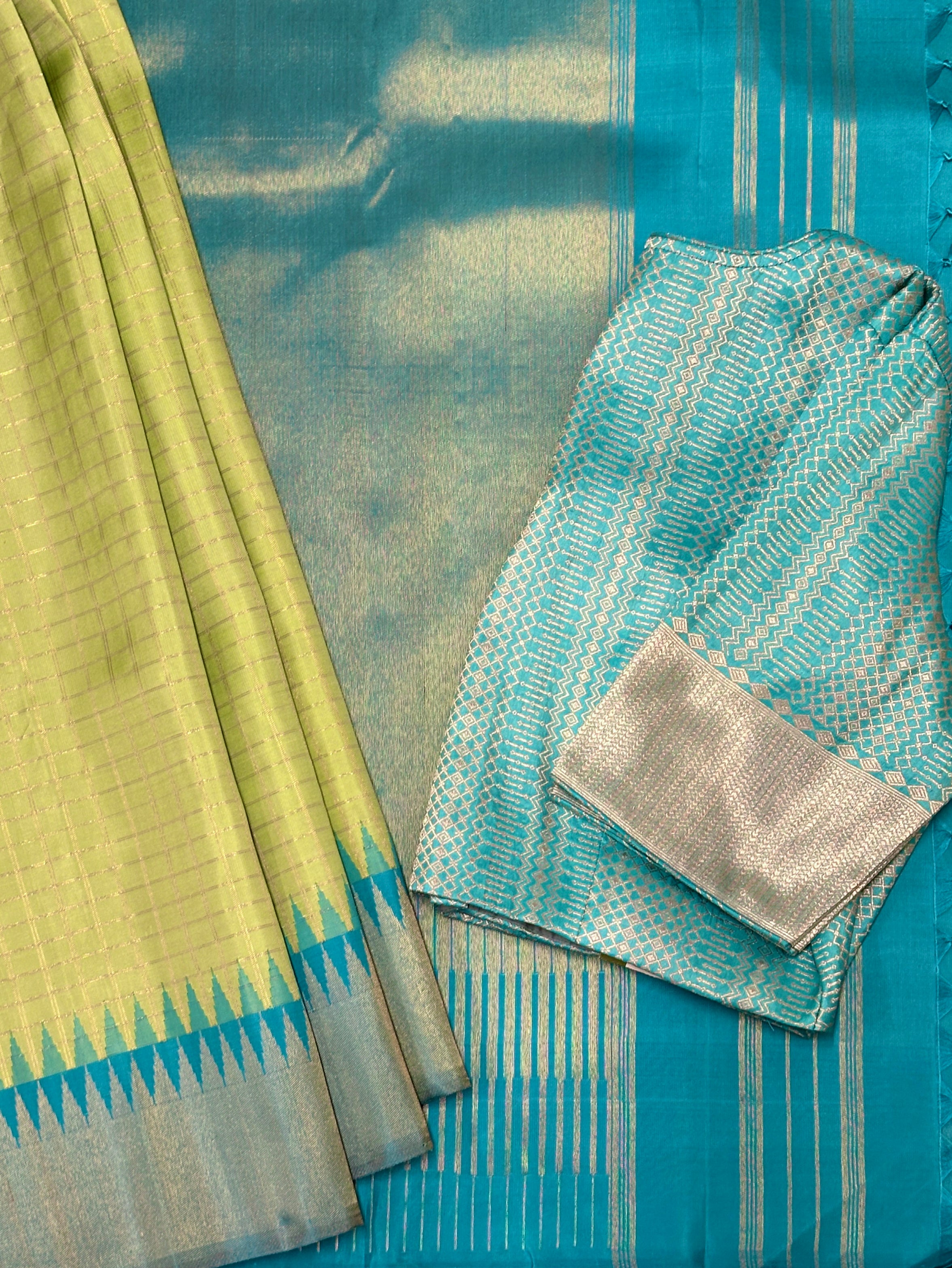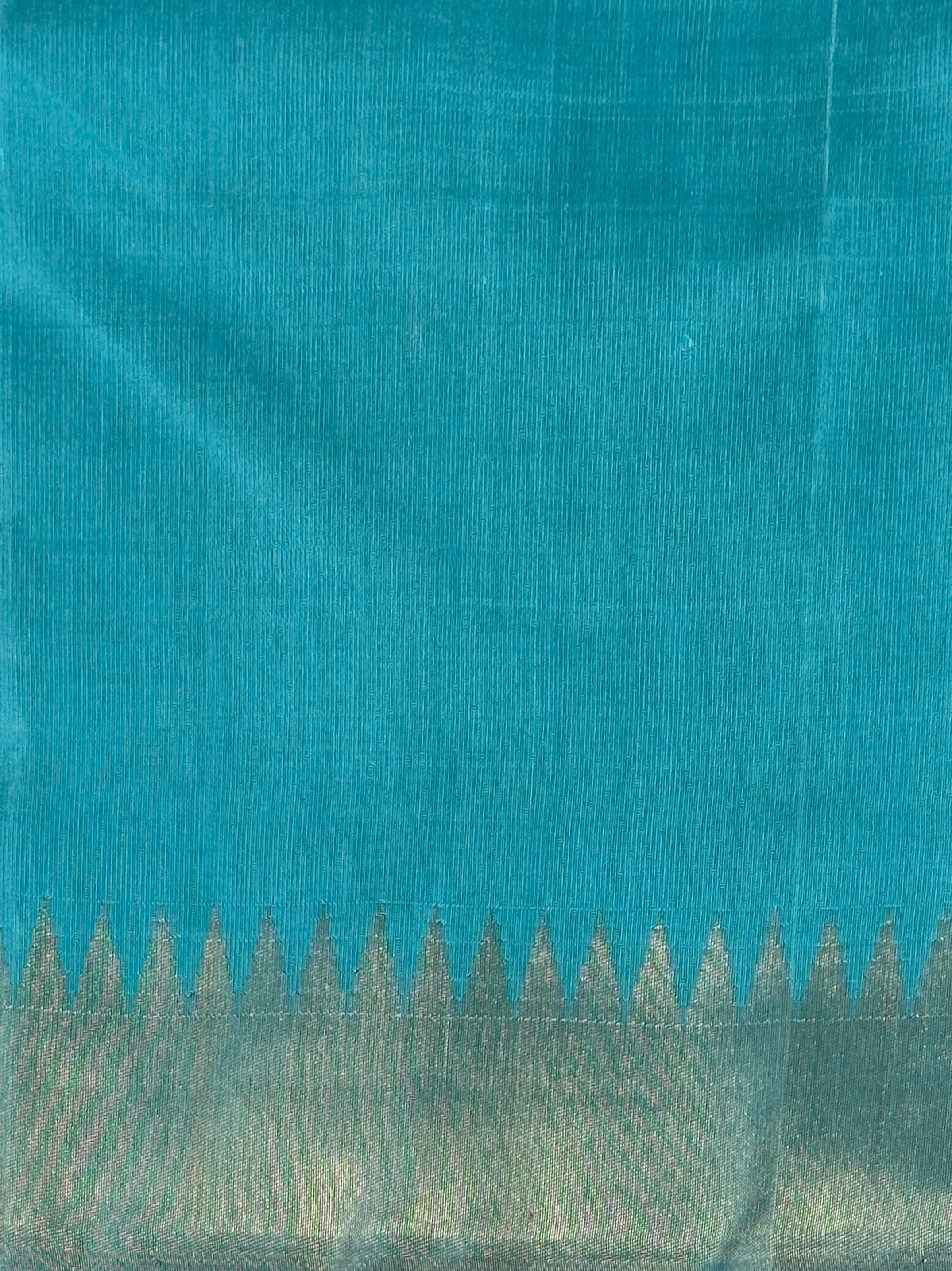Blue contrast blouse with temple border detailing on the sleeves, perfectly complementing the saree.