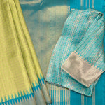 Color: Elegant light elachi green body complemented by a blue contrast blouse.