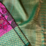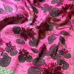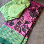 Kalpataru pink silk kalamkari saree Completely handwoven and handpainted using natural dyes Classic kuyil kann designs woven in pure zari on the border and pallu Contemporary colours of pastel pink and mint green Pure zari Unique and exclusive One of a kind To view other kalamkari sarees, please click on https://aavaranaa.com/product-tag/kalpataru/ Silk is made from the cocoon of silk worms. India has a rich heritage of silk weaving. Apart from Mulberry silk, India is known for producing tussar, muga and ahimsa silks. Some of these are wild and some of these are farmed commercially. Each of these silks has its own property when it comes to sheen, shine and wear. Being a natural fabric, silk does shed, wear and tear with age. However, caring for them ensures they have a long life. Silk Care & Wash# We recommend air drying silks after every use. Silks do not require washing after every wear unless soiled.# We recommend giving our sarees for dry cleaning for the first few washes.# Silk sarees can be washed at home using a gentle detergent or soap nuts. Avoid soaking & scrubbing these fabrics. Any stains should be dry cleaned.# Avoid tumble dry and instead line dry away from direct sunlight.# Silk sarees should be regularly worn to avoid fraying. If kept in humid or dry spaces for long without wear, silks are likely to deteriorate. So wear your sarees well.# If you are unable to wear them regularly, remove them and change folds from time to time. We do not recommend hanging them. If stacked, ensure there isn’t too much weight on the sarees.# Avoid using naphthalene balls or other chemicals while storing silks. Heavy silks may be stores in muslin bags.# If you can, roll them on wooden rods to store them wrinkle free. However, gentle folding works well too.