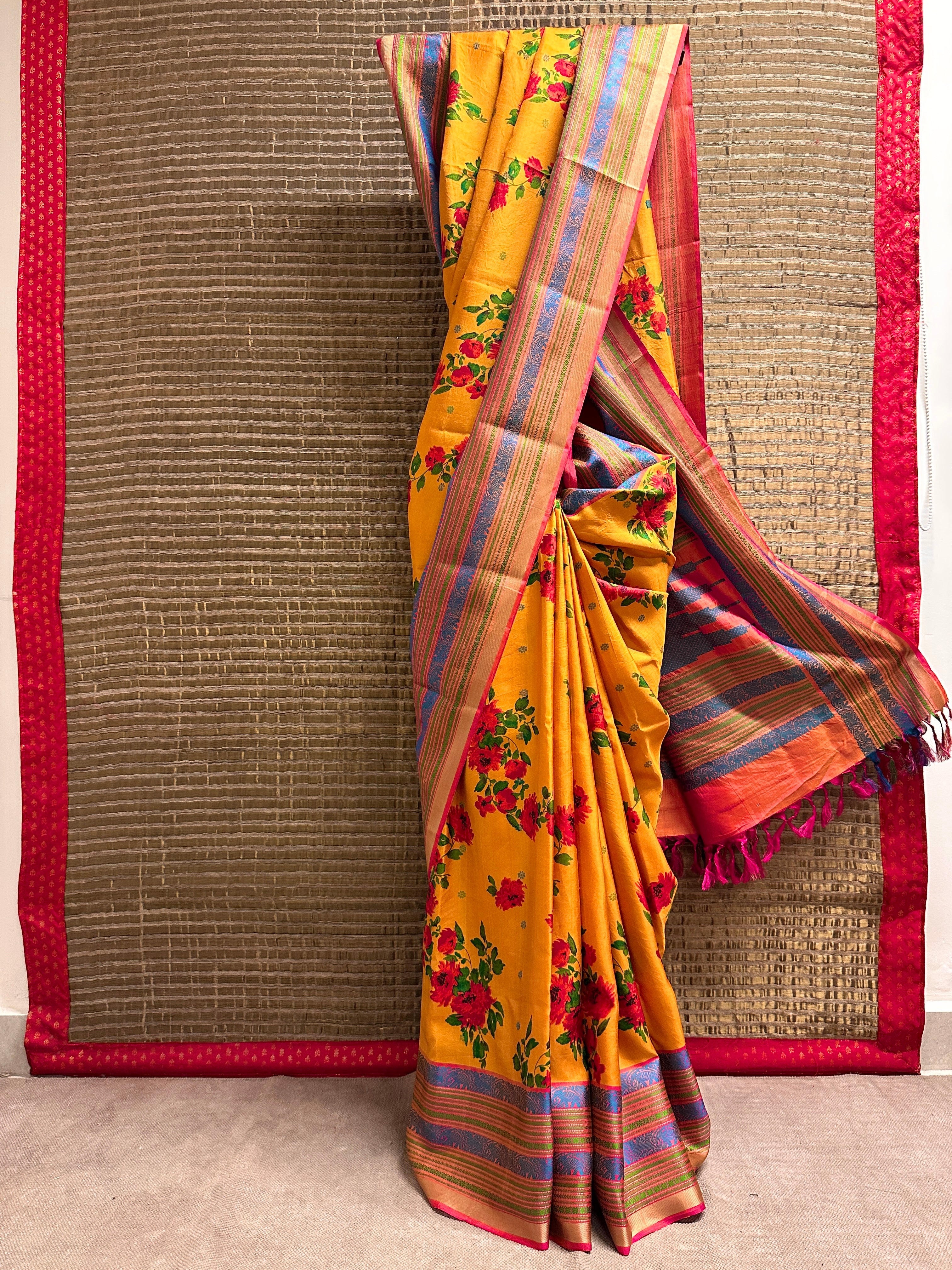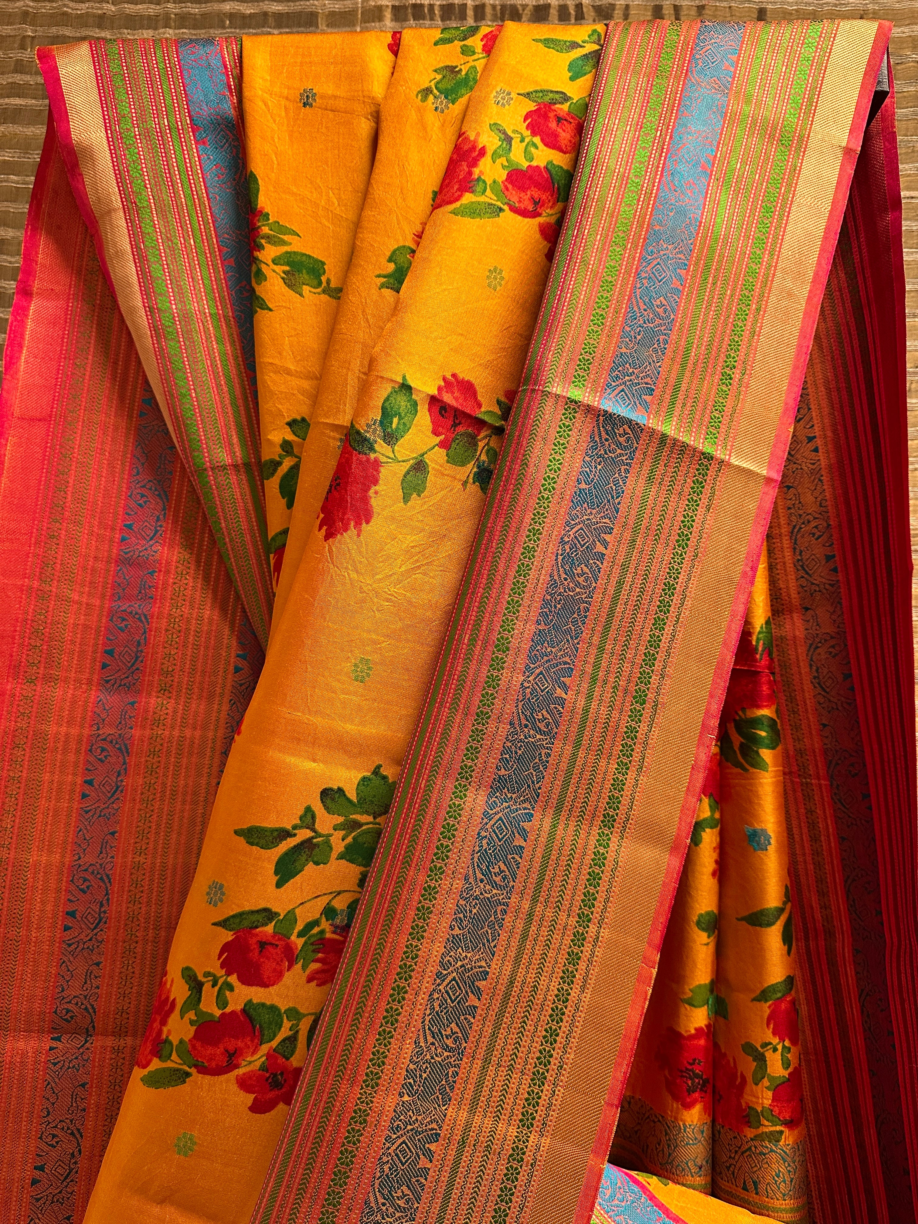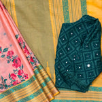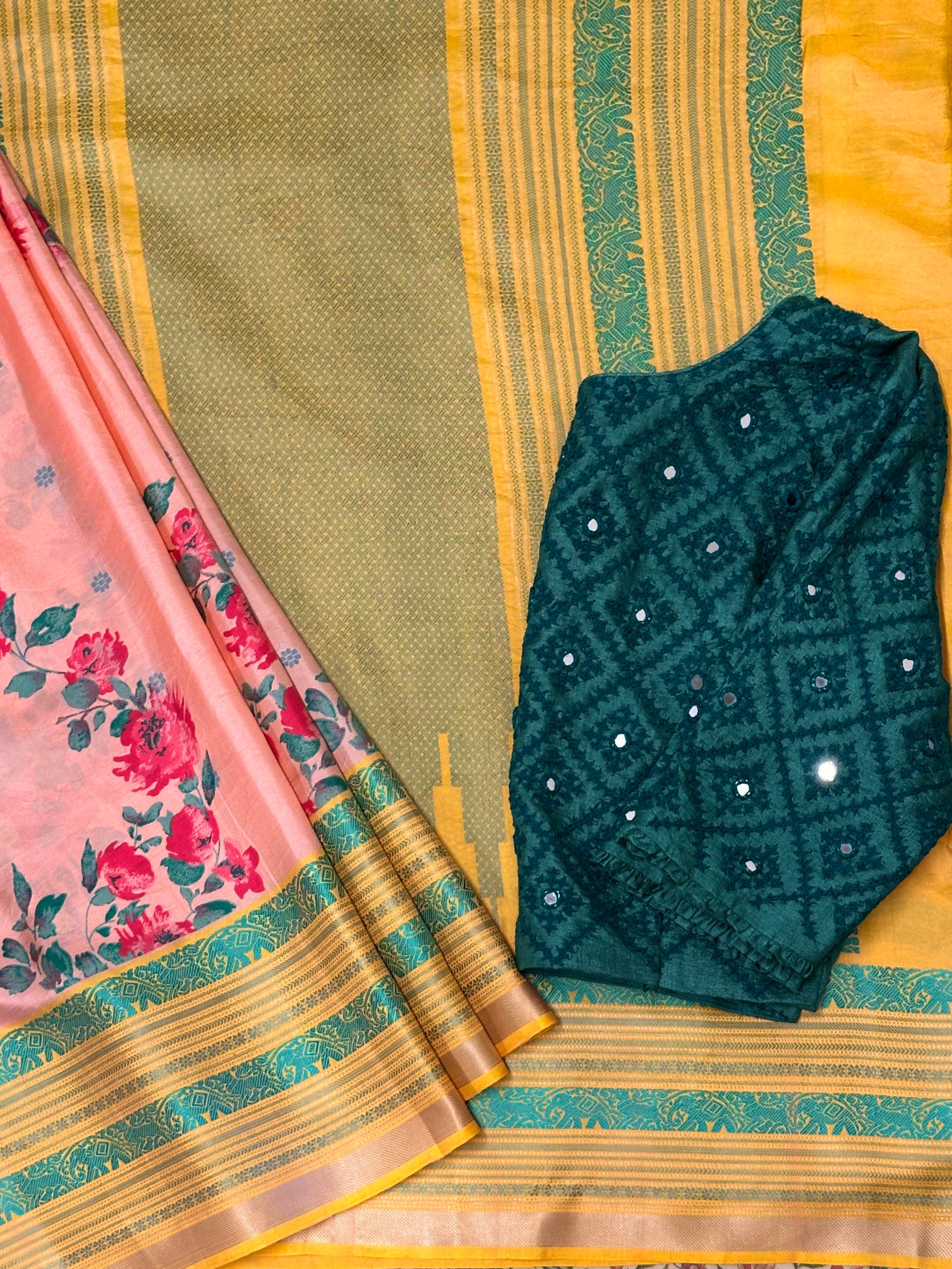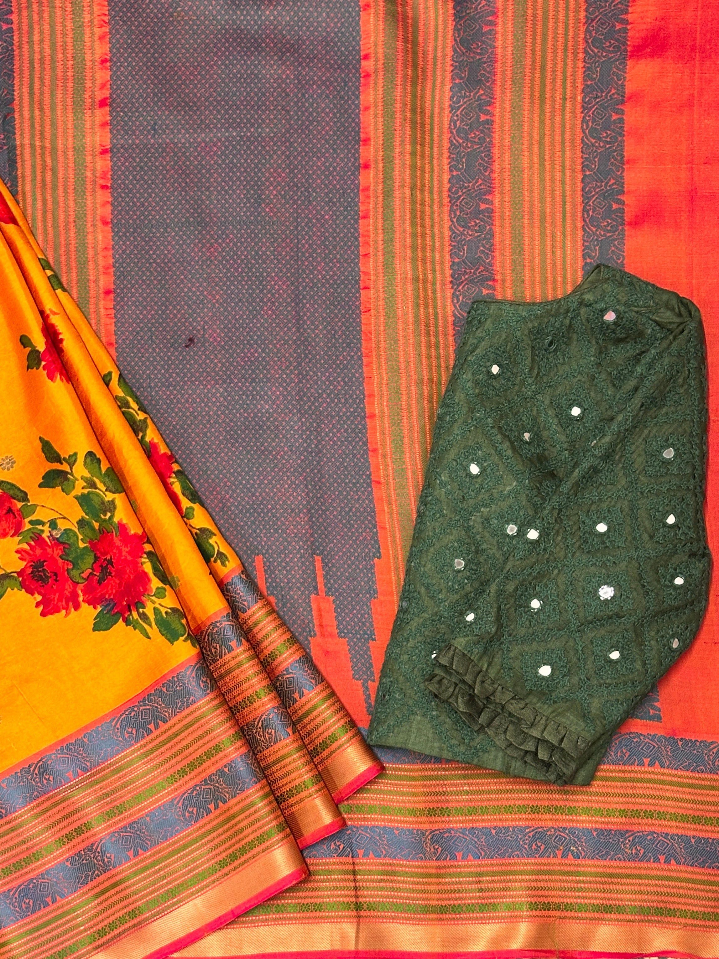 Comes with contrasting silk blouse that complements the saree perfectly.