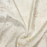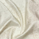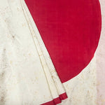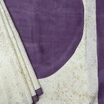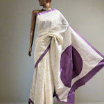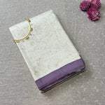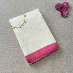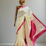- White silk saree with gold foil prints and a contrasting yellow selvage.