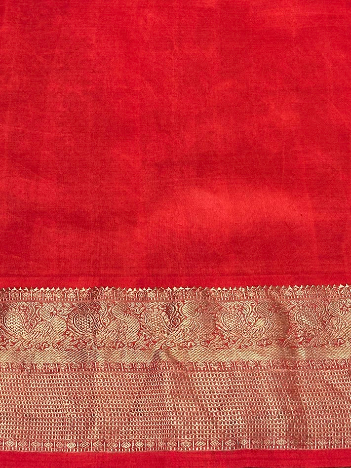 Simple gold zari border featuring a majestic peacock motif with long open feathers.