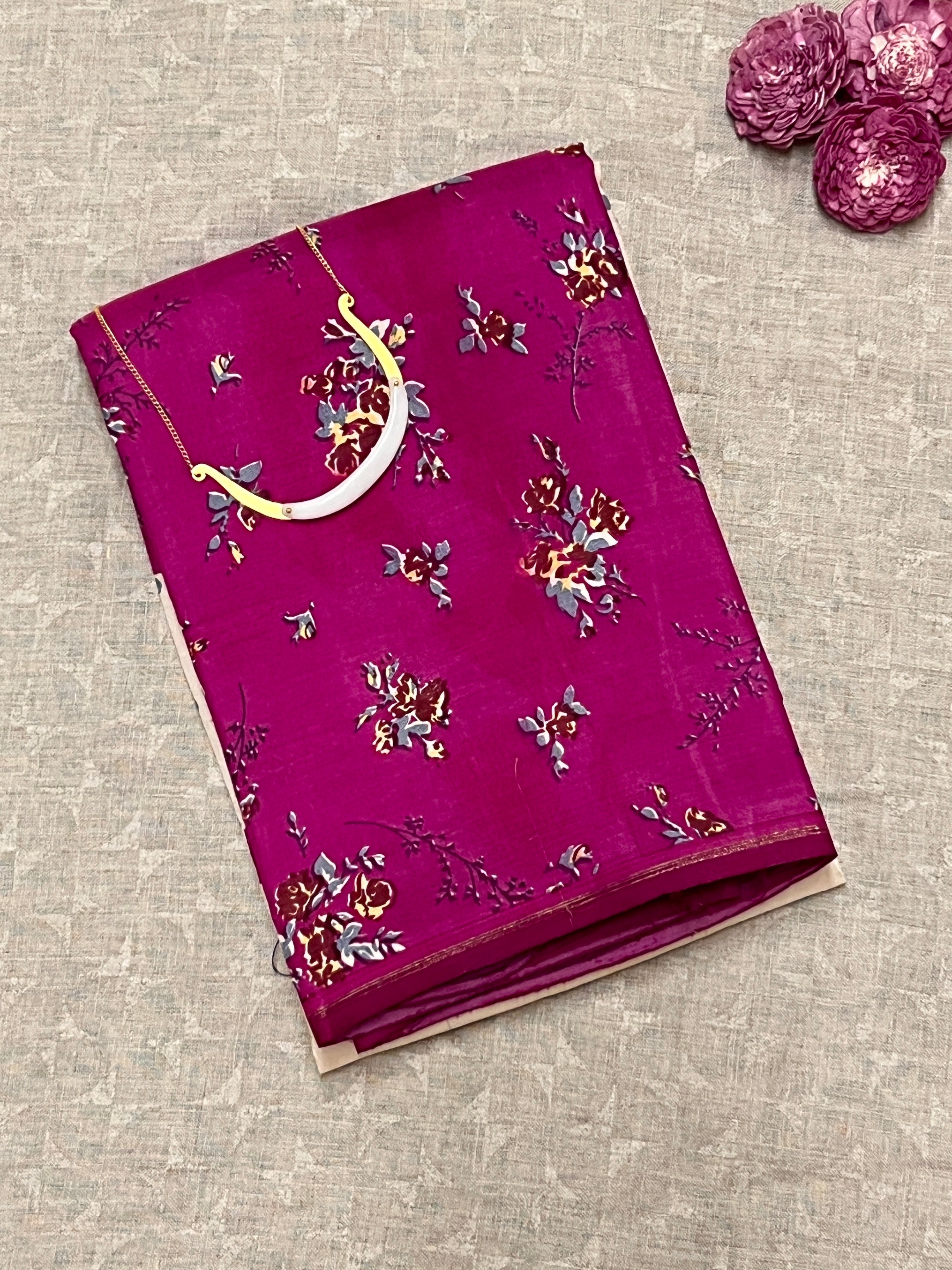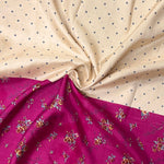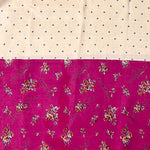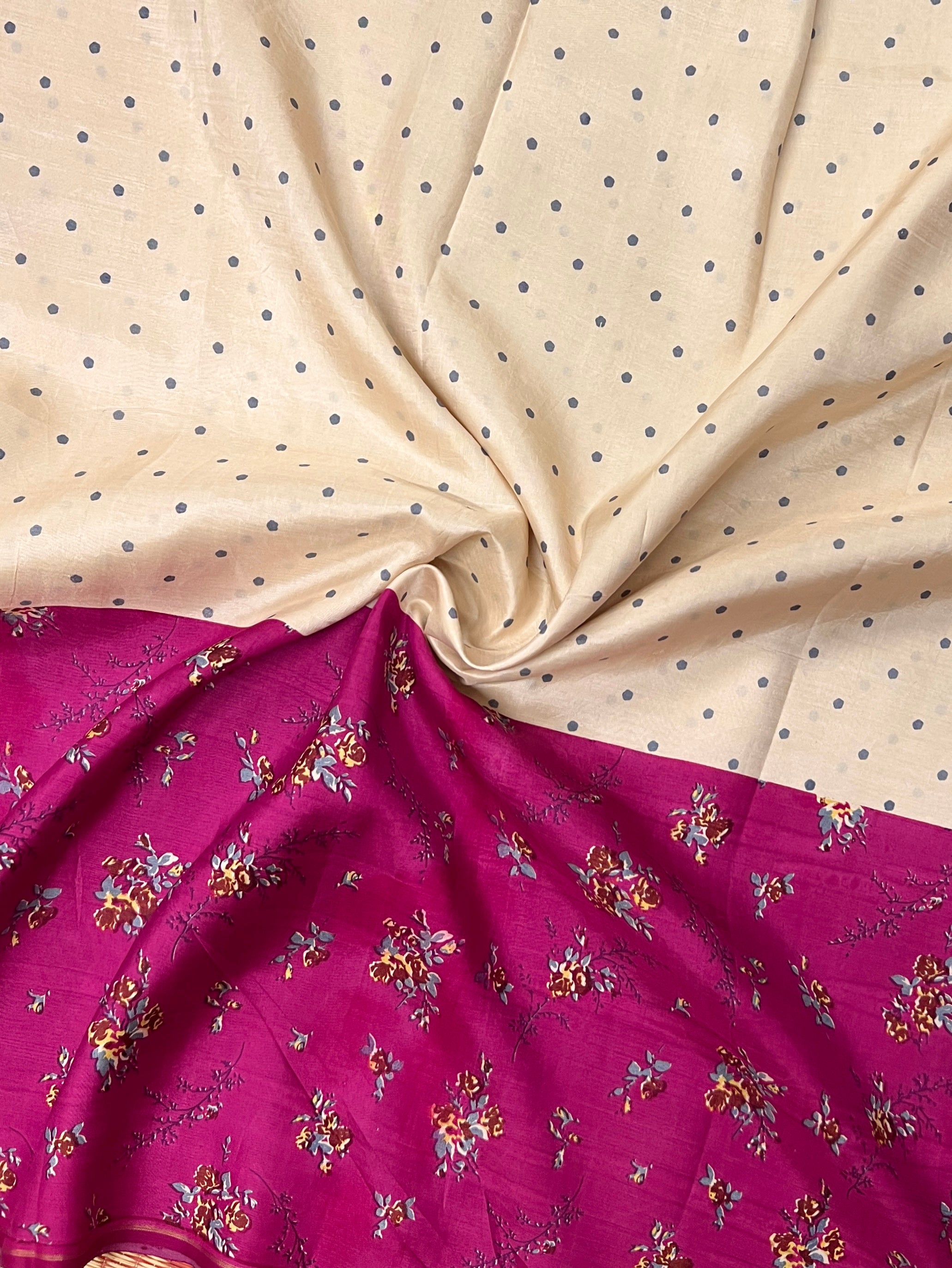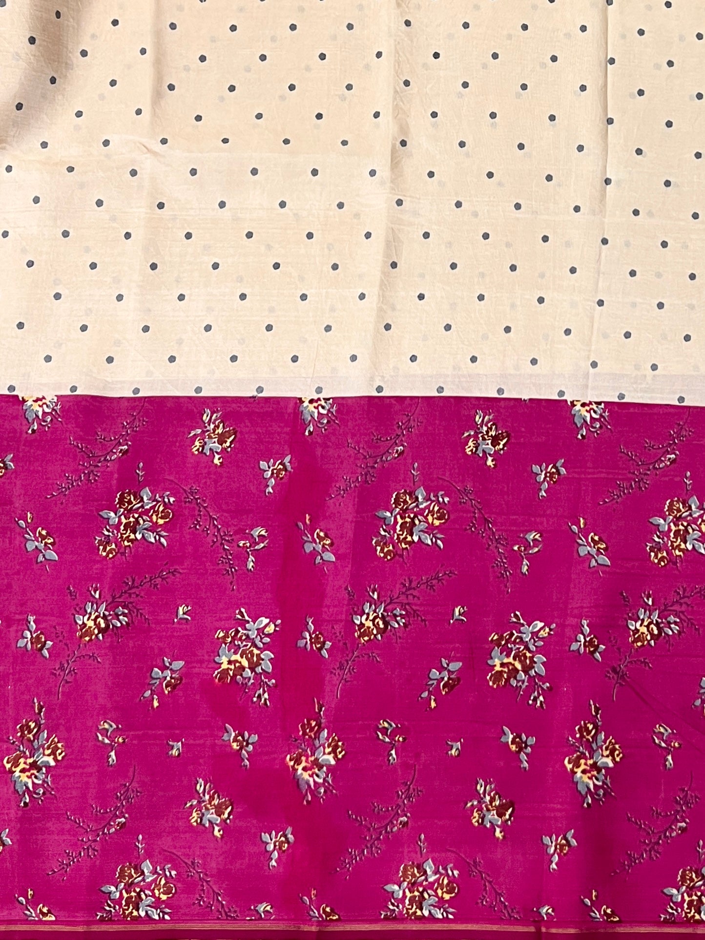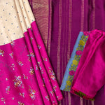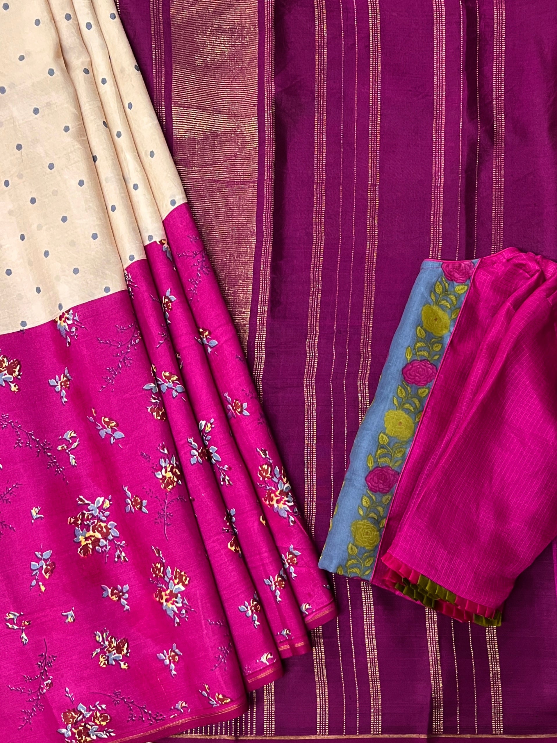 - Half and half saree with white featuring grey floral motifs and purple adorned with floral bouquet prints.