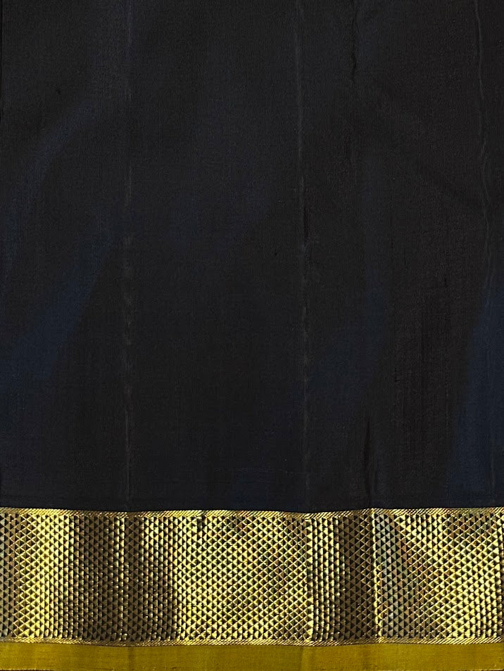 Border has a simple black triangle pattern with a refined olive-green selvedge crafted using Korvai technique for artisanal precision.