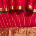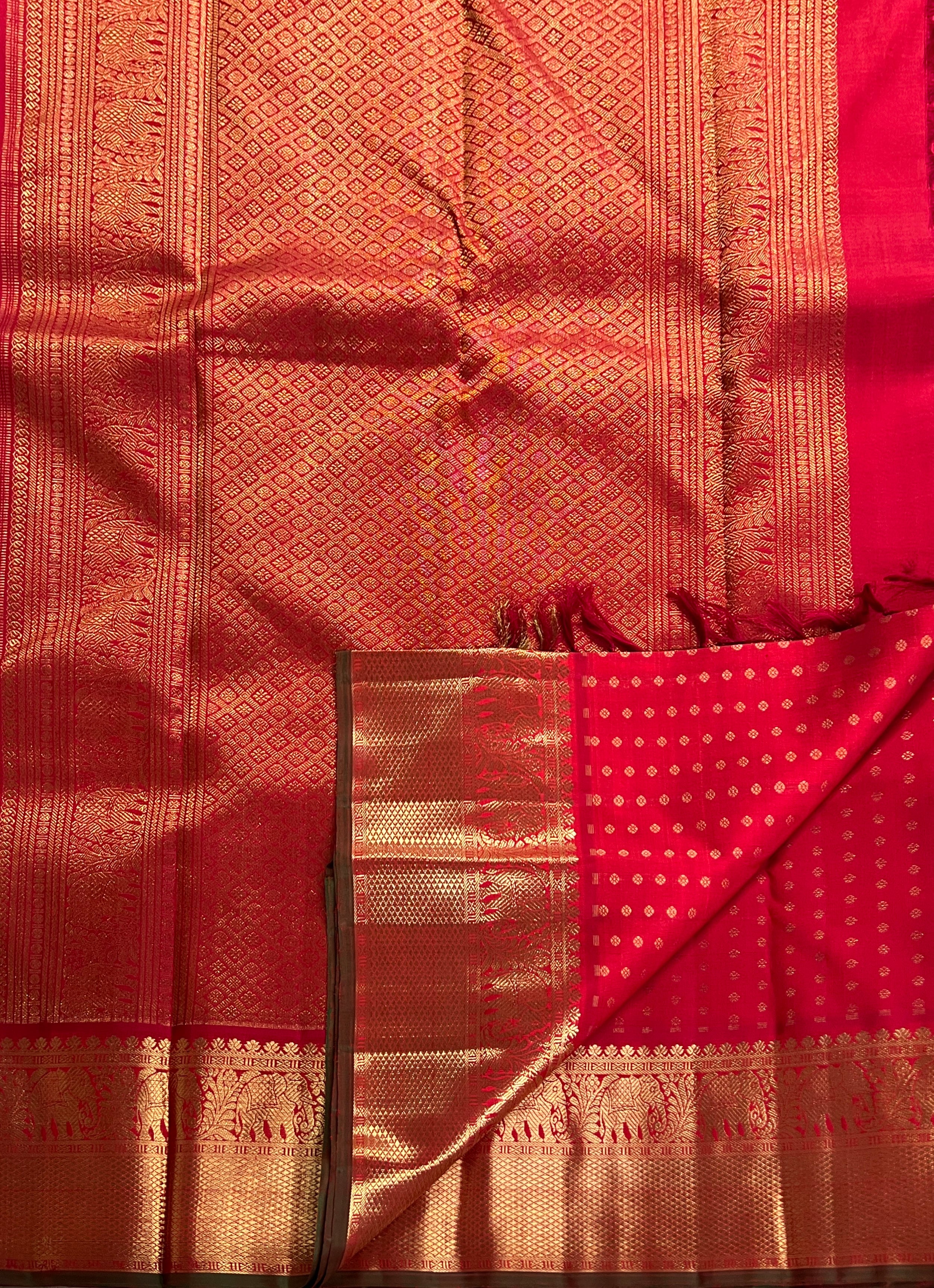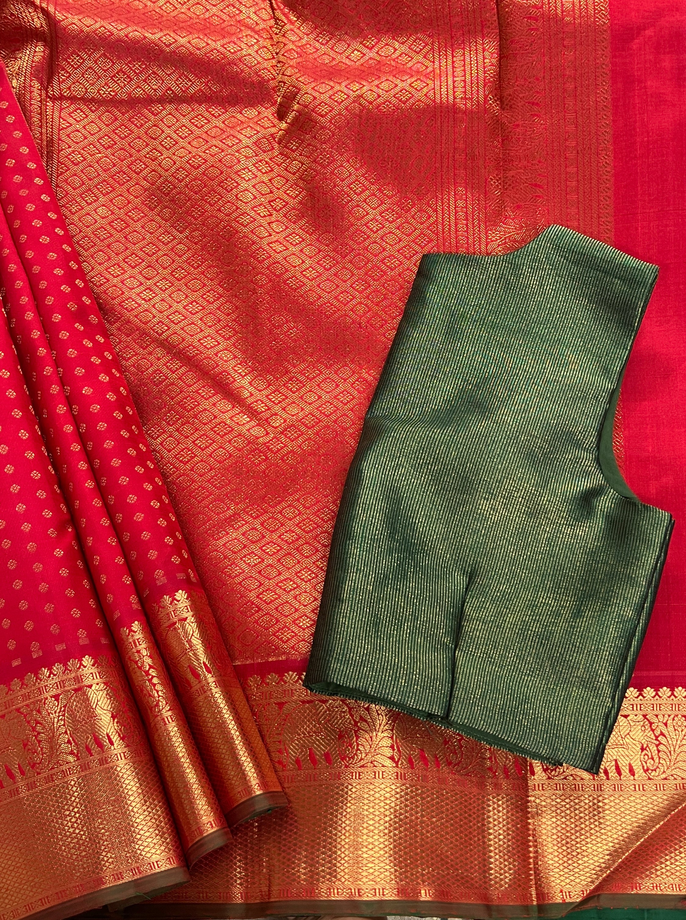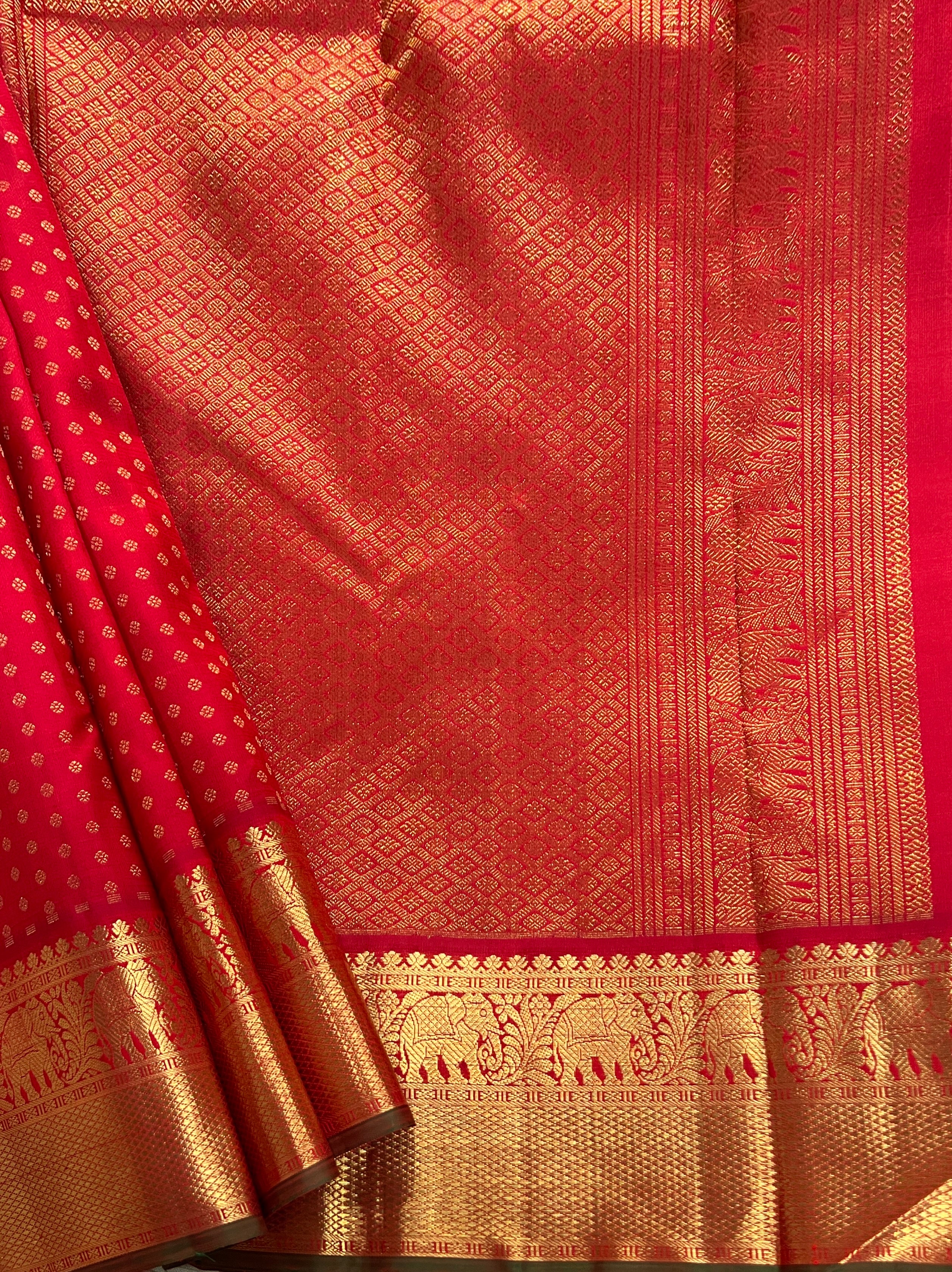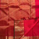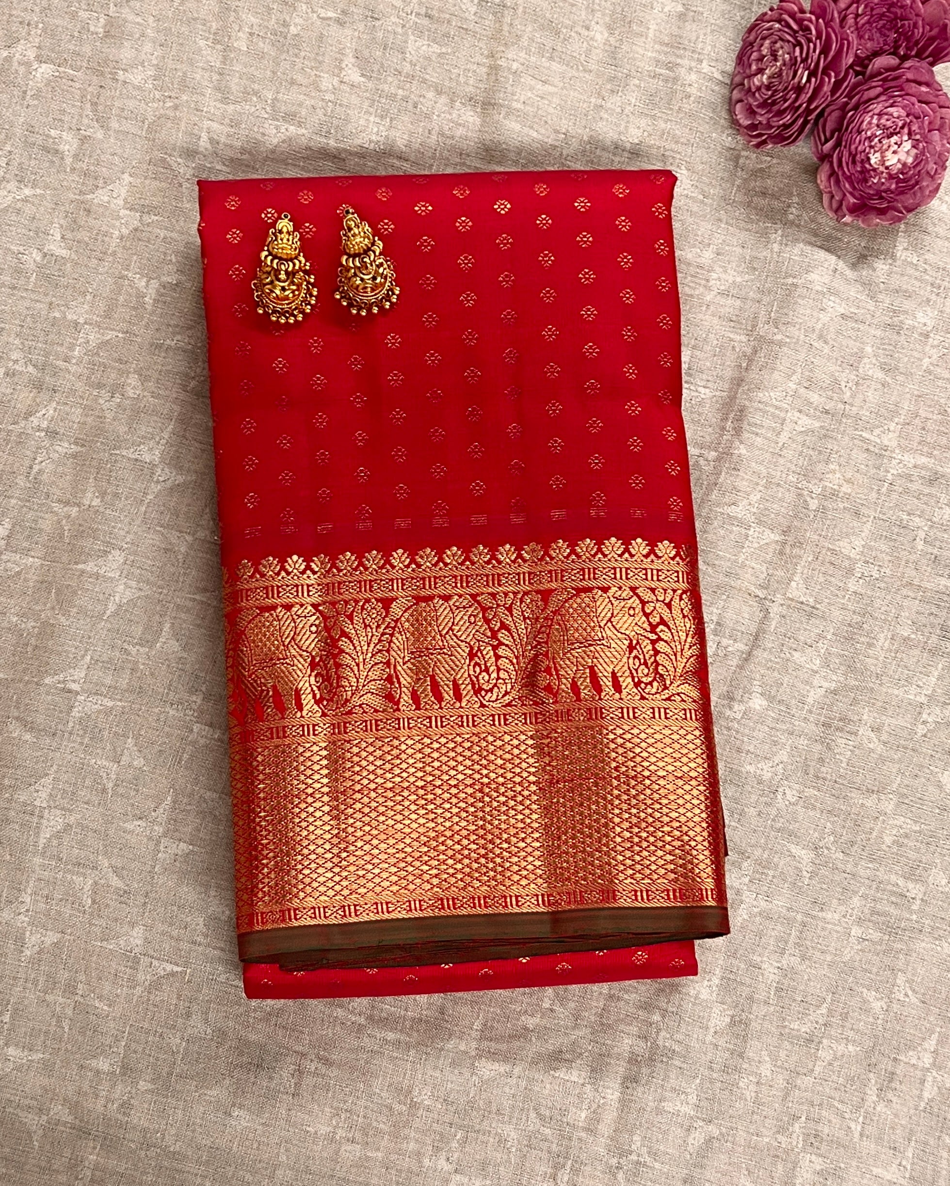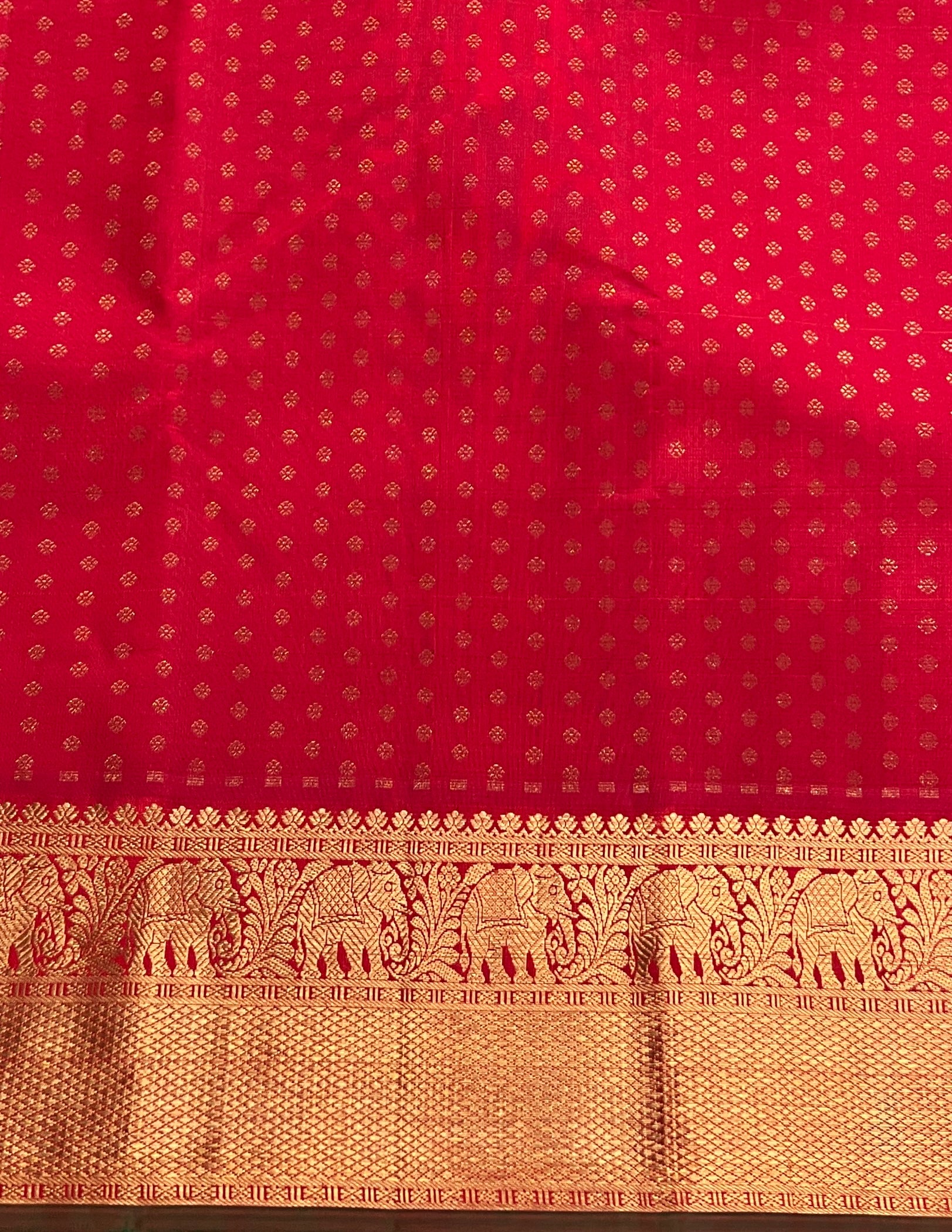Crafted from pure Kanchipuram silk, the saree features a vibrant red body embellished with delicate tiny floral motifs that add subtle charm.