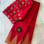 - Red body with authentic golden Zari border in temple design.