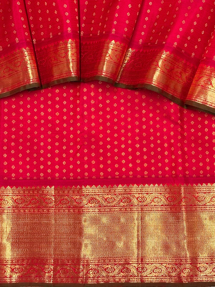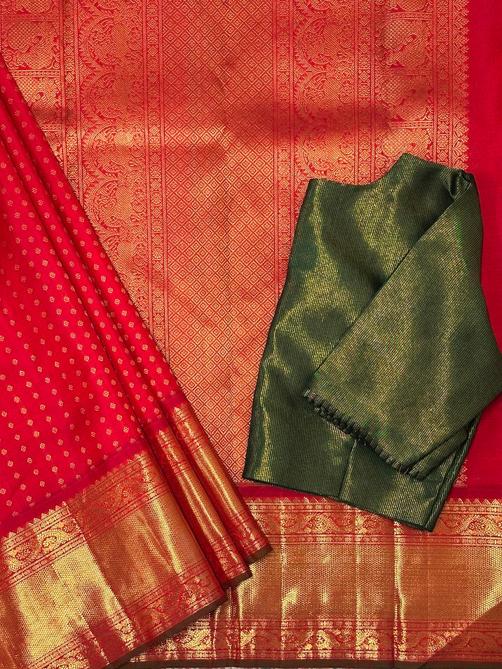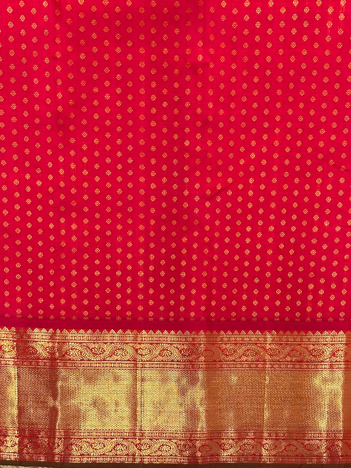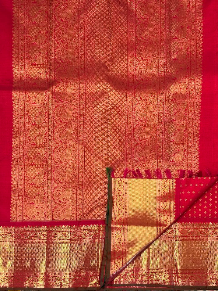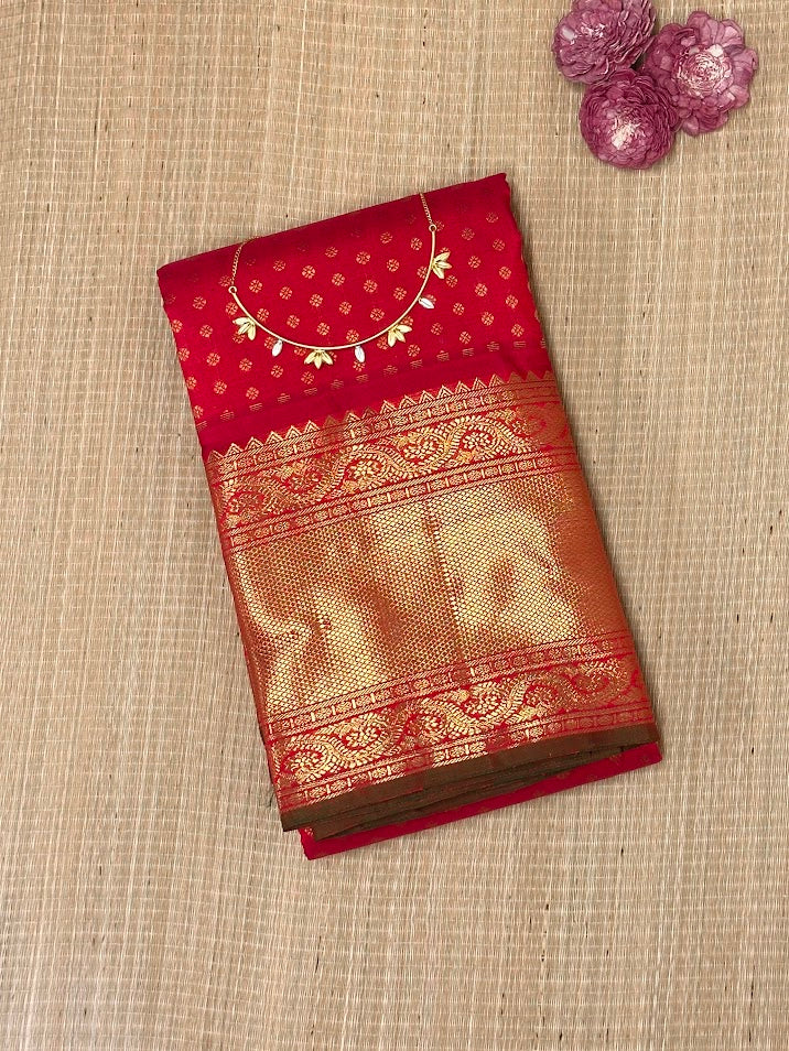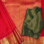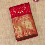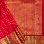 • Crafted from pure Kanchipuram silk, the saree features a vibrant red body embellished with delicate tiny floral motifs that add subtle charm.
