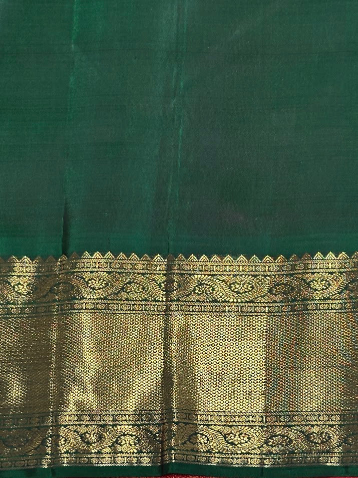 • A contrasting green selvage frames the saree, enhancing its visual appeal and adding a refreshing touch of colour.
