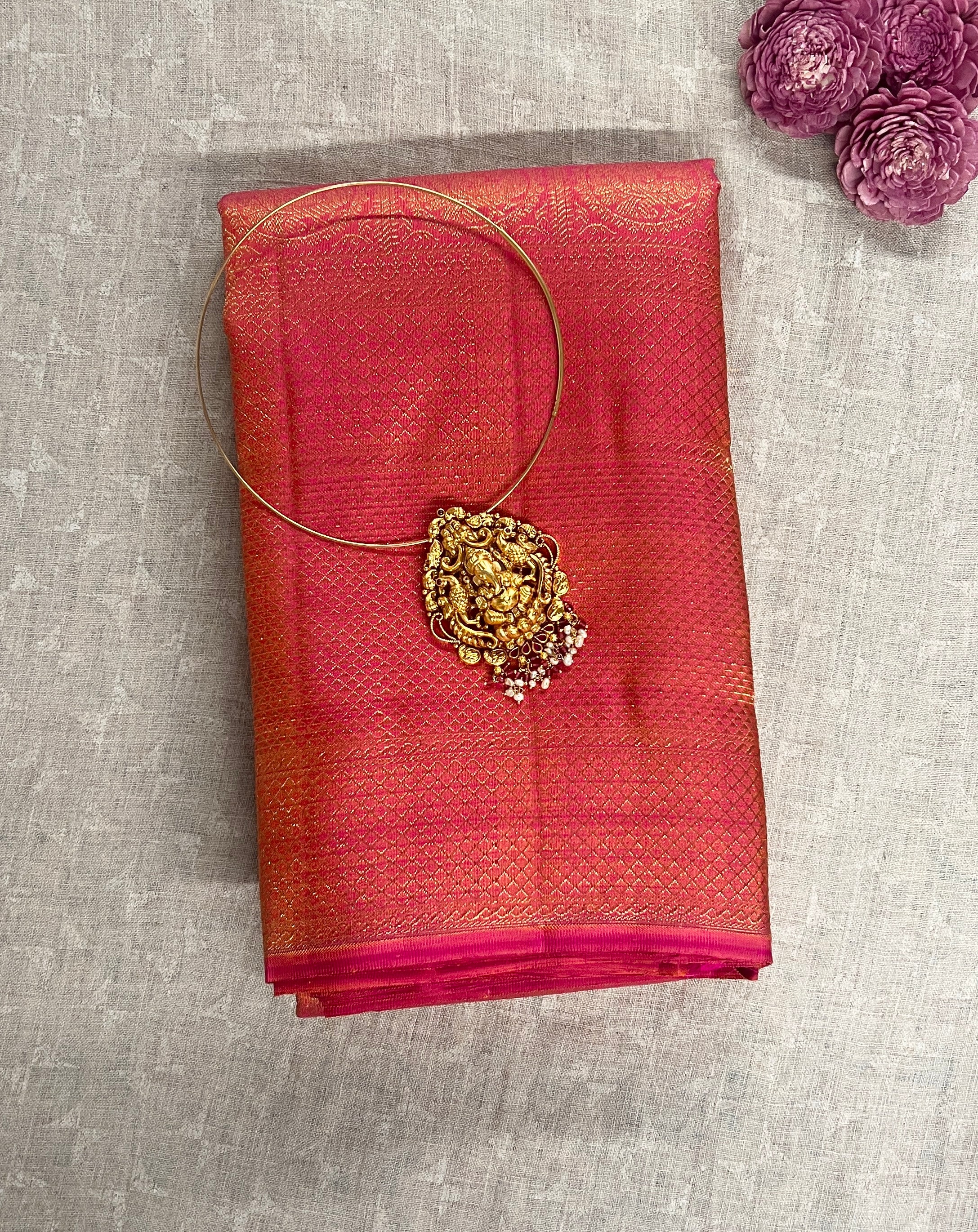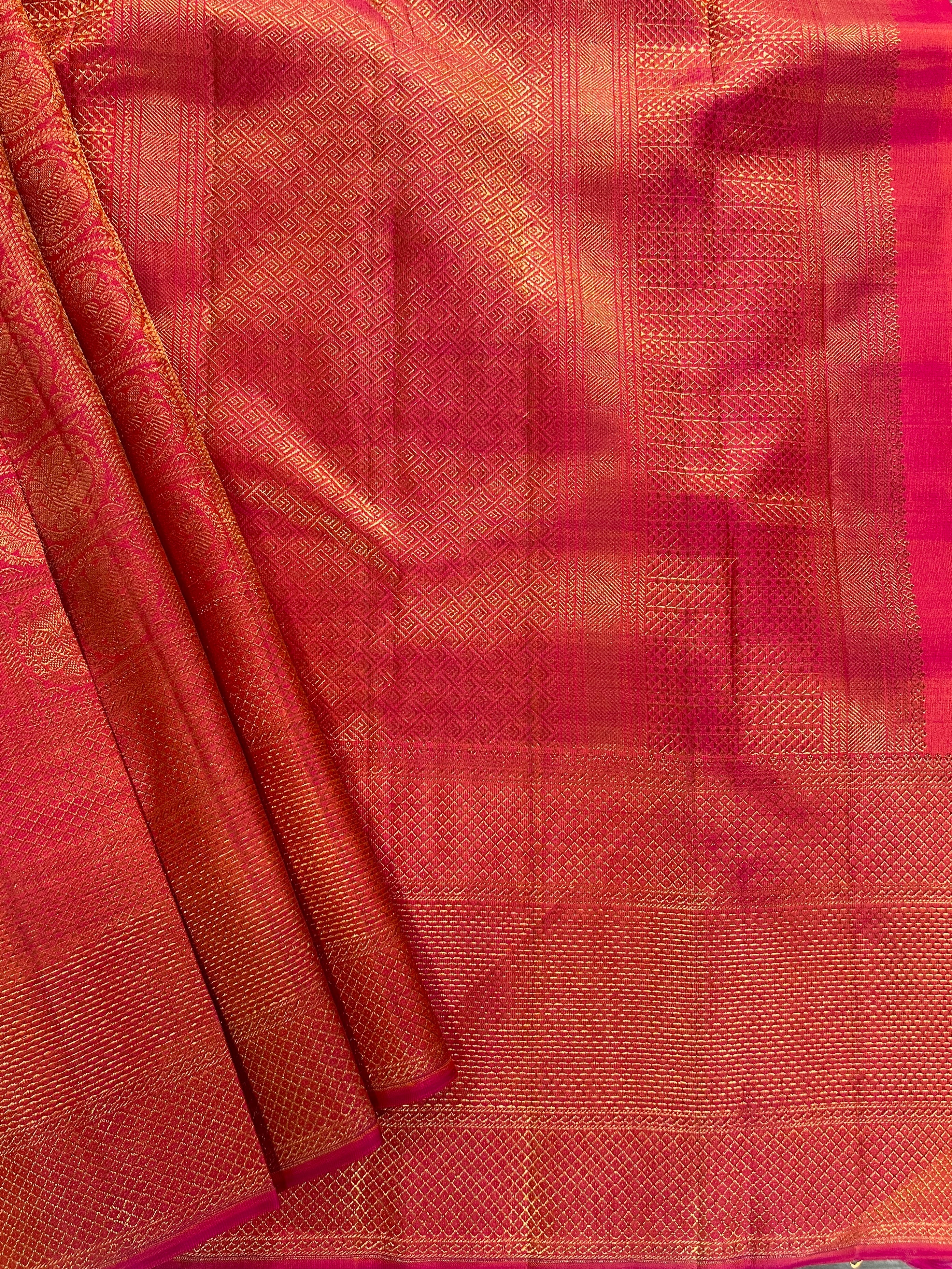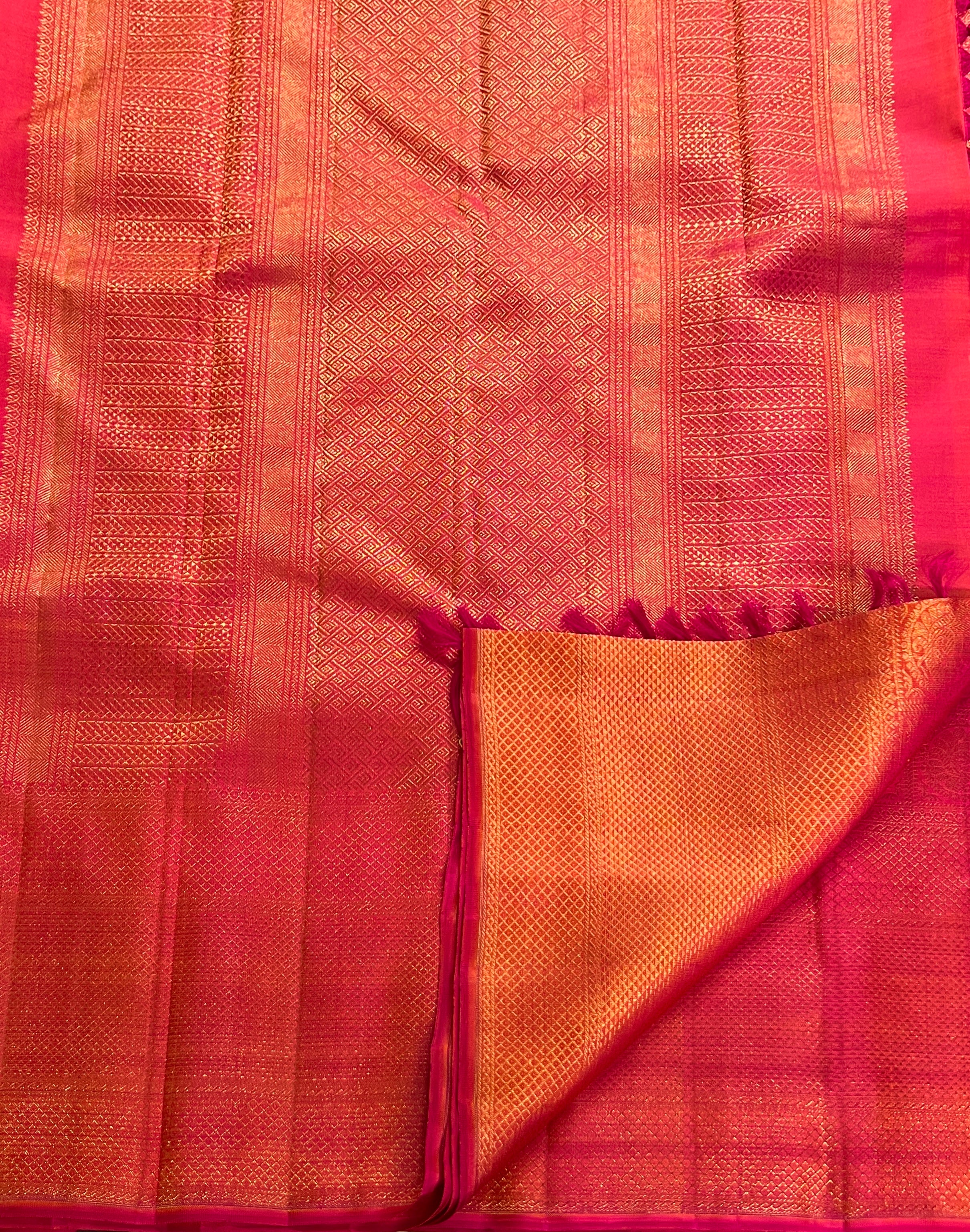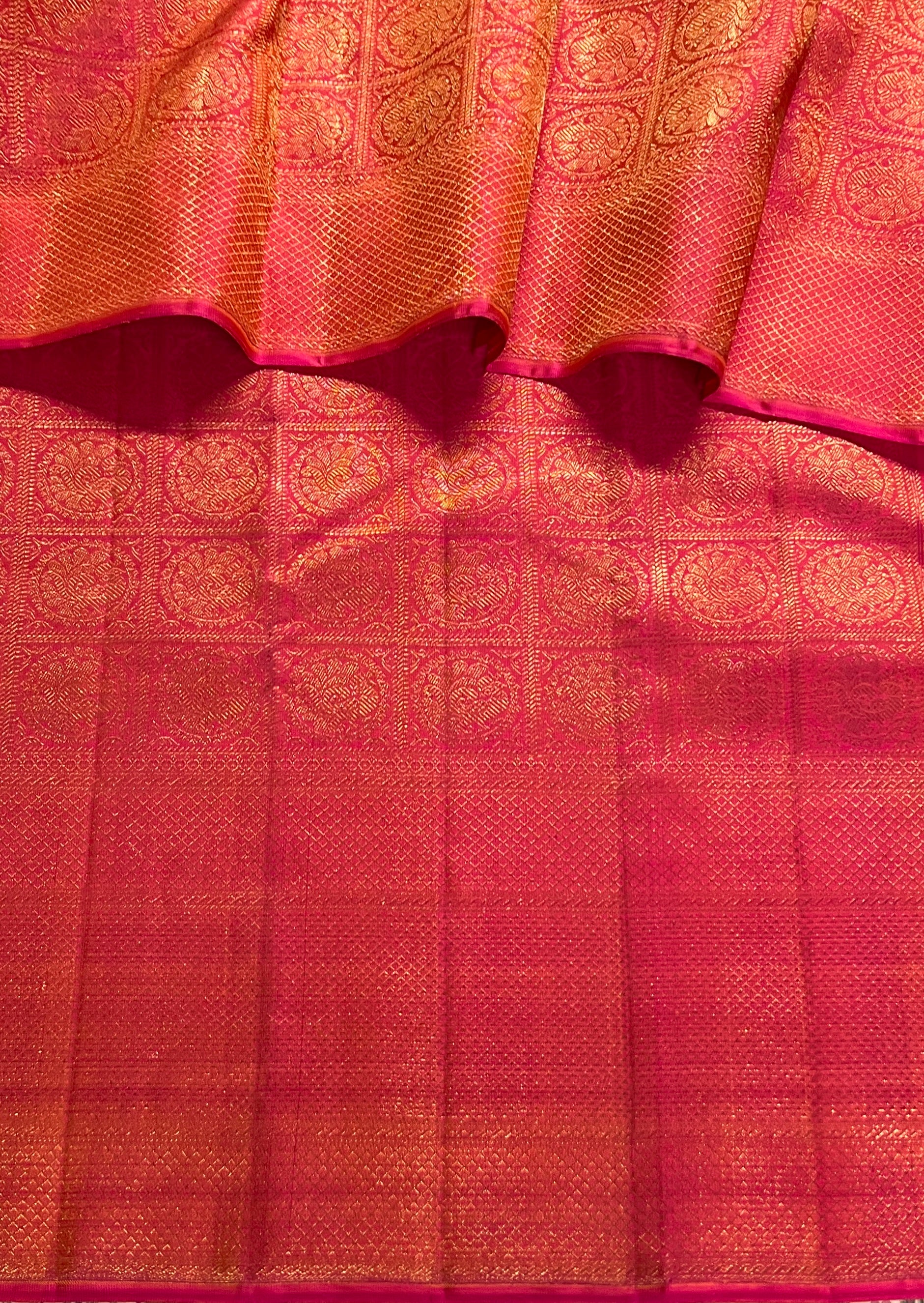 Stunning pink-orange dual-tone pure Kanchipuram silk saree.