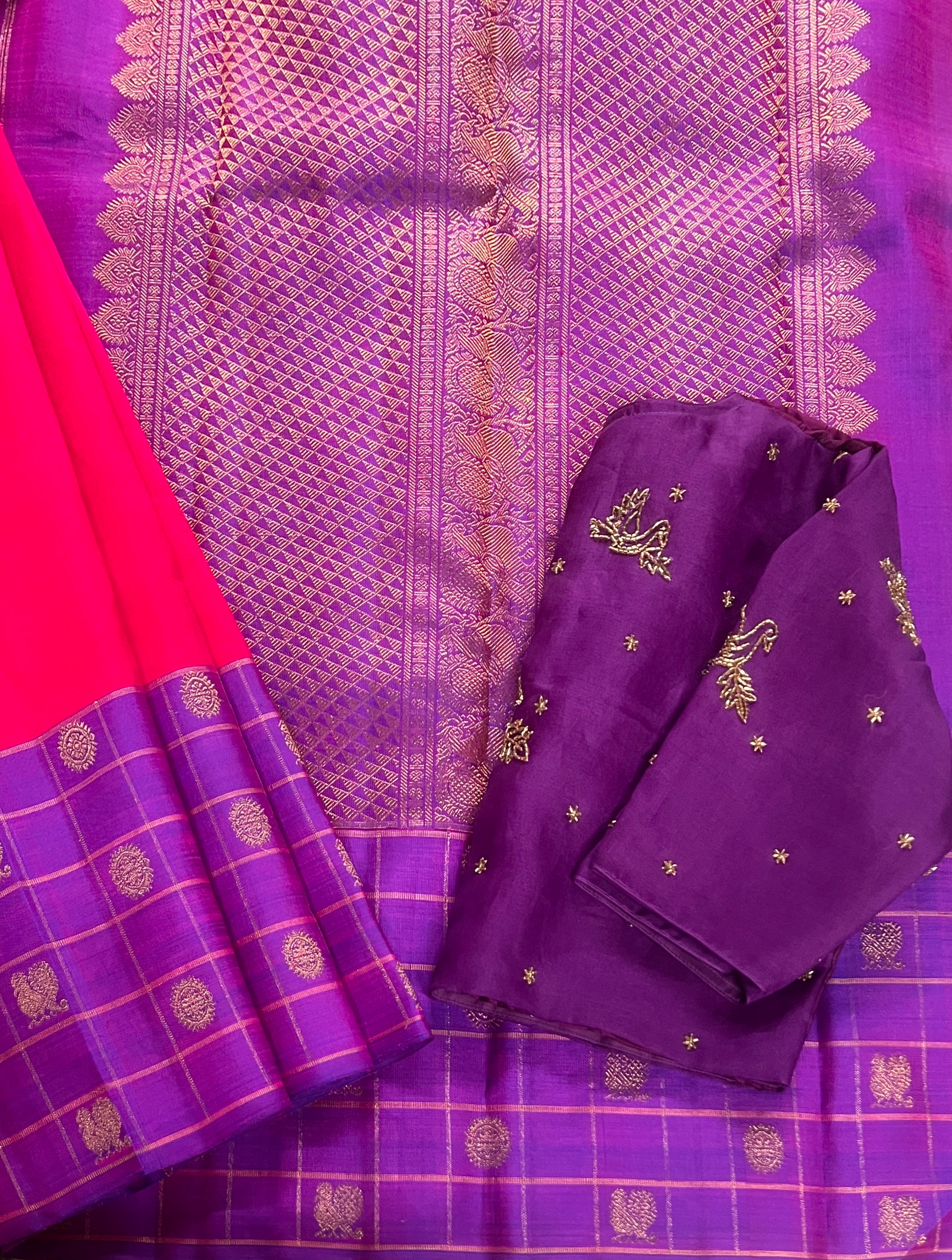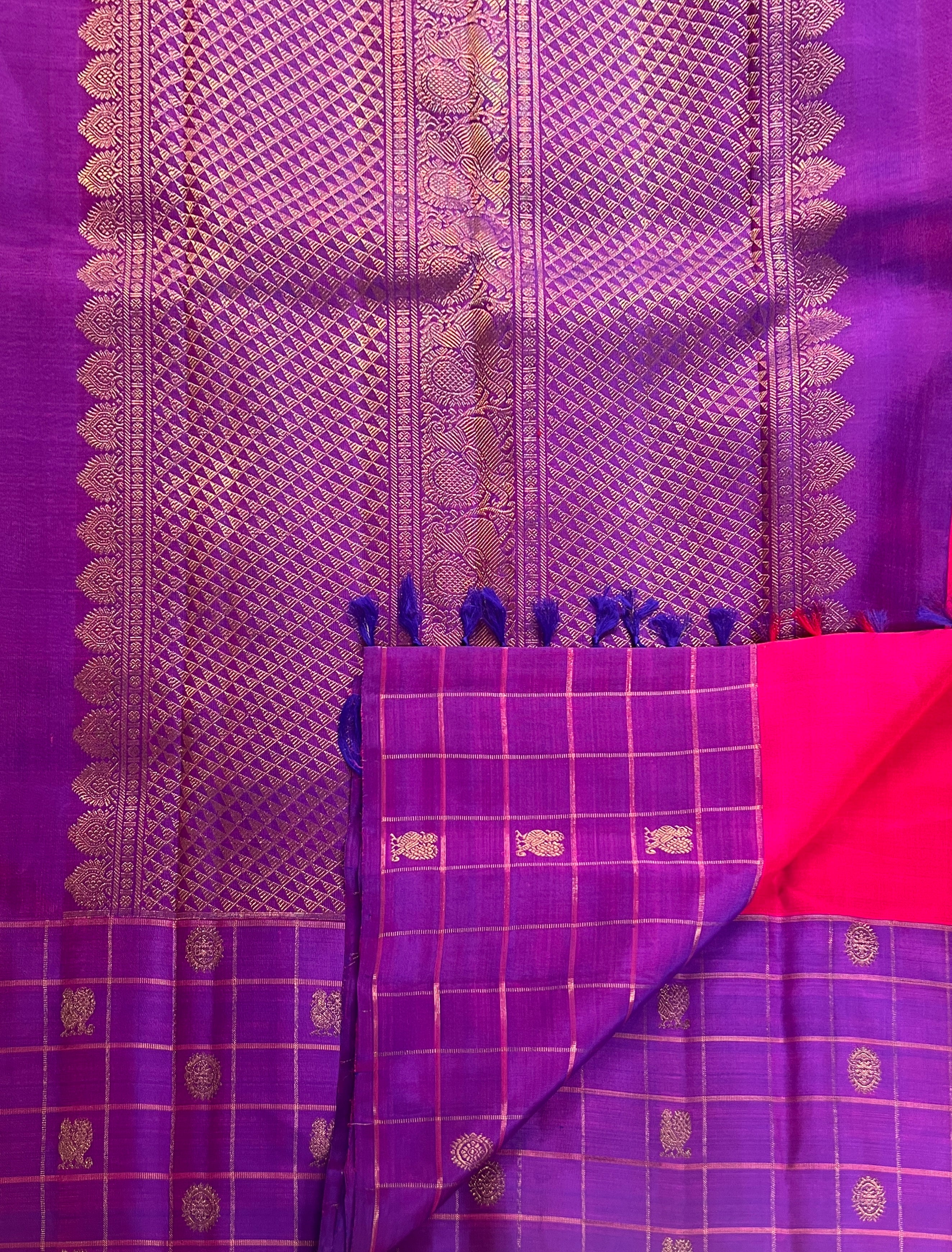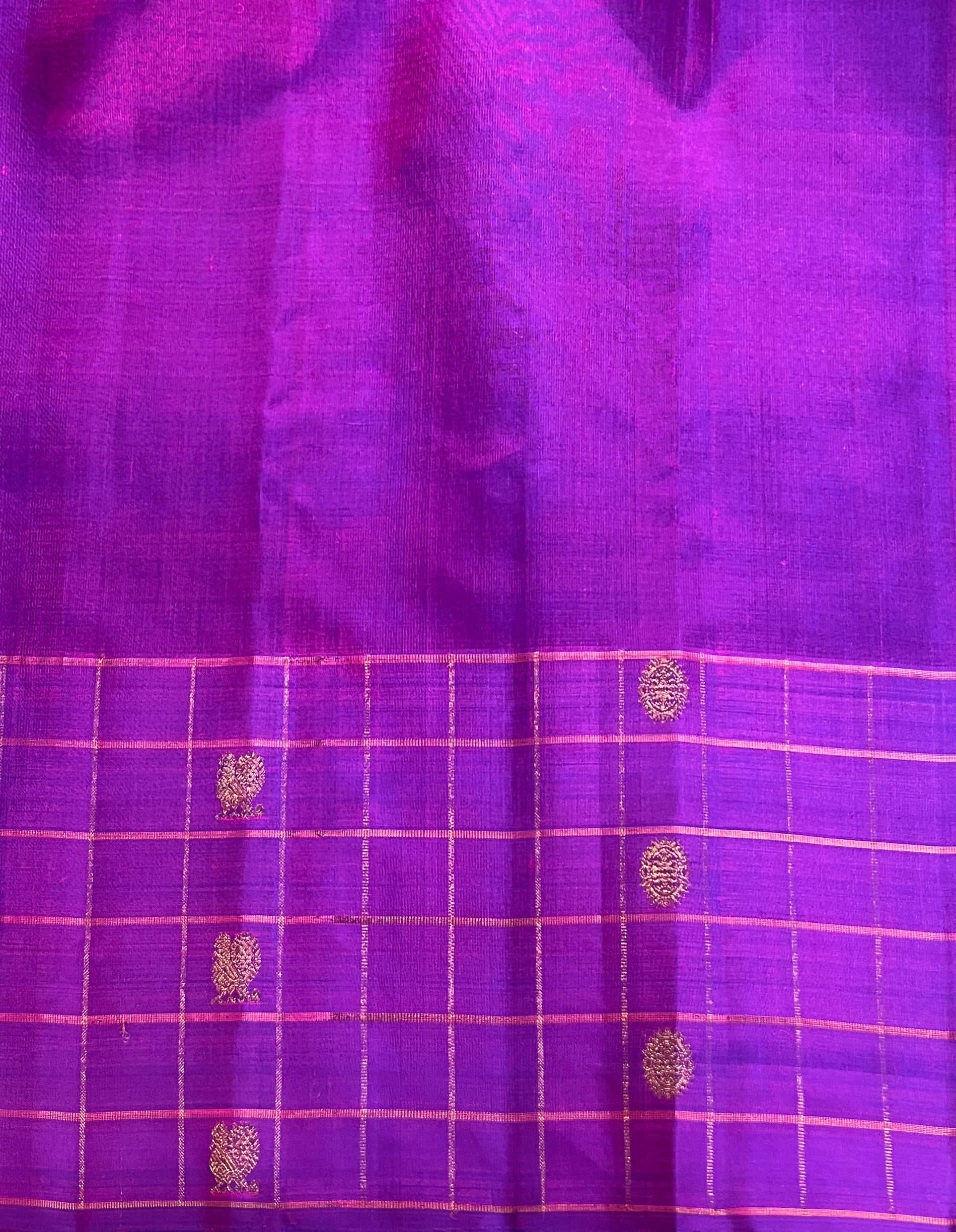 Border in purple adorned with alternating checks featuring Annam and Rudraksha motifs.