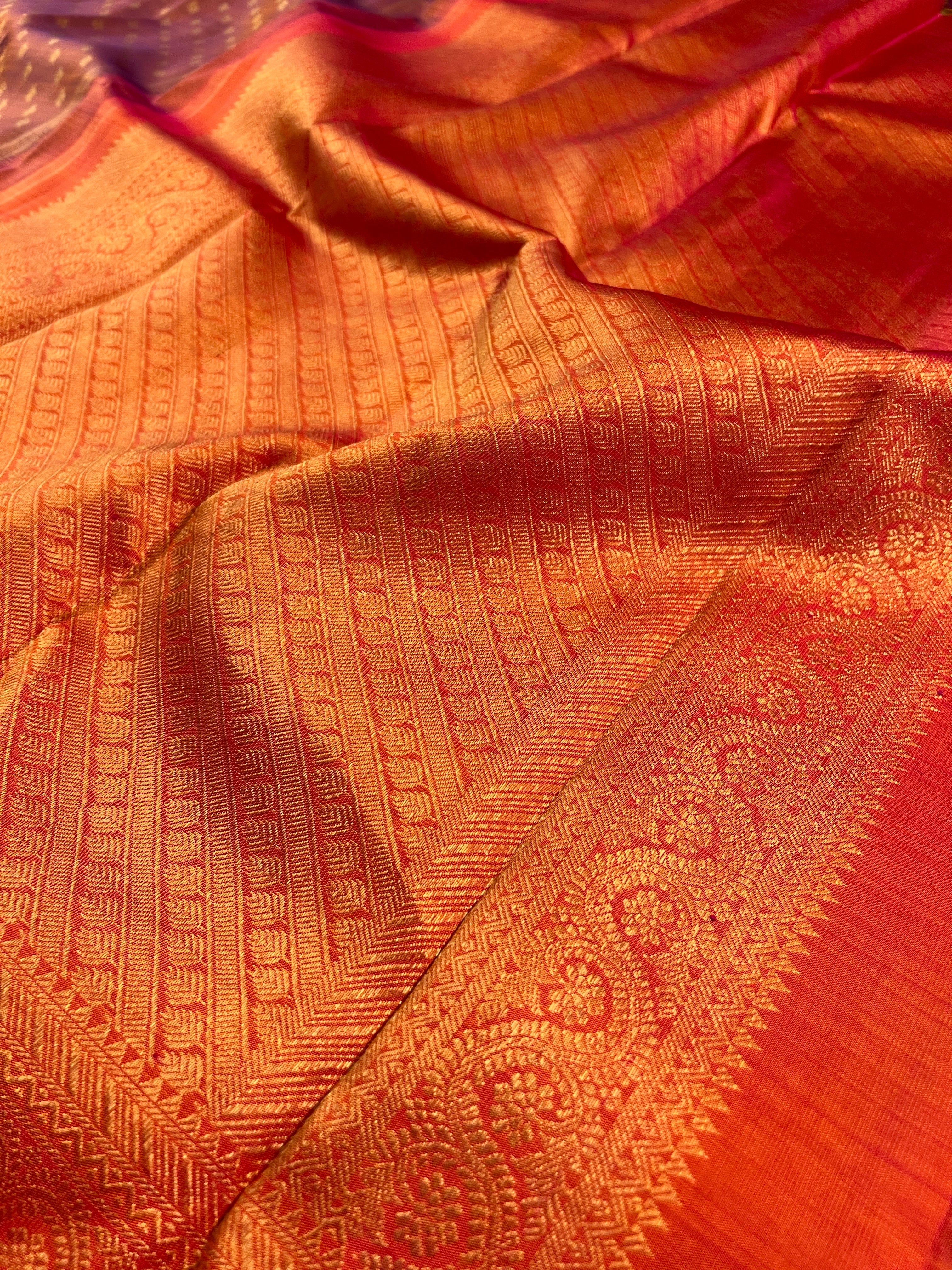 - Lustrous long border with peach-pink with Elegant zari work.