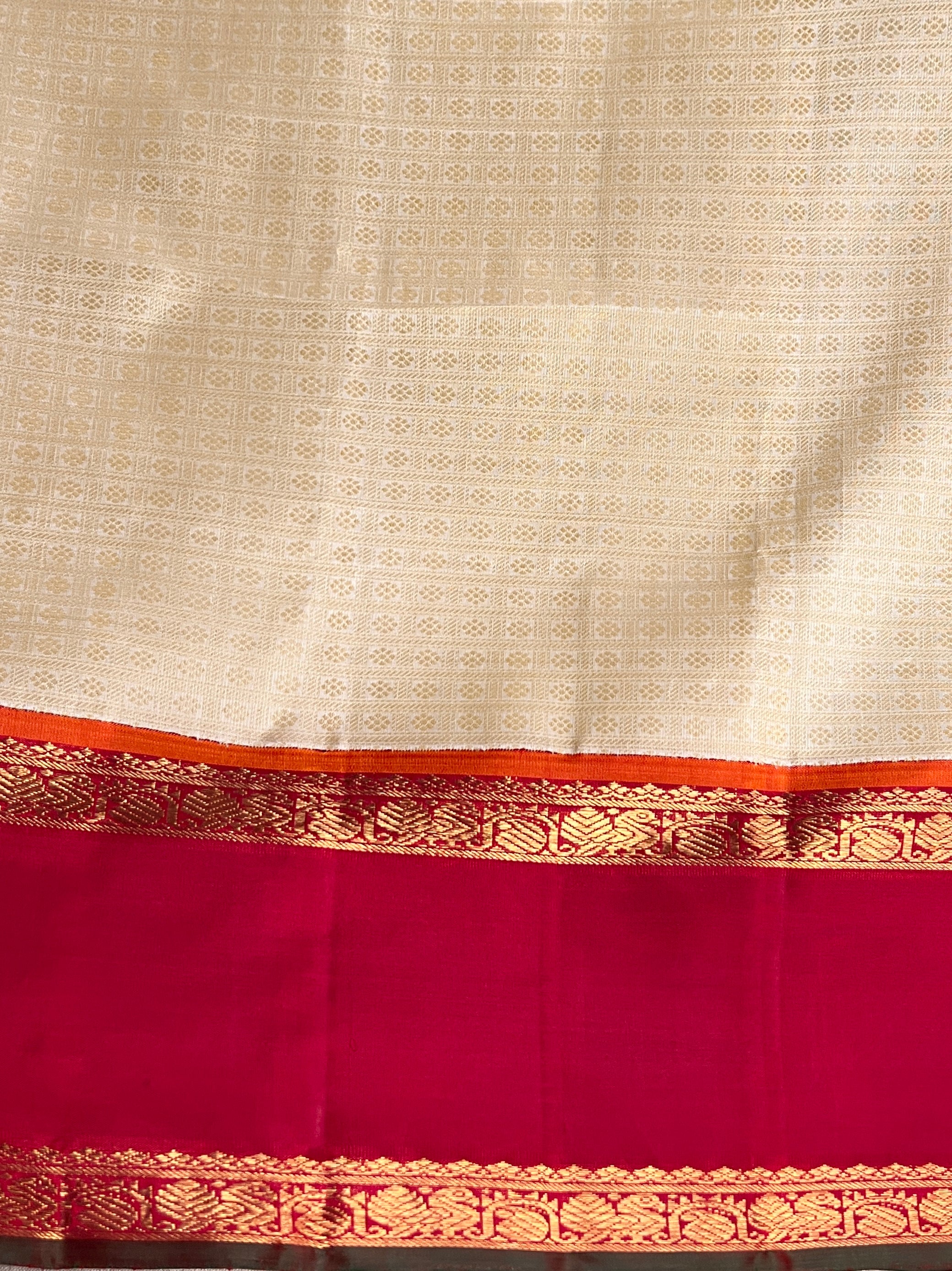 - The pallu is richly woven with classic patterns , like the thuthiripoo and paisly , in pure zari