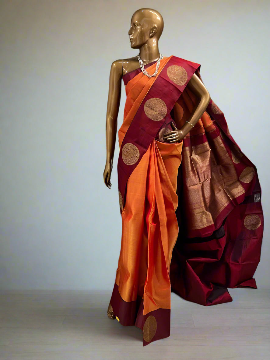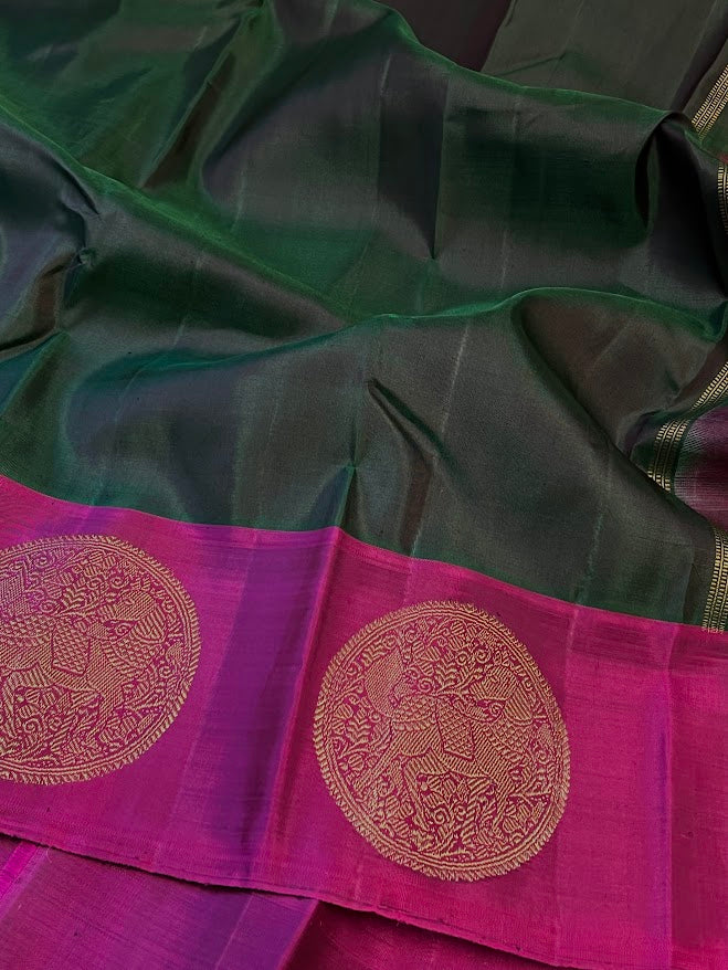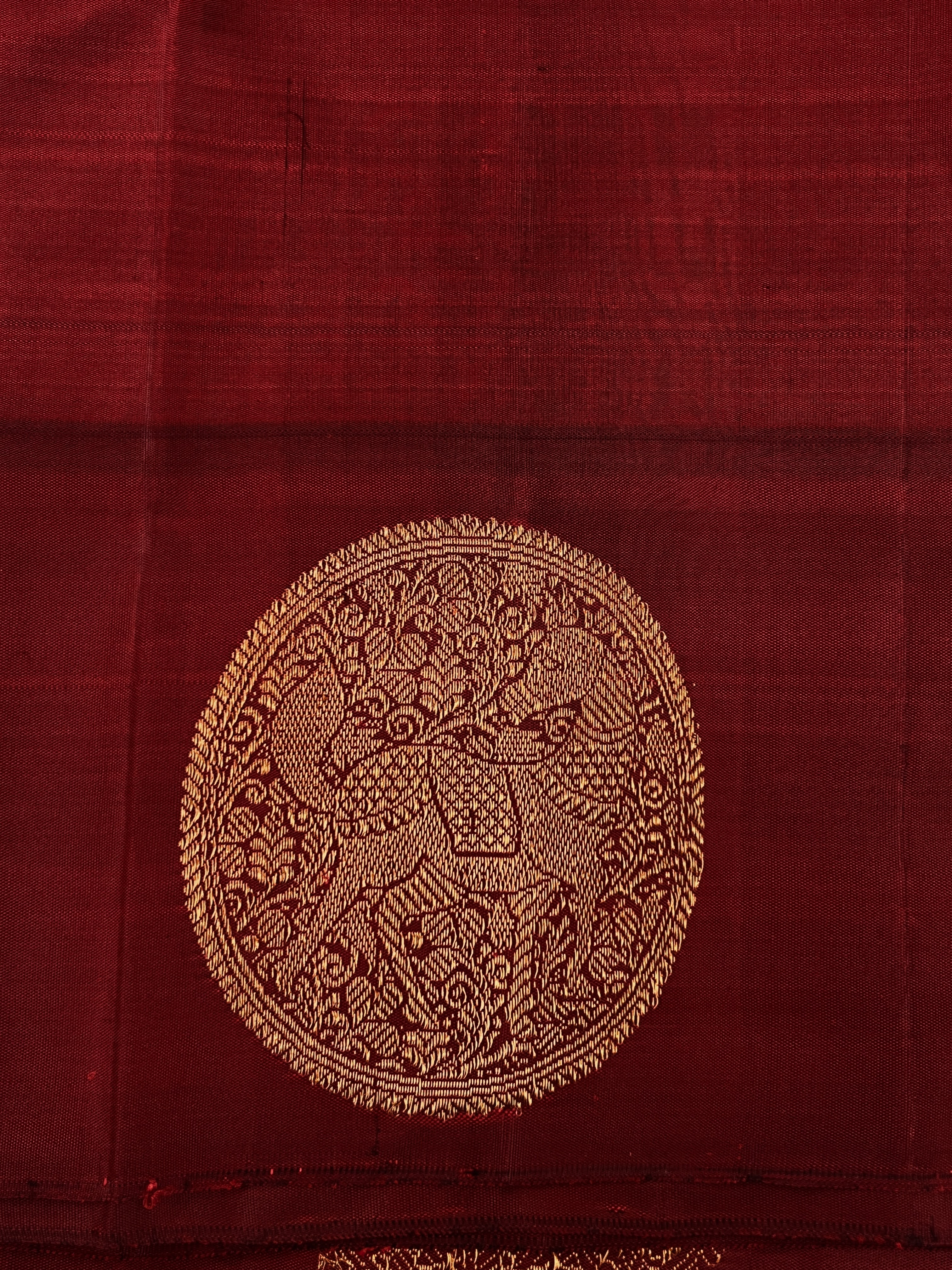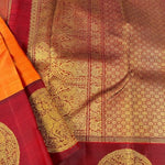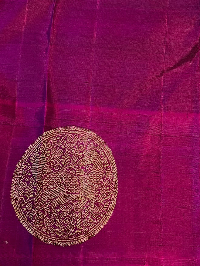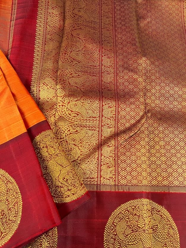 Handwoven in the finest silks, in the temple town of kanchipuram Pure zari on the saree Intricate yaazhi designs on the border, depicted in a circle Dry clean only