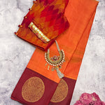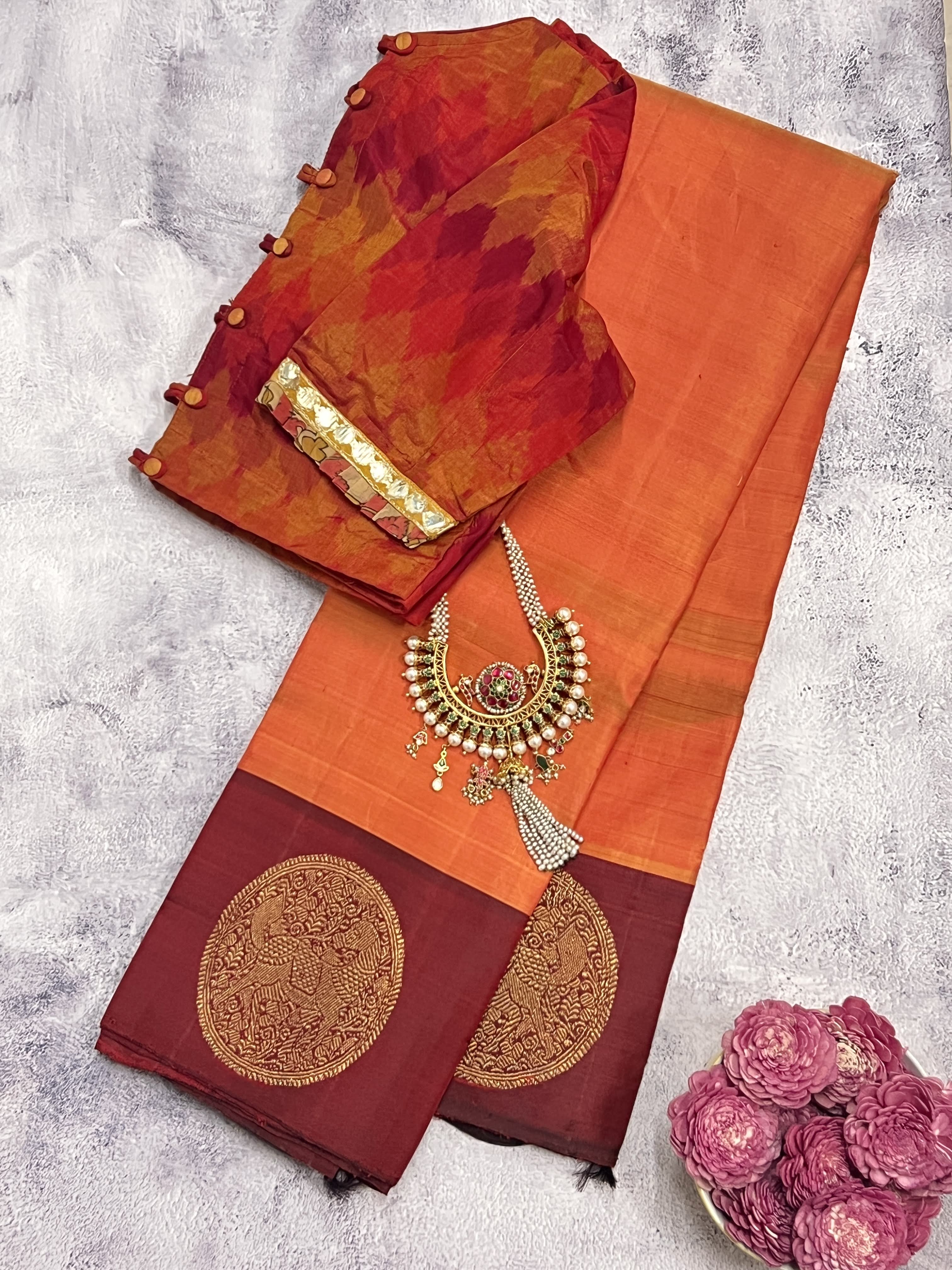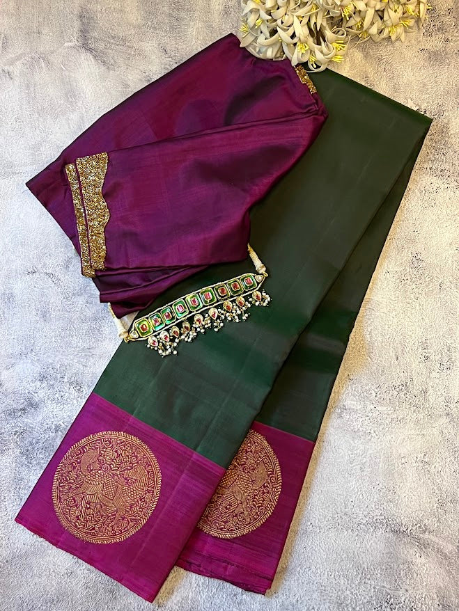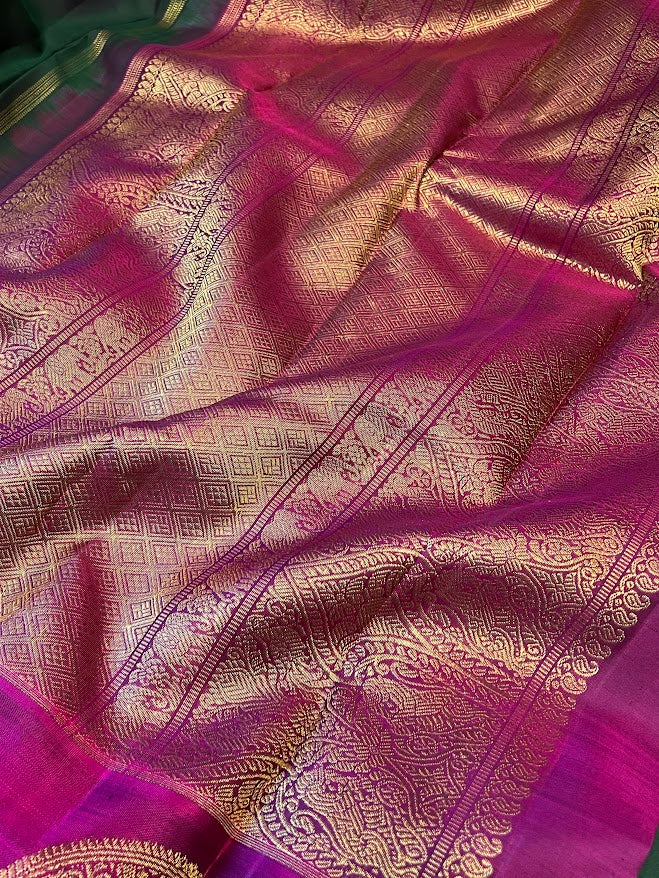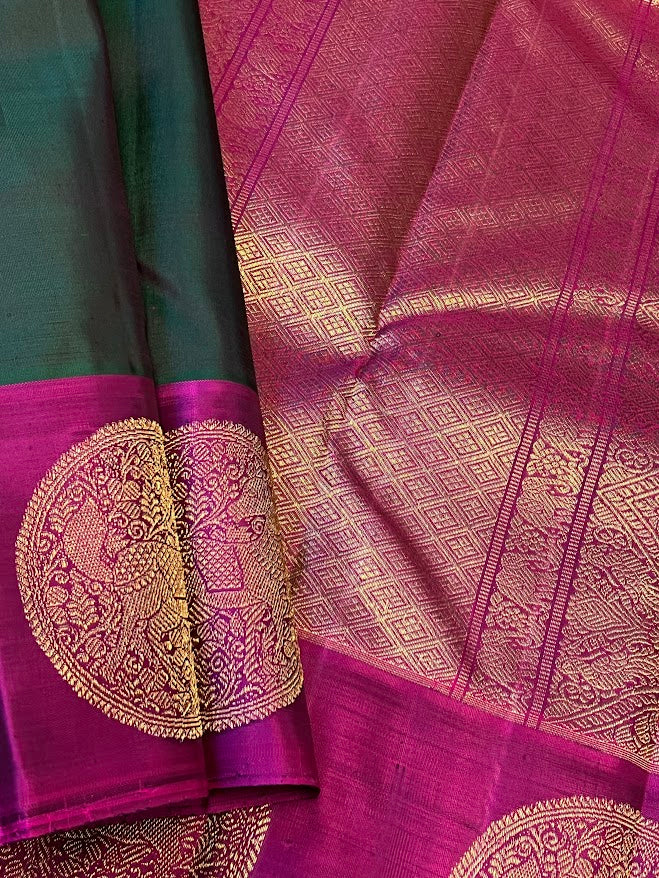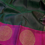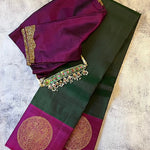 Handwoven in the finest silks, in the temple town of kanchipuram Pure zari on the saree Intricate yaazhi designs on the border, depicted in a circle Dry clean only