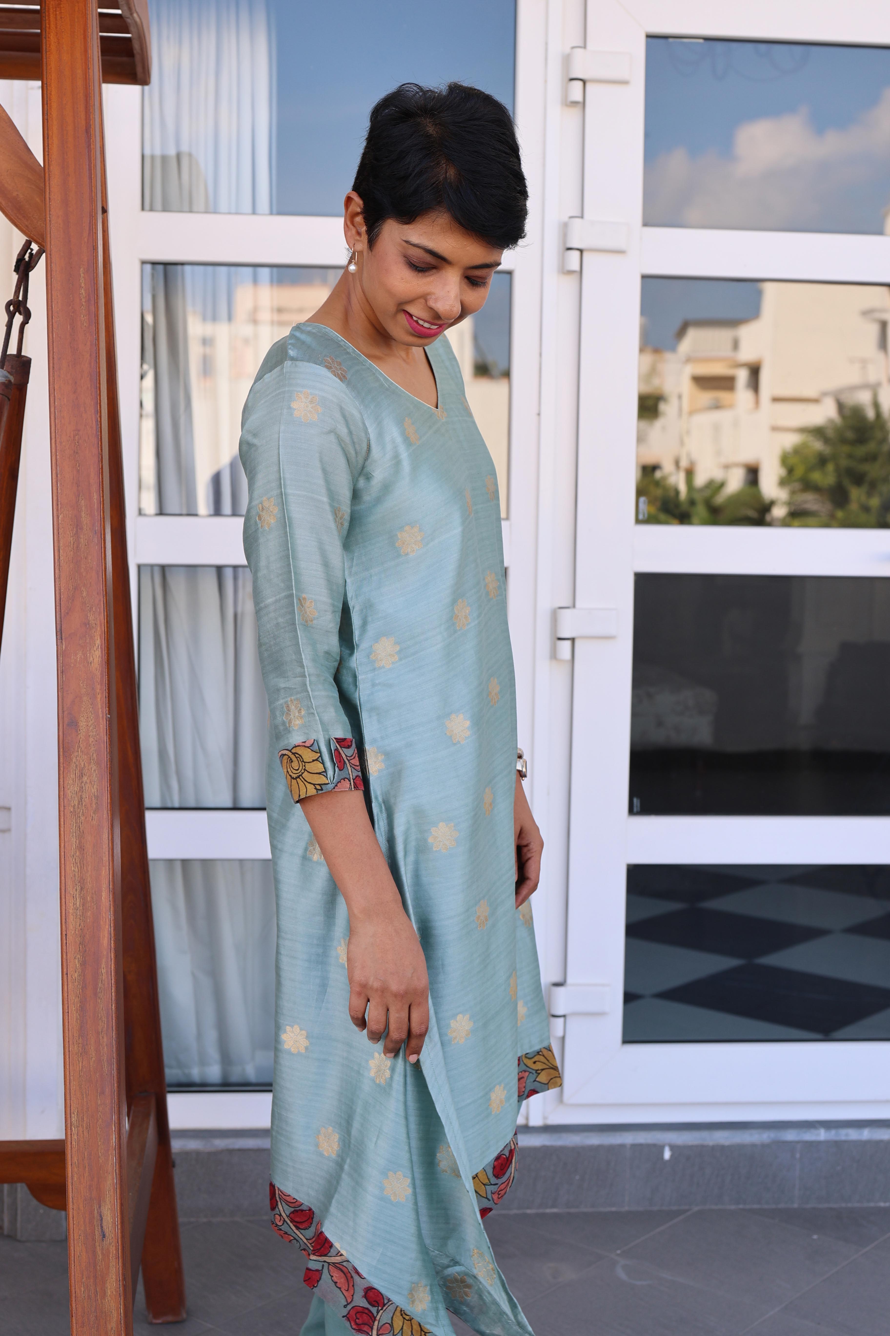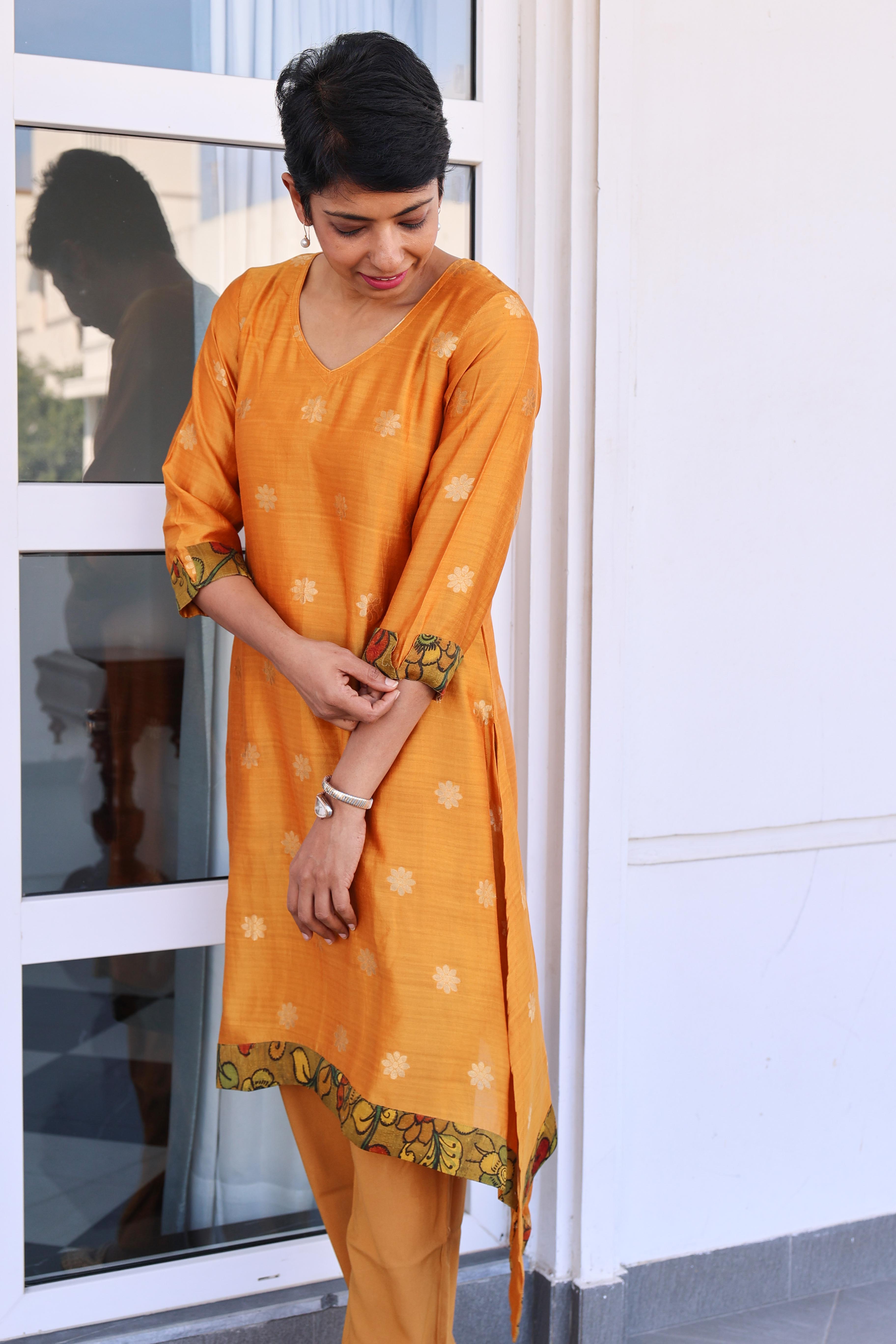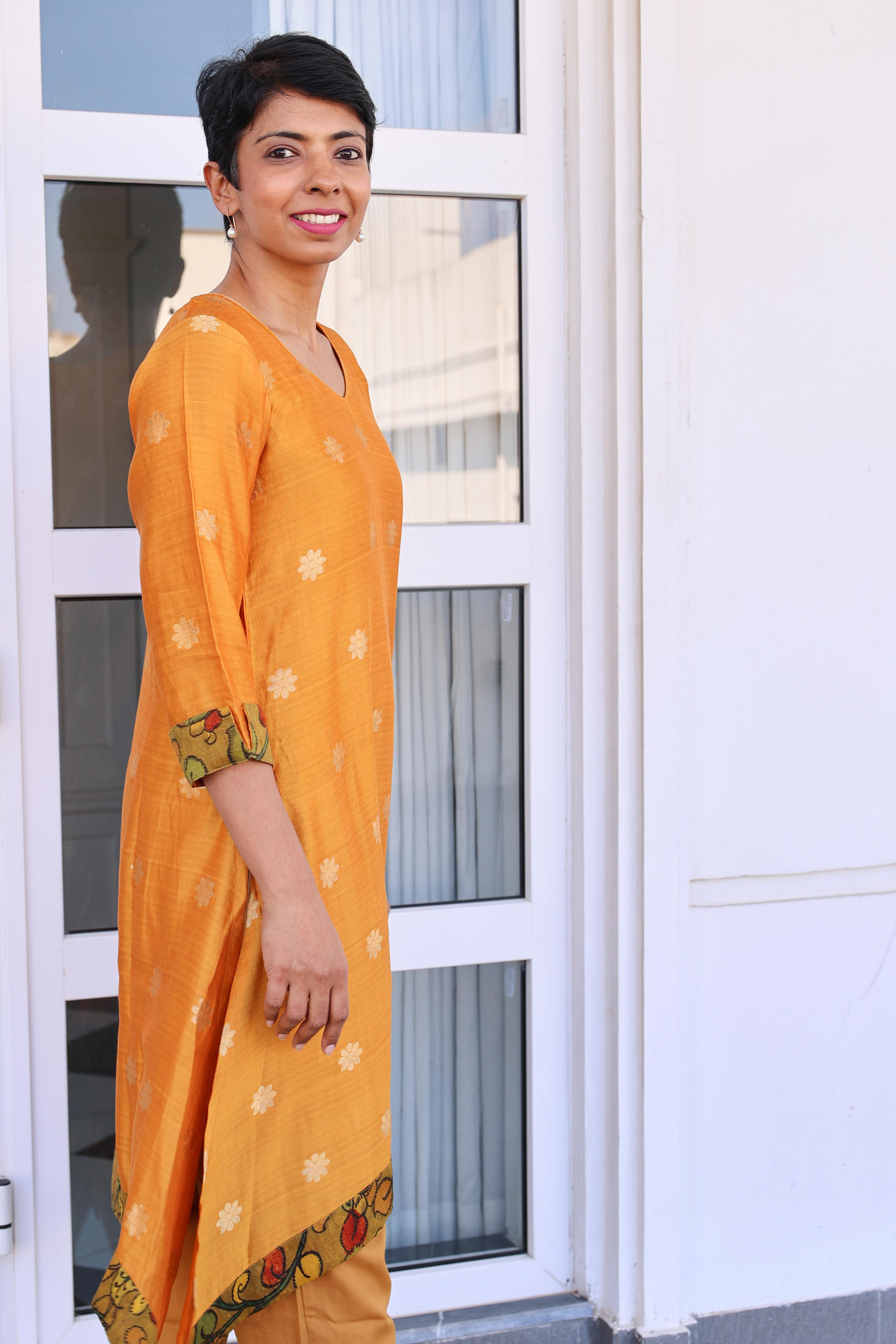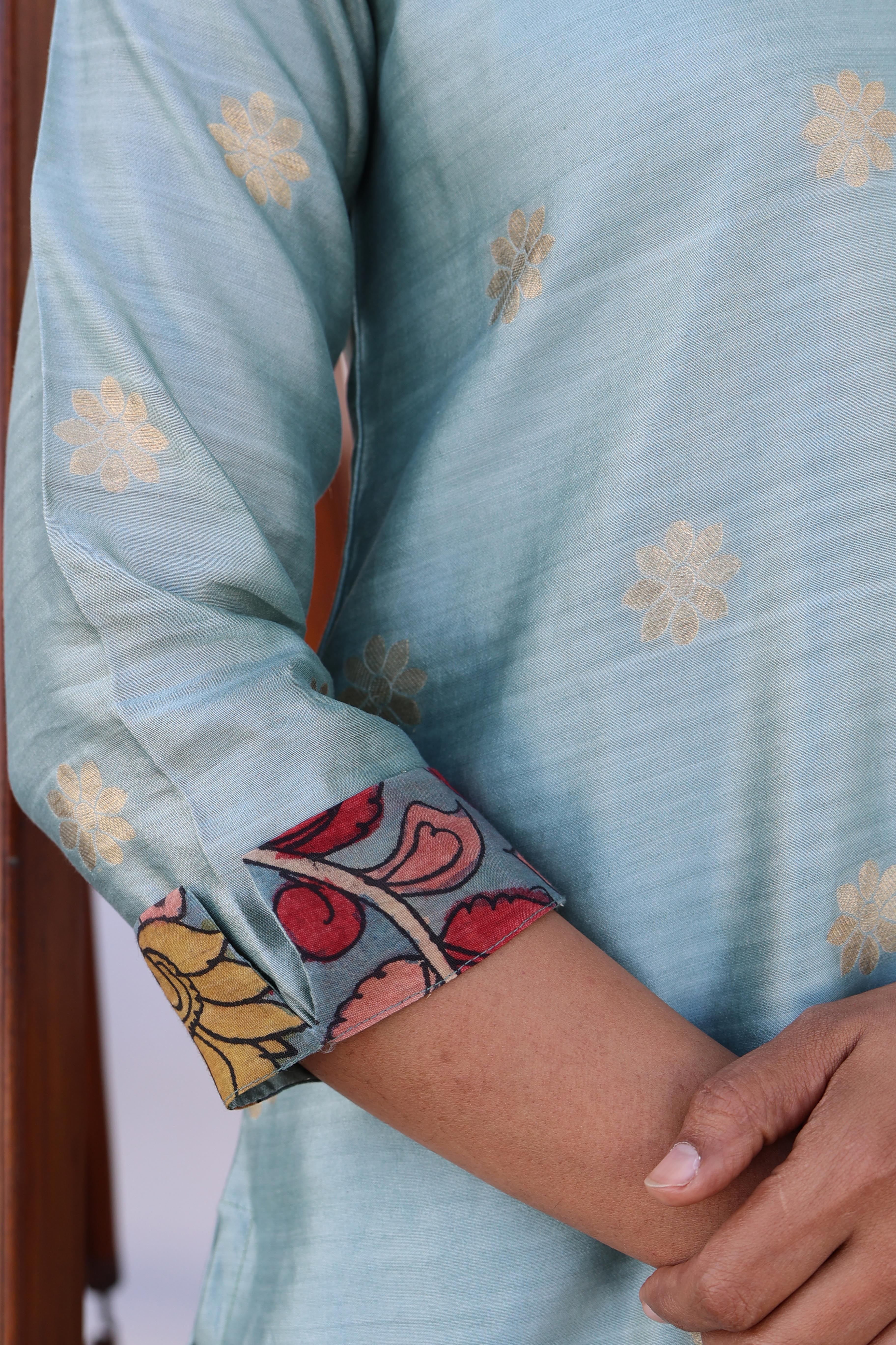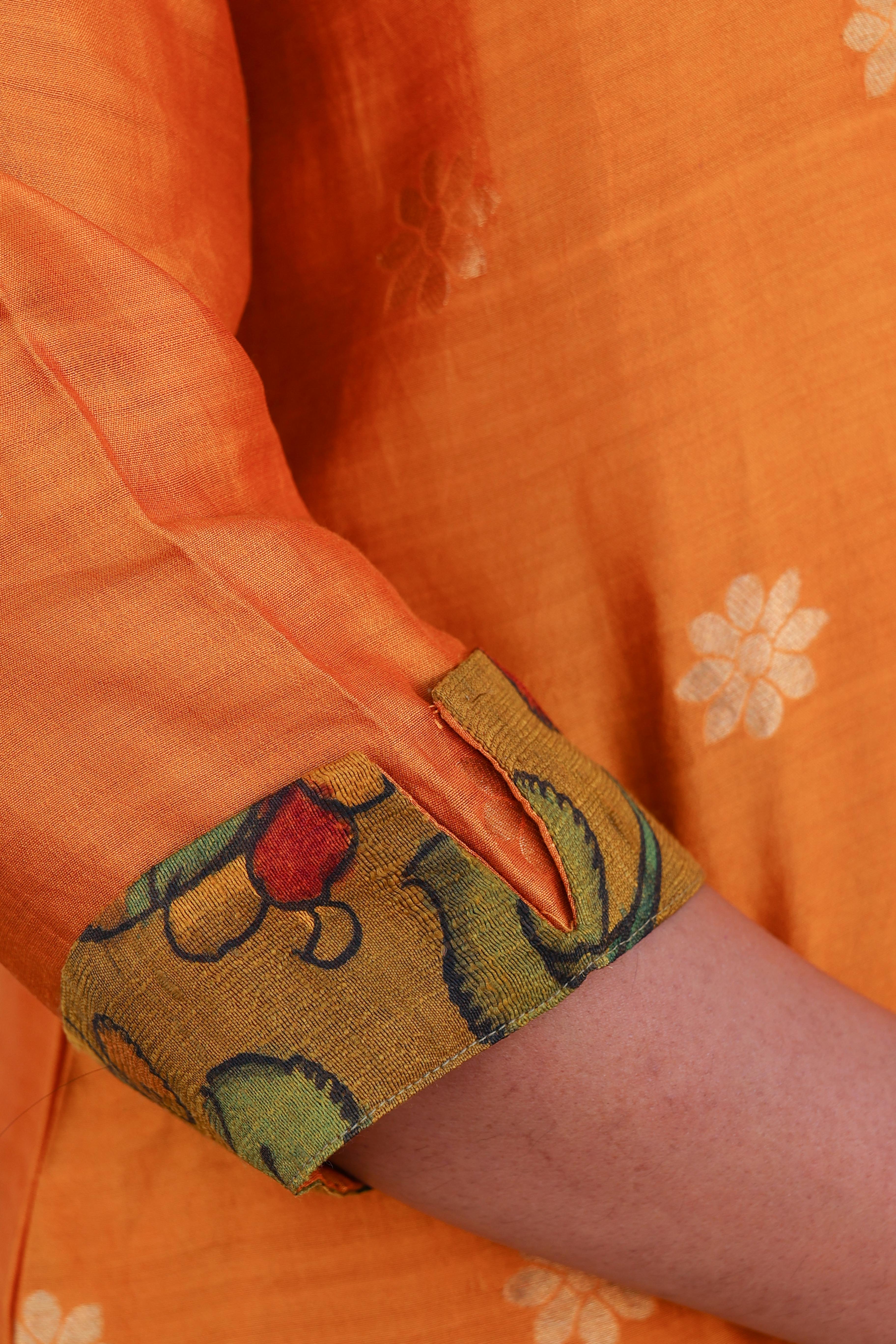 - Hand painted kalamkari detailing on the hemline and sleeves